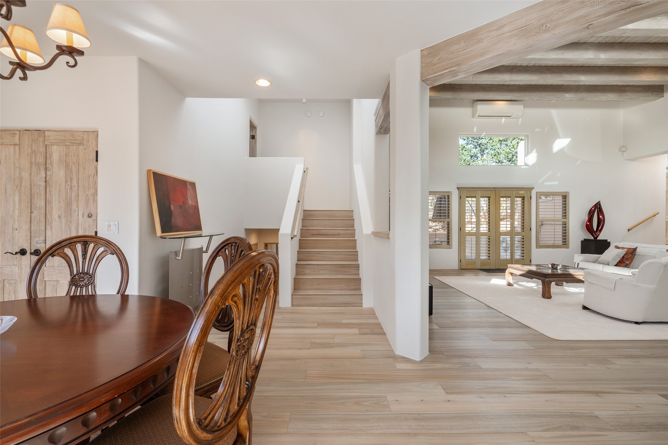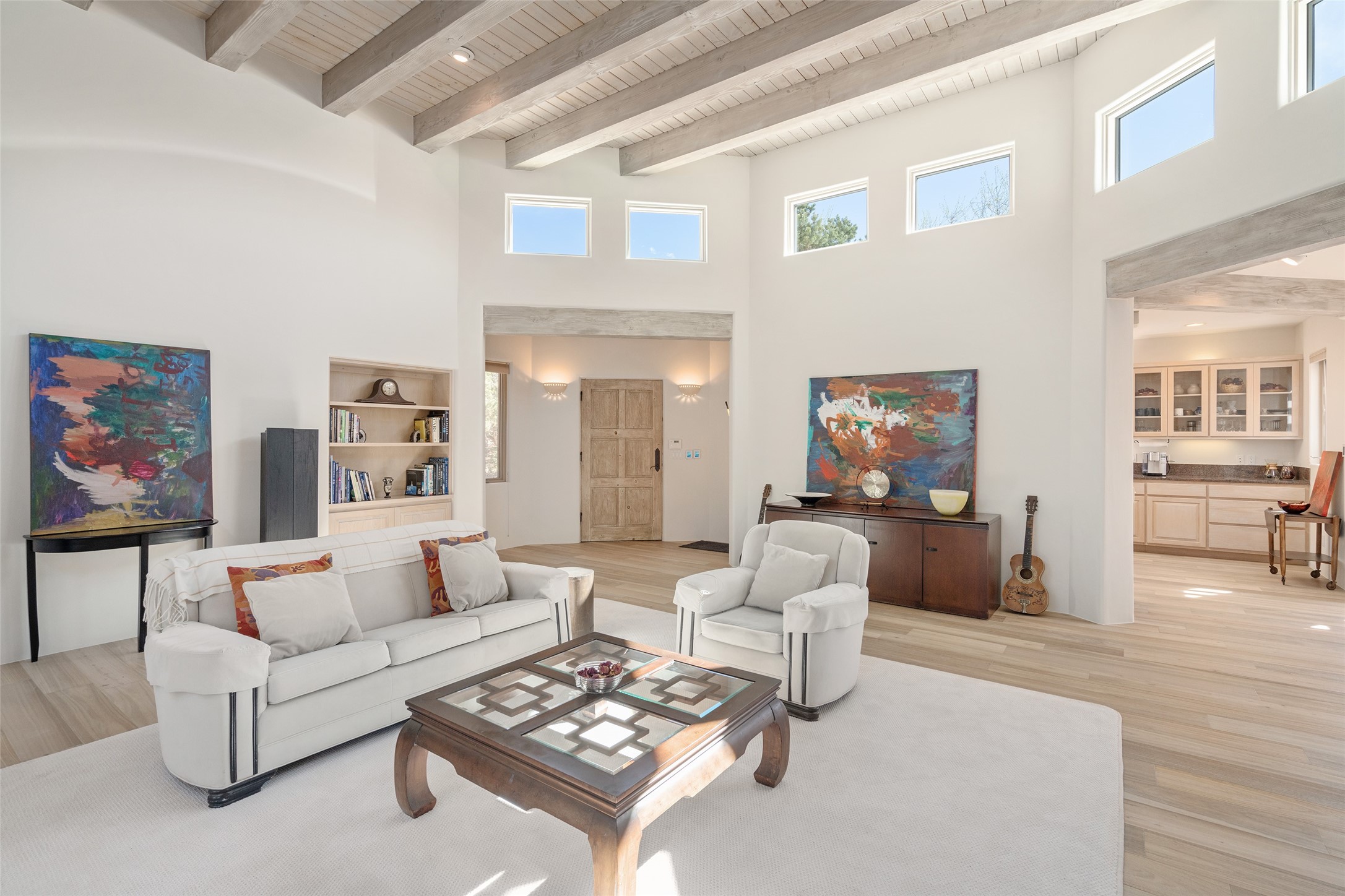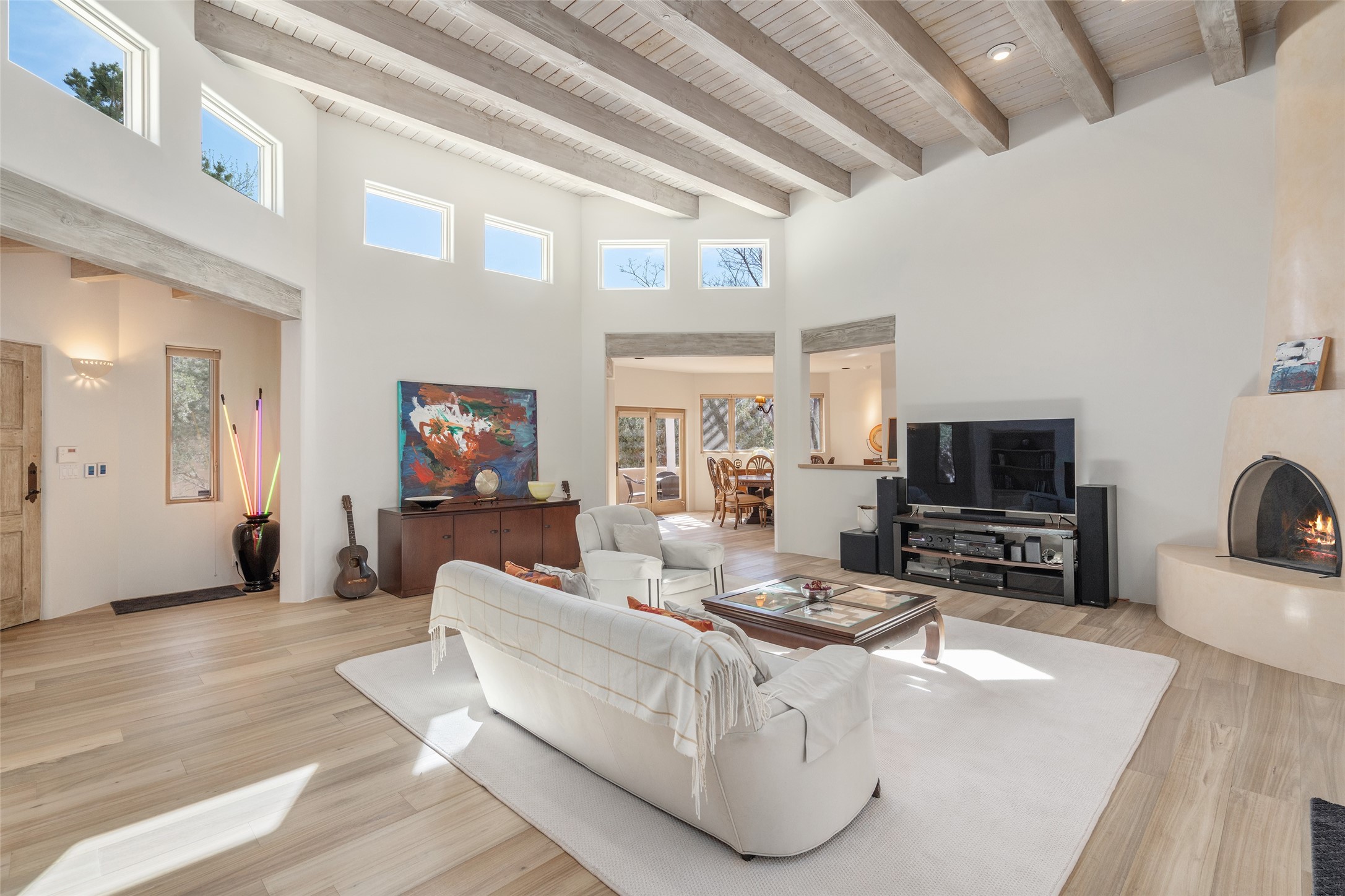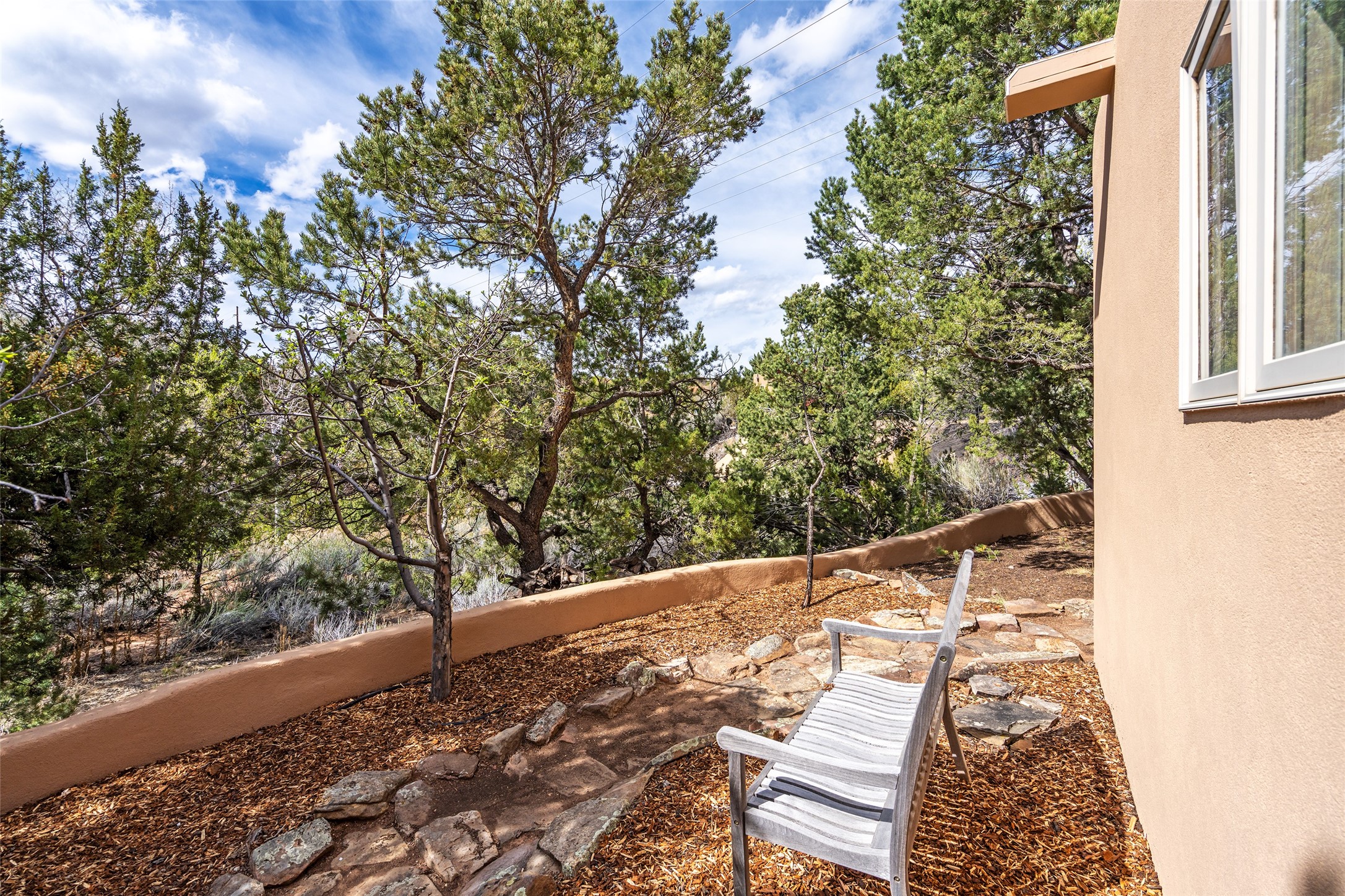 Situated on a beautifully private half-acre lot in the highly desirable Estancia Primera neighborhood, this thoughtfully updated home offers the perfect blend of Santa Fe charm and modern ease. Recent structural upgrades--including a brand new roof with transferable warranty and all-new stucco--provide peace of mind, while a newly built deck off the dining room invites morning coffee or sunset evenings beneath the trees. Inside, the home has been refreshed with brand new Engineered European Walnut wood flooring and a freshly painted interior, creating a clean, contemporary backdrop. The spacious living room is anchored by soaring ceilings with beams and a classic wood-burning kiva fireplace, offering warmth and timeless character. French doors open to a serene outdoor space, where mature trees create a sense of privacy and connection to nature. The kitchen is both functional and inviting, featuring granite countertops, stainless steel appliances, and abundant cabinetry and storage. The primary suite is a true retreat, complete with dual closets--including a cedar-lined closet--an en suite bath, and a private balcony ideal for quiet moments. On the opposite side of the home, two additional bedrooms and a guest bath provide comfortable separation for family or guests. A standout feature is the studio space just off the garage, complete with a sink--perfect for artists, hobbyists, or flexible use. Additional highlights include mini-splits throughout, new skylights and clerestory windows, plantation shutters, and a powder room. The home may also be offered essentially turnkey, with furnishings available making this an easy second home acquisition. Located just off Hyde Park Road, only minutes from the historic Plaza, Estancia Primera residents enjoy access to tennis courts, a seasonal pool, and scenic walking trails--offering a rare combination of convenience, community, and natural beauty.