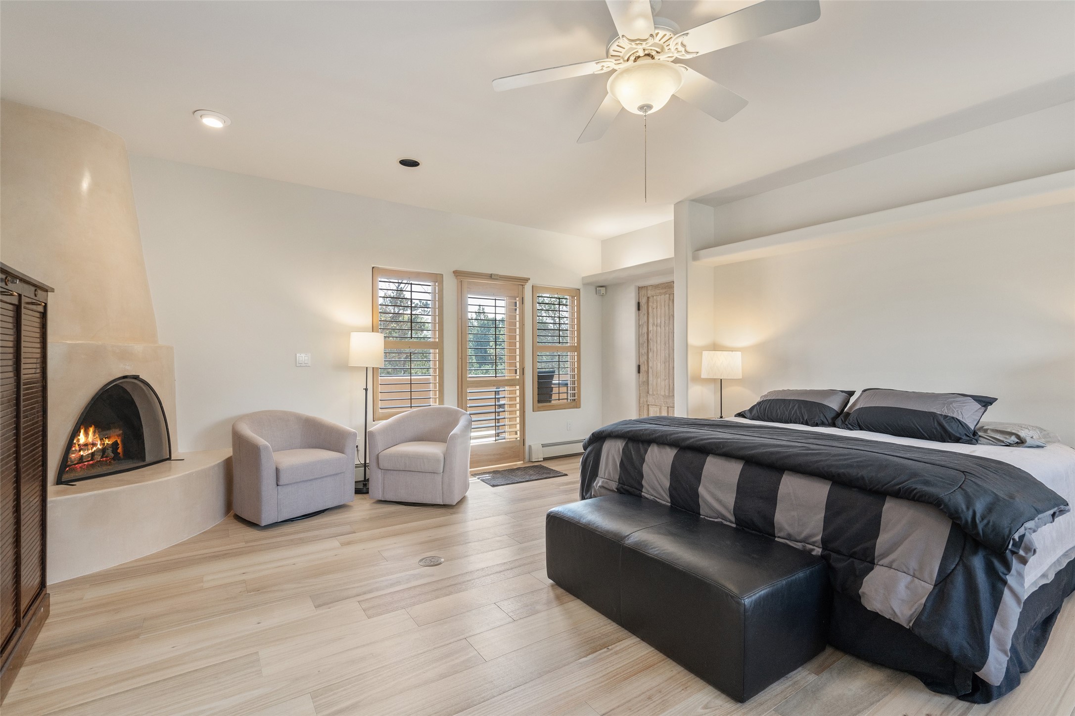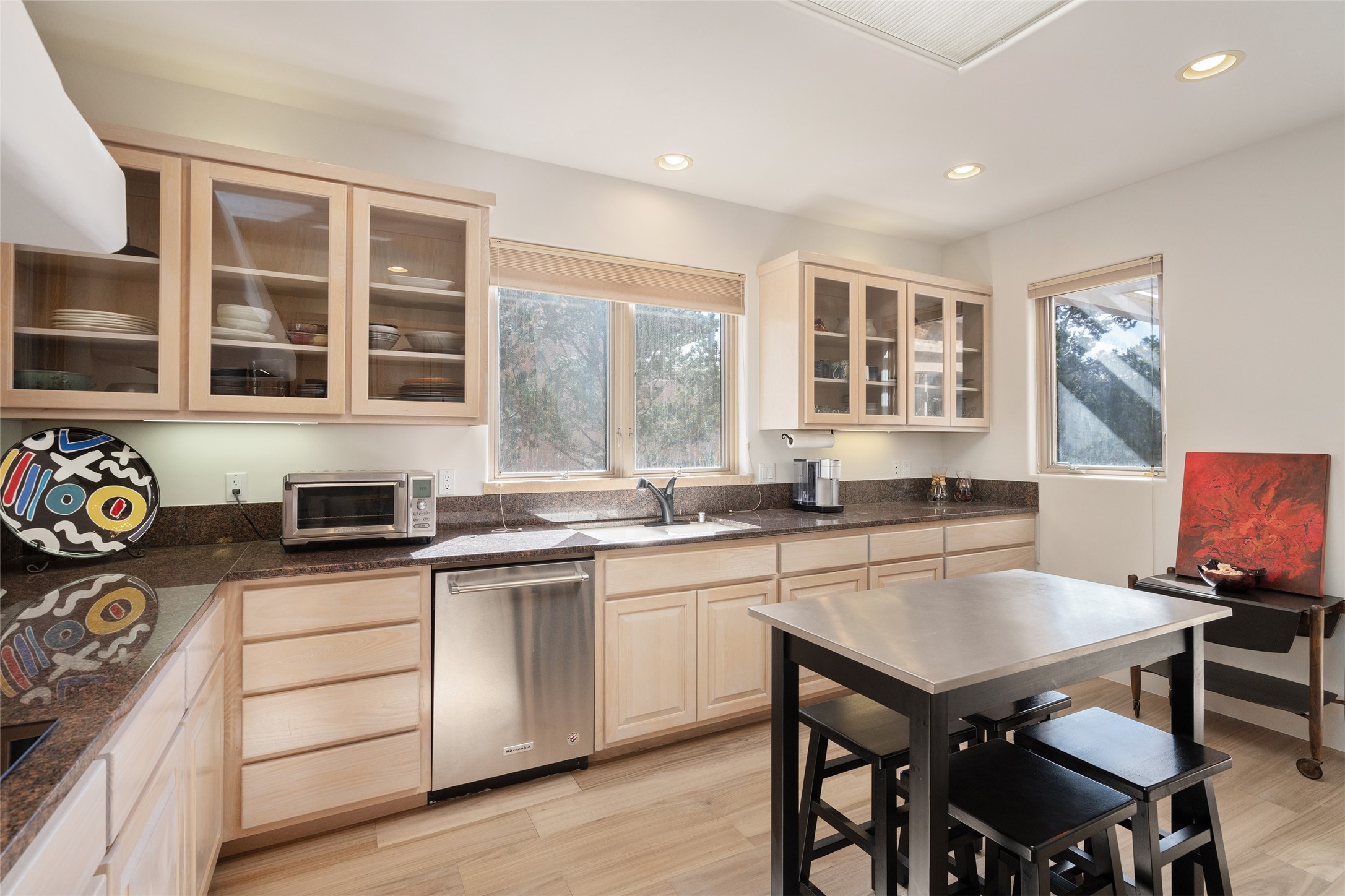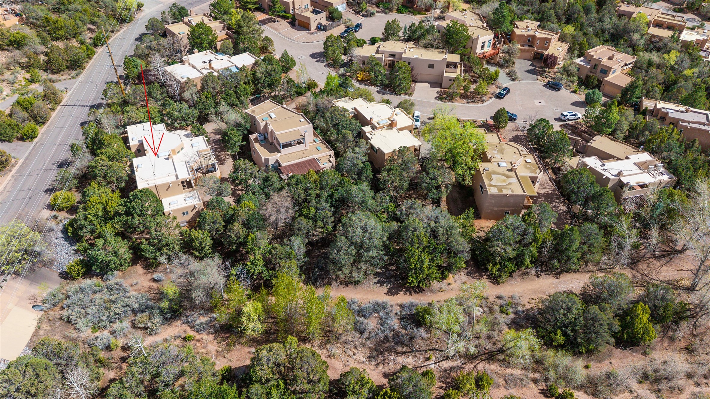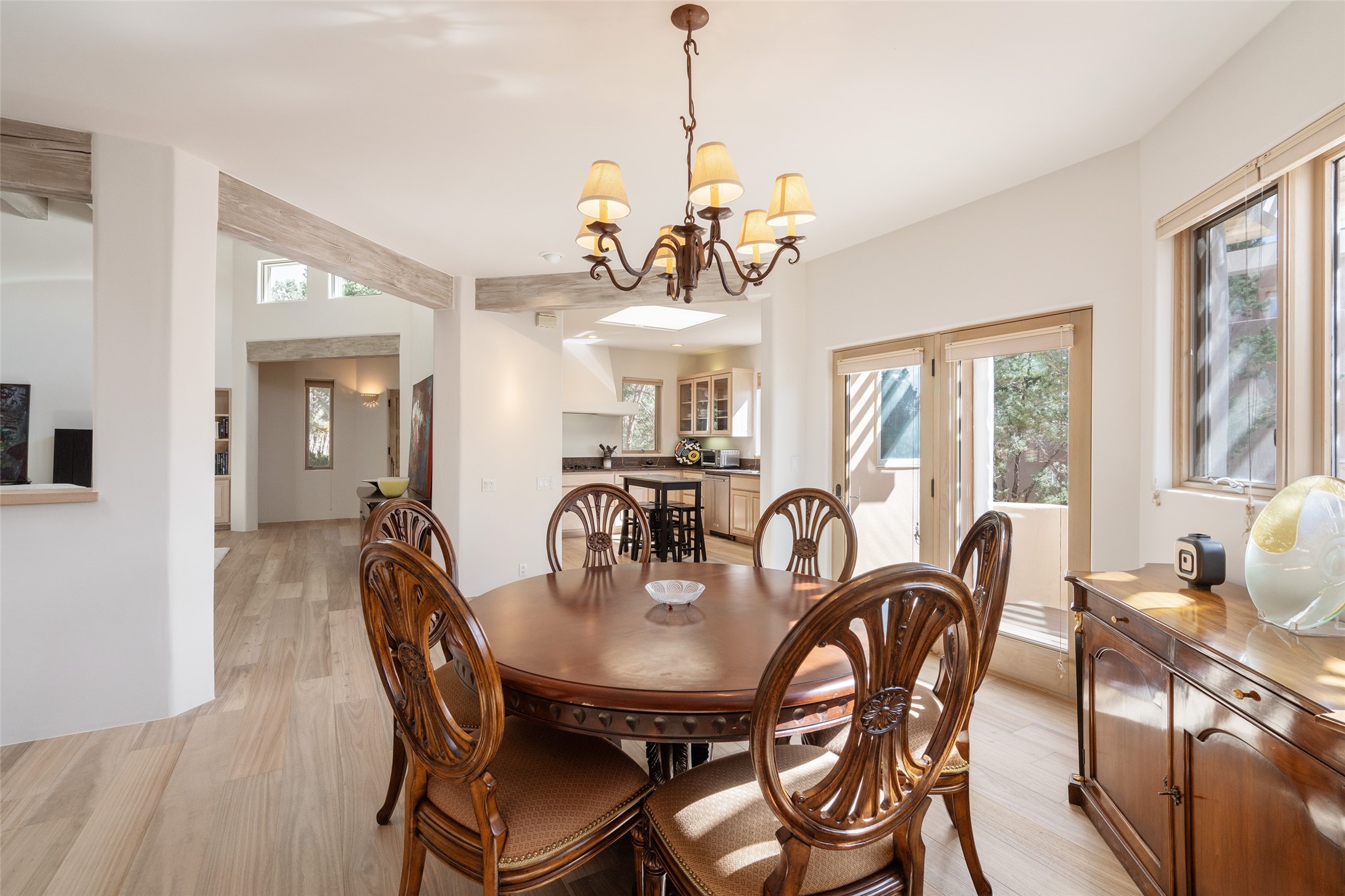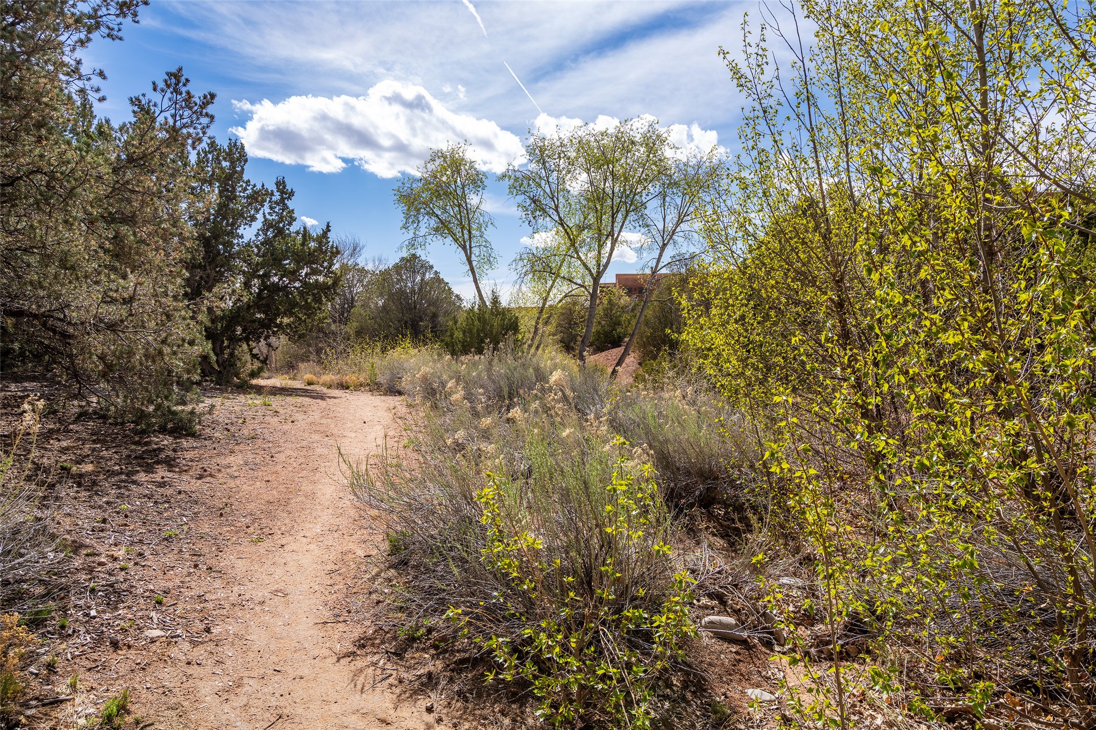 Situated on a beautifully private half-acre lot in the highly desirable Estancia Primera neighborhood, this thoughtfully updated home offers the perfect blend of Santa Fe charm and modern ease. Recent structural upgrades--including a brand new roof with transferable warranty and all-new stucco--provide peace of mind, while a newly built deck off the dining room invites morning coffee or sunset evenings beneath the trees. Inside, the home has been refreshed with brand new Engineered European Walnut wood flooring and a freshly painted interior, creating a clean, contemporary backdrop. The spacious living room is anchored by soaring ceilings with beams and a classic wood-burning kiva fireplace, offering warmth and timeless character. French doors open to a serene outdoor space, where mature trees create a sense of privacy and connection to nature. The kitchen is both functional and inviting, featuring granite countertops, stainless steel appliances, and abundant cabinetry and storage. The primary suite is a true retreat, complete with dual closets--including a cedar-lined closet--an en suite bath, and a private balcony ideal for quiet moments. On the opposite side of the home, two additional bedrooms and a guest bath provide comfortable separation for family or guests. A standout feature is the studio space just off the garage, complete with a sink--perfect for artists, hobbyists, or flexible use. Additional highlights include mini-splits throughout, new skylights and clerestory windows, plantation shutters, and a powder room. The home may also be offered essentially turnkey, with furnishings available making this an easy second home acquisition. Located just off Hyde Park Road, only minutes from the historic Plaza, Estancia Primera residents enjoy access to tennis courts, a seasonal pool, and scenic walking trails--offering a rare combination of convenience, community, and natural beauty.
