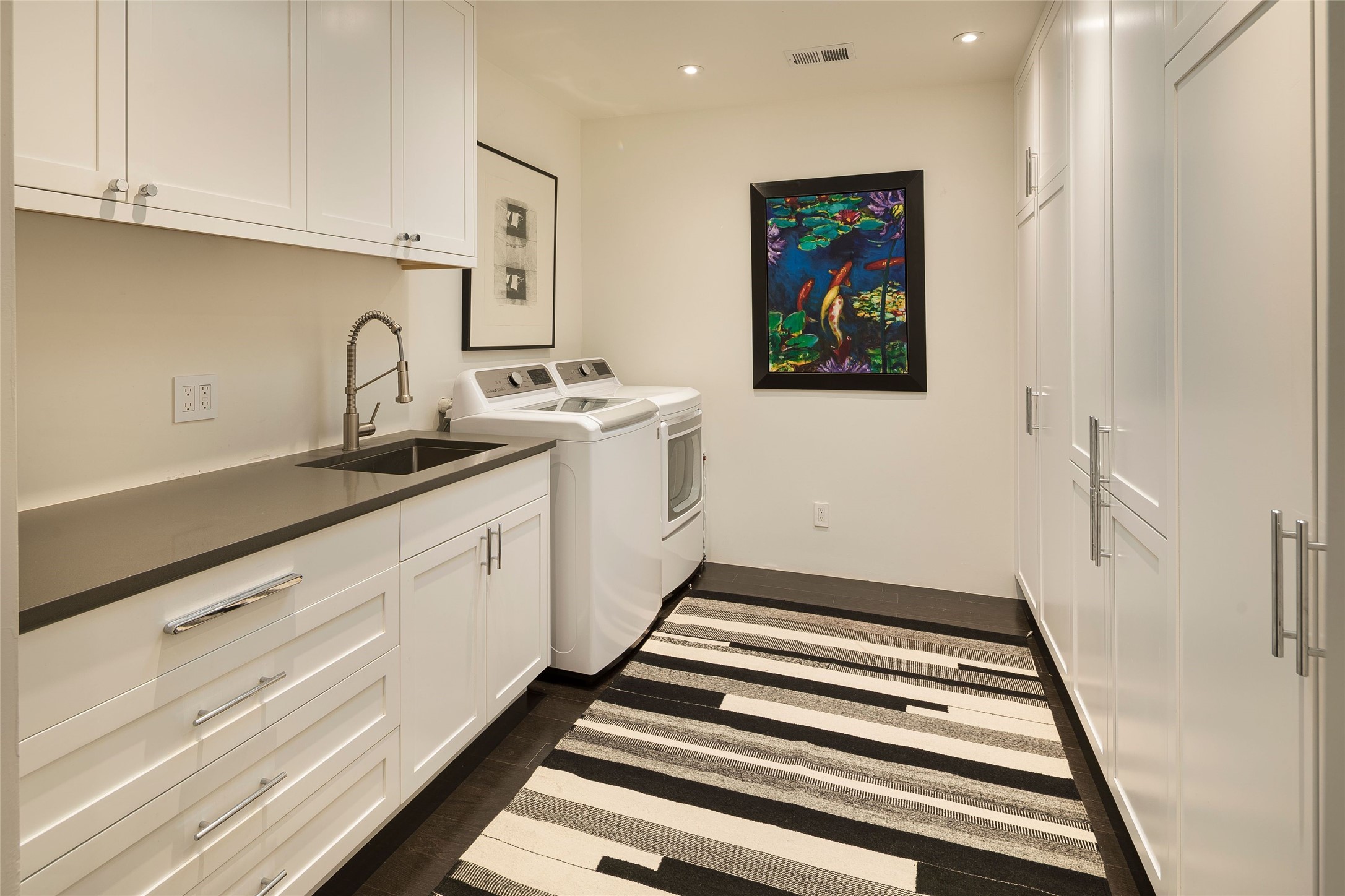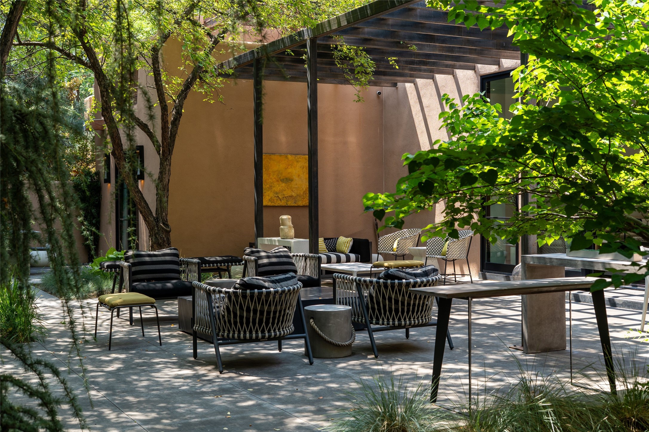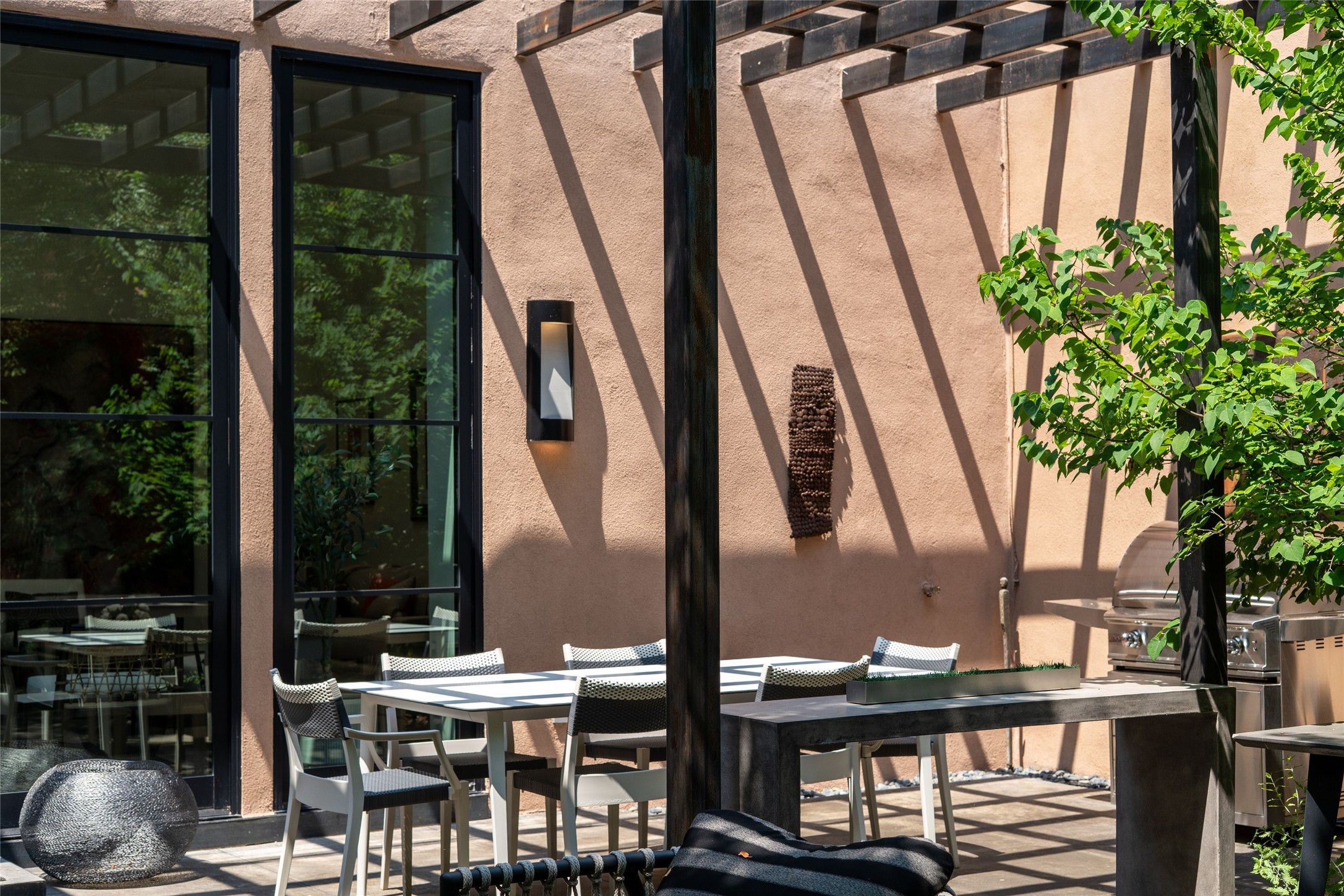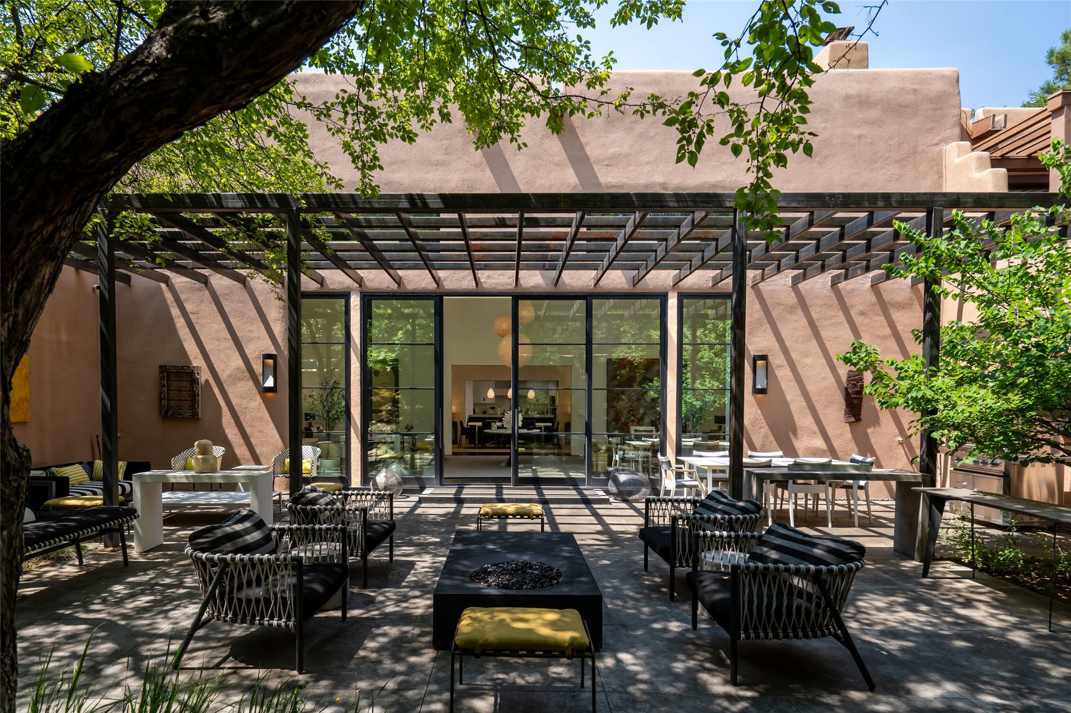 Exquisite Los Miradores 4-bedroom, 4.5-bath condo, where modern elegance meets artistic finesse. This stunning residence was reimagined and remodeled in 2020-2021, showcasing a balanced blend of wood, steel, glass, and stone that appeals to the most discerning tastes. As you enter, you'll be greeted by an impressive entry gallery with a clerestory window that bathes the space in natural light. The formal dining room, complemented by a wet bar, invites you to host dinner parties and soirees. Two-story grand living room includes sliding glass doors flanked by sidelights connecting to an entertainment patio complete with a gas fire pit and a contemporary steel pergola, ideal for alfresco dining under the New Mexican skies. Deluxe gourmet kitchen, featuring custom cabinetry, elegant quartz countertops, and top-of-the-line appliances, including a Wolf six-burner cooktop with griddle, Wolf wall oven, and Sub-Zero side-by-side refrigerator/freezer. Expansive center island and large breakfast area make this kitchen a culinary gathering area. The luxurious owner's suite, designed as a private sanctuary with a spa-like bath promises relaxation and tranquility. A guest suite is conveniently located on the ground floor, alongside a dedicated office and media room. Upper level, with two additional suites, each with en-suite baths, provide privacy for family or guests. High-walled patios and beautifully landscaped gardens. An oversized two-car garage ensures ample space for your vehicles and storage needs. The gated community of Los Miradores offers many amenities, including a seasonal pool, workout facility, tennis court and security patrol.