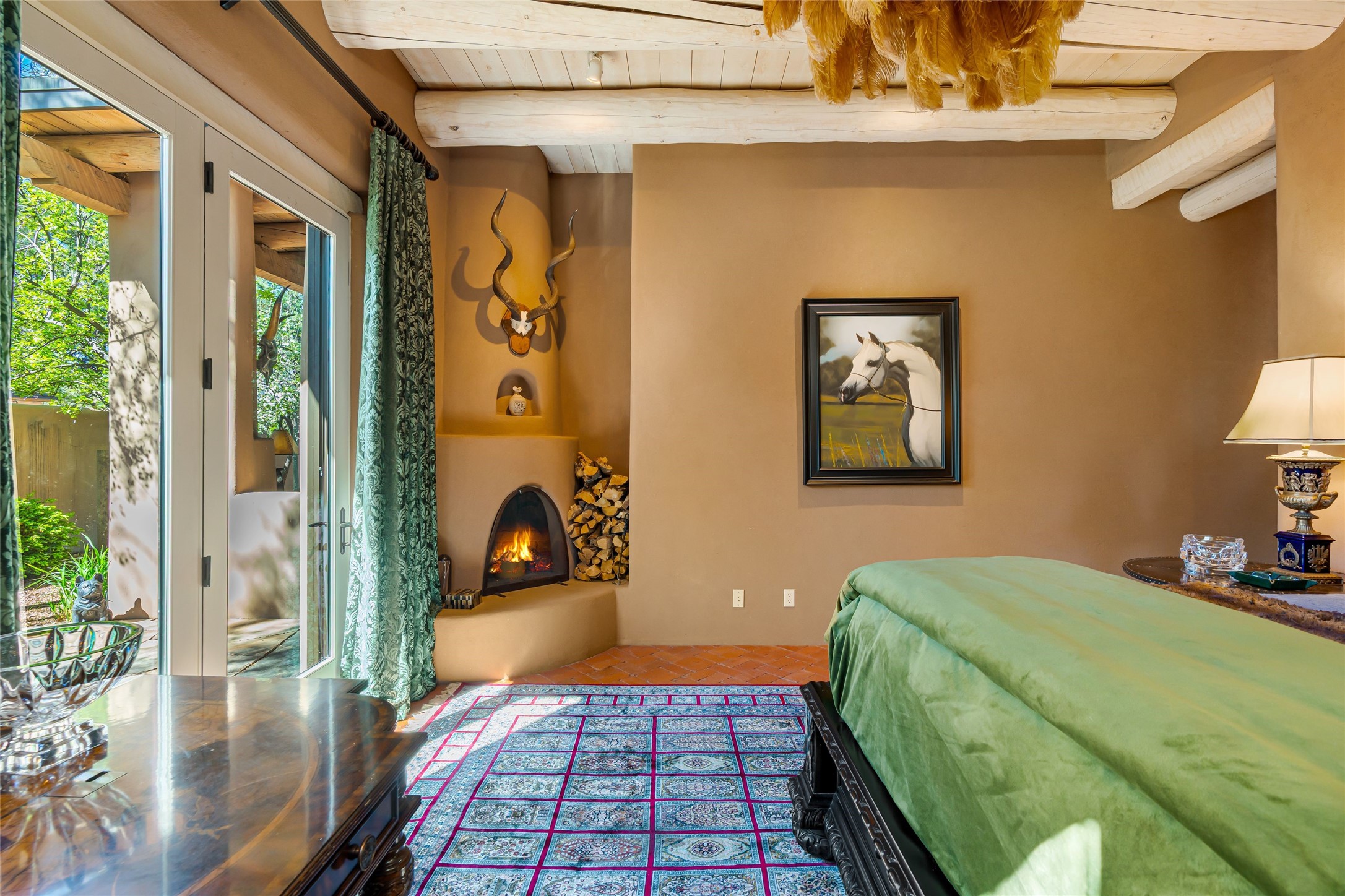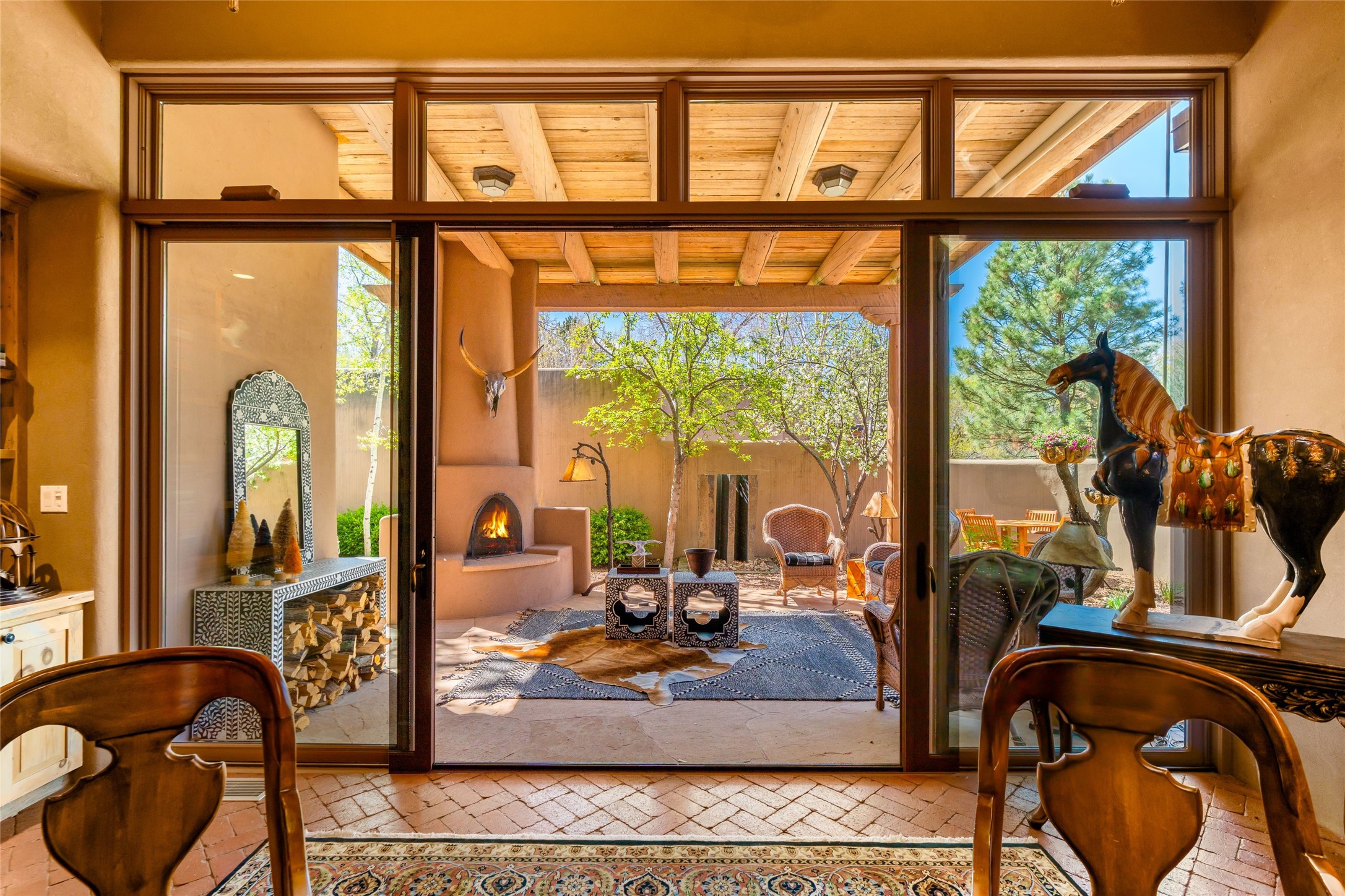 Reminiscent of Old World charm, this Eastside Santa Fe property is situated in a private, gated and quiet location close to Canyon Road, Patrick Smith Park, and the Camino Pequeno river walk. Comprising 2,133 sq.ft., a single-story adobe and frame constructed home was designed by John Midyette and built by Philip Coombs in 2005, and is adorned with brick floors, high ceilings, antique beams, hand-carved doors, and traditional plastered walls. Completely surrounded by seasonal landscaping, an outdoor water feature, a bubbling hot tub and privacy walls, the outdoors becomes an additionalsumptuous living and entertaining area. The primary suite has a wood burning kiva fireplace with a large spa-like bathroom mirroring the greenery from the outdoors. A secondary bedroom suite is separated from the primary suite with its own private outdoor access. A third bedroom is currently being used as a family room. A powder room is near the living area. The open-concept kitchen/living/formal dining area has a wood burning fireplace and is flooded in ambient natural light with a wall of glass tempting one to step into the deep covered portal flanked by another kiva fireplace. The cook'skitchen is accented by white limestone countertops, light custom cabinets and upscale appliances. There is a direct access 2-car garage with additional parking in front of the garage. New forced air heating/AC, tankless water heater, whole home water filtration, and smart water monitor with auto shut-off valve systems are in place. This lovingly maintained property is a timeless reflection of one looking to experience a refined and sophisticated lifestyle.