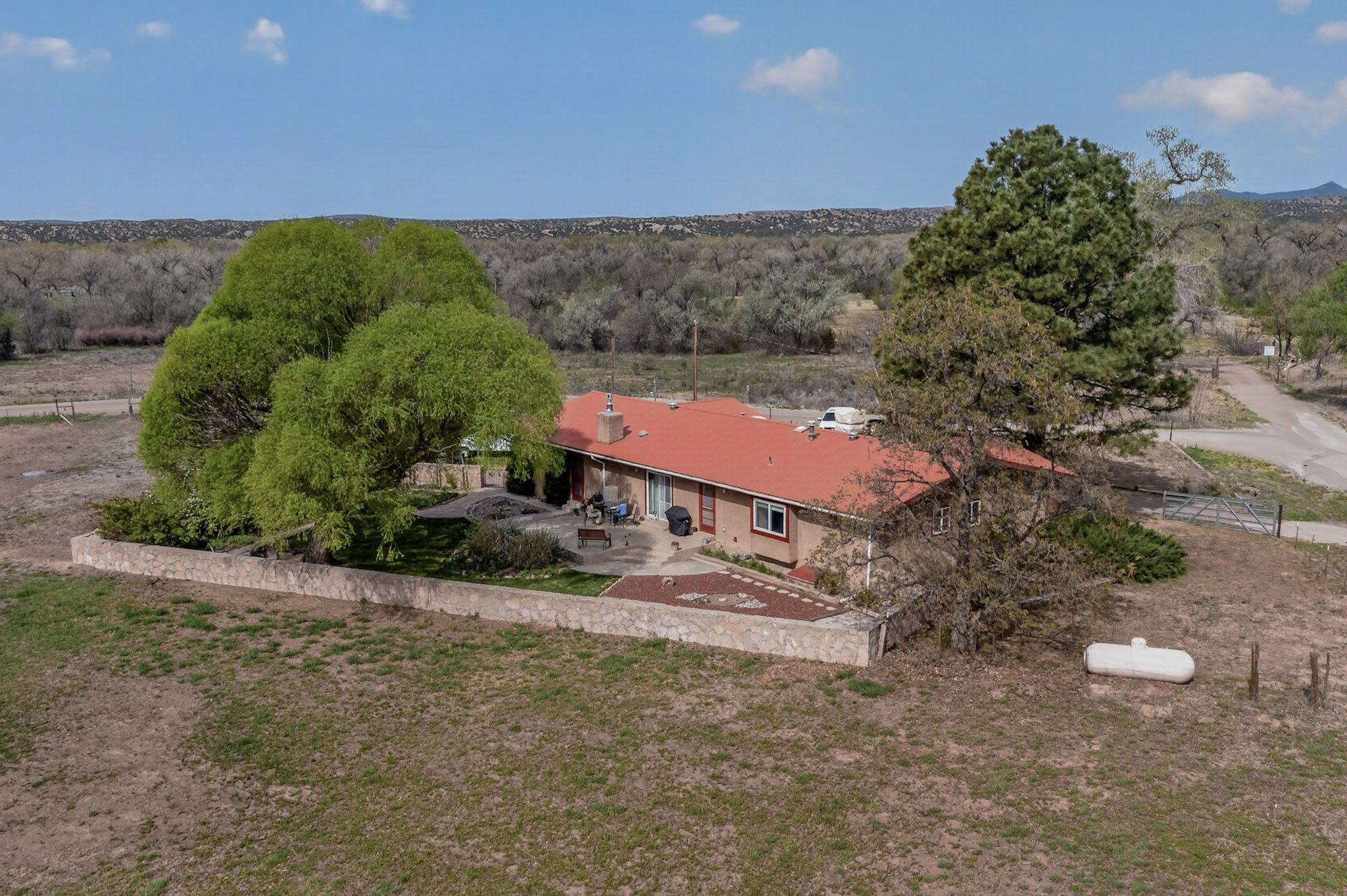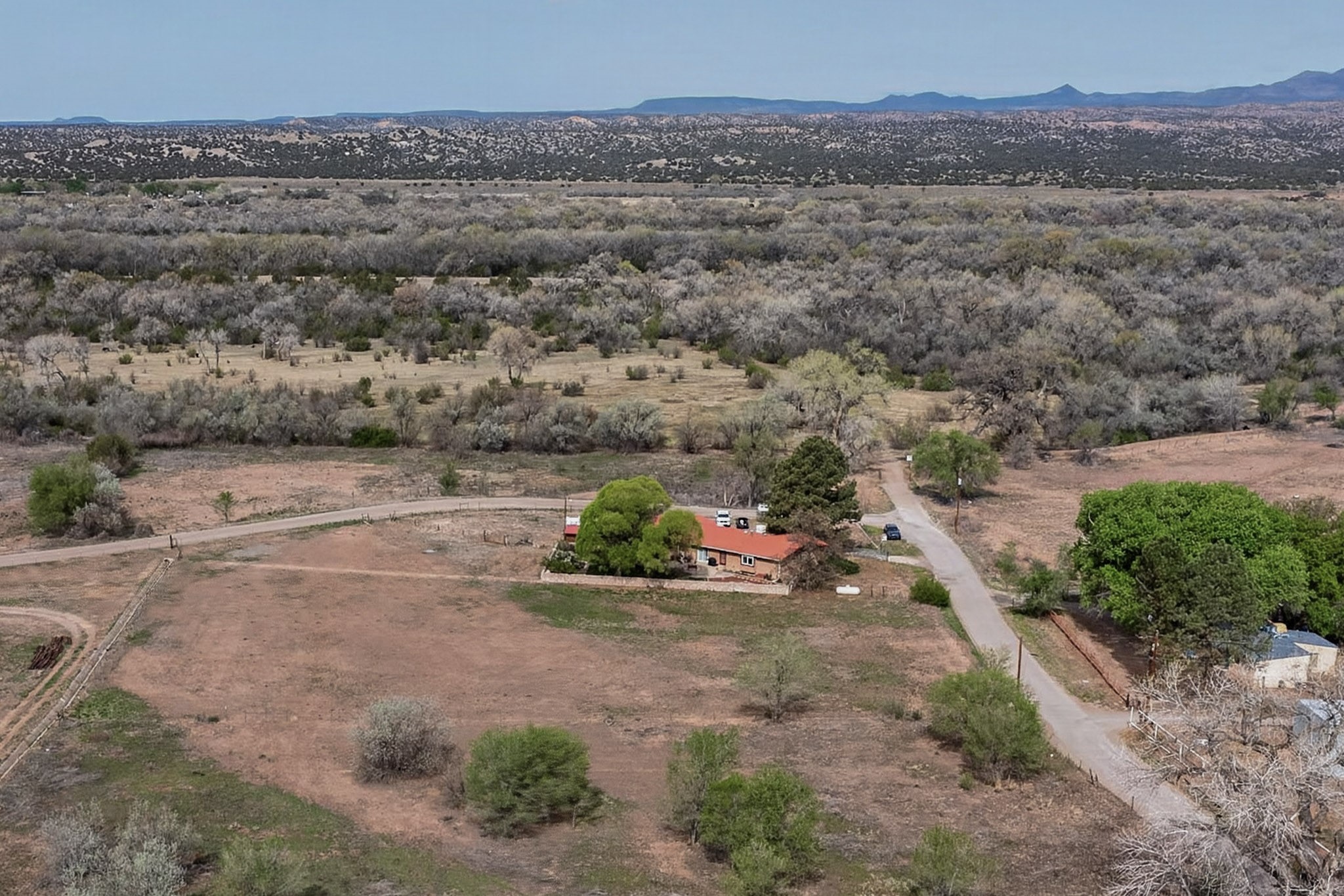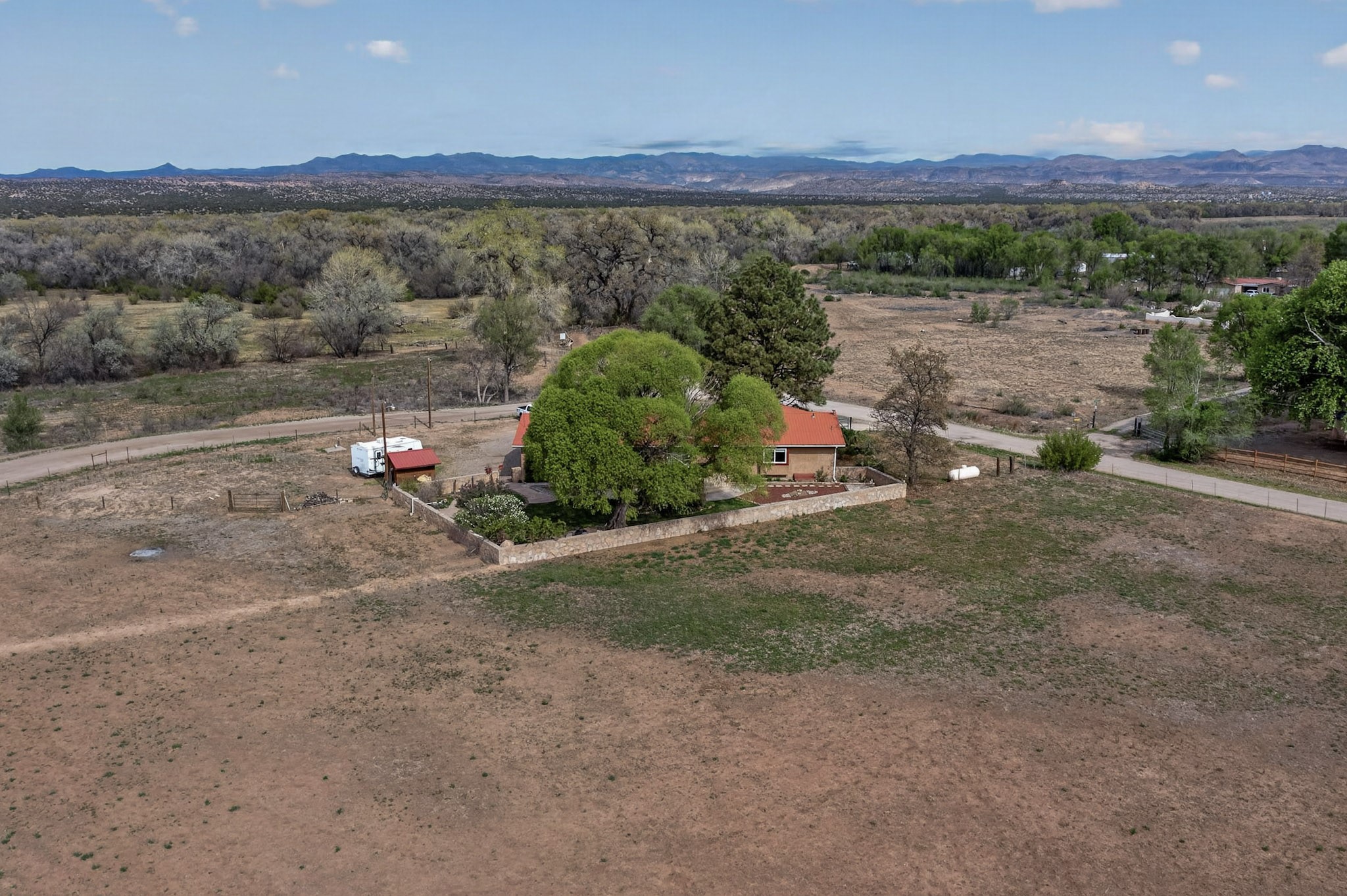 Don't miss this incredible opportunity to own a spacious move in ready home, featuring pre-1907 water rights, conveyed with the property! (.96 acre w/2.868 diversion) Situated on 2 parcels for a total of 2.3 acres, this charming residence offers updated gorgeous wood laminate flooring in the main living areas and beautifully updated baths. The resurfaced kitchen cabinets add a fresh touch, while the fully landscaped back courtyard provides an inviting space to relax or entertain. Enjoy large bedrooms and a generous backyard patio with durable epoxy coating, perfect for outdoor gatherings. The oversized 2-car garage offers ample storage. Beautiful views, and walking distance to the Bosque! This property blends comfort, functionality, and timeless value - Just 15 quick minutes to the interstate! Great location if working in Santa Fe OR ABQ!