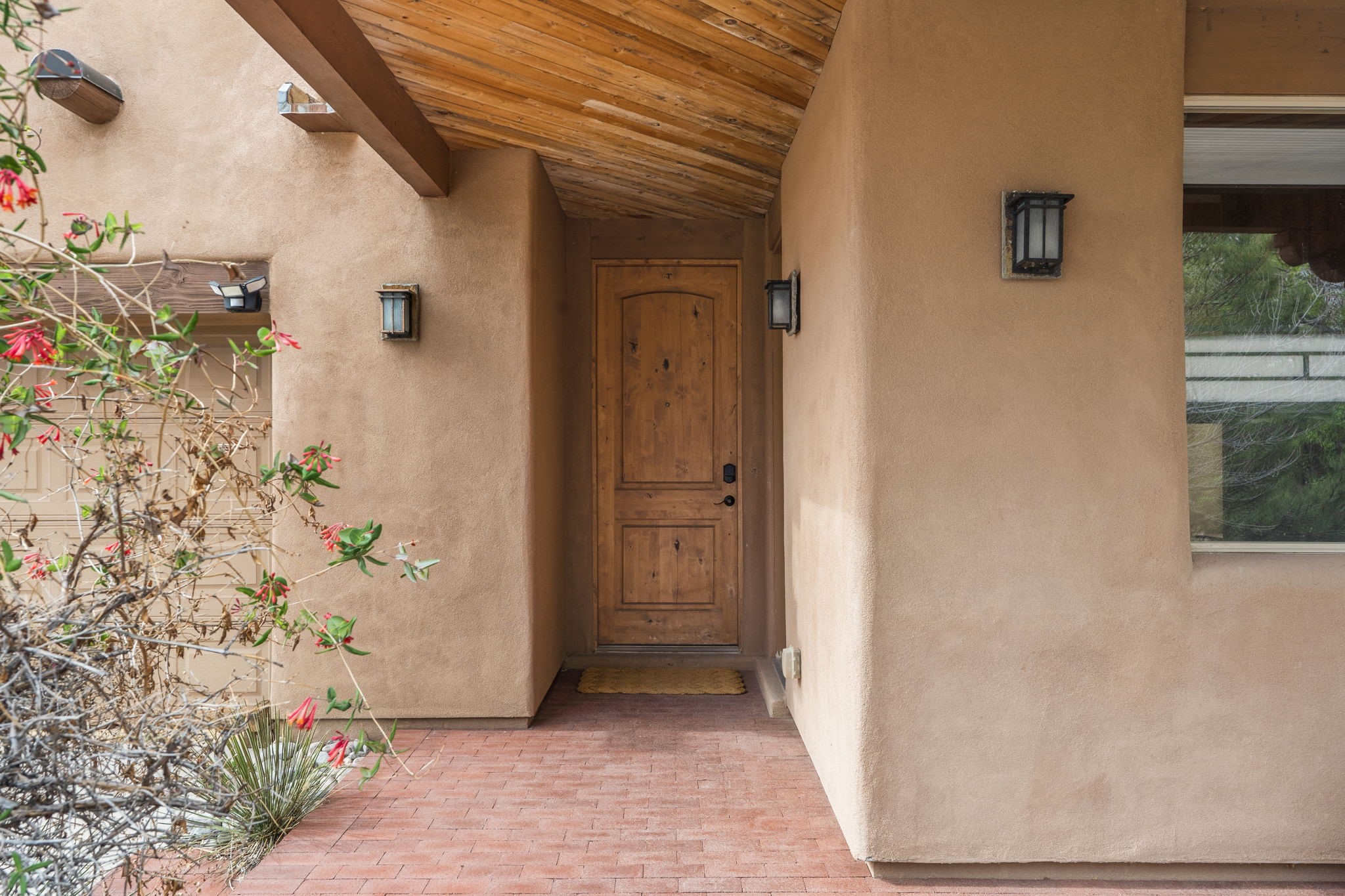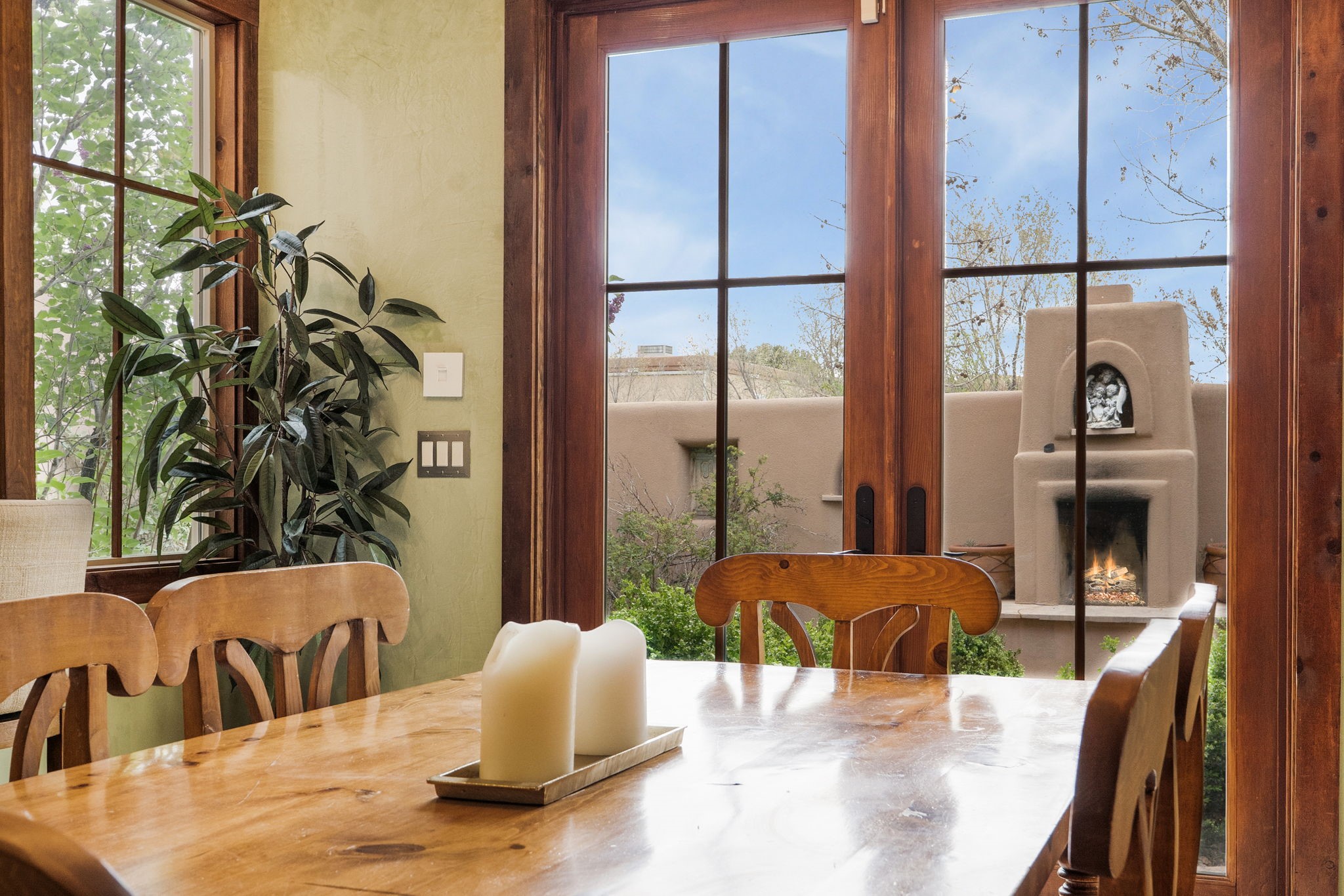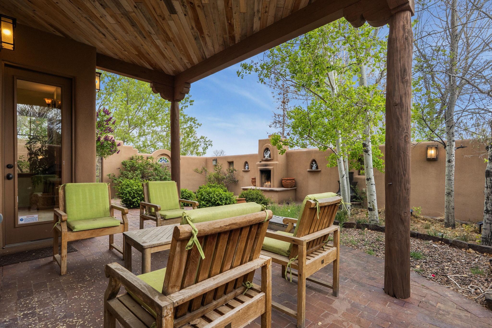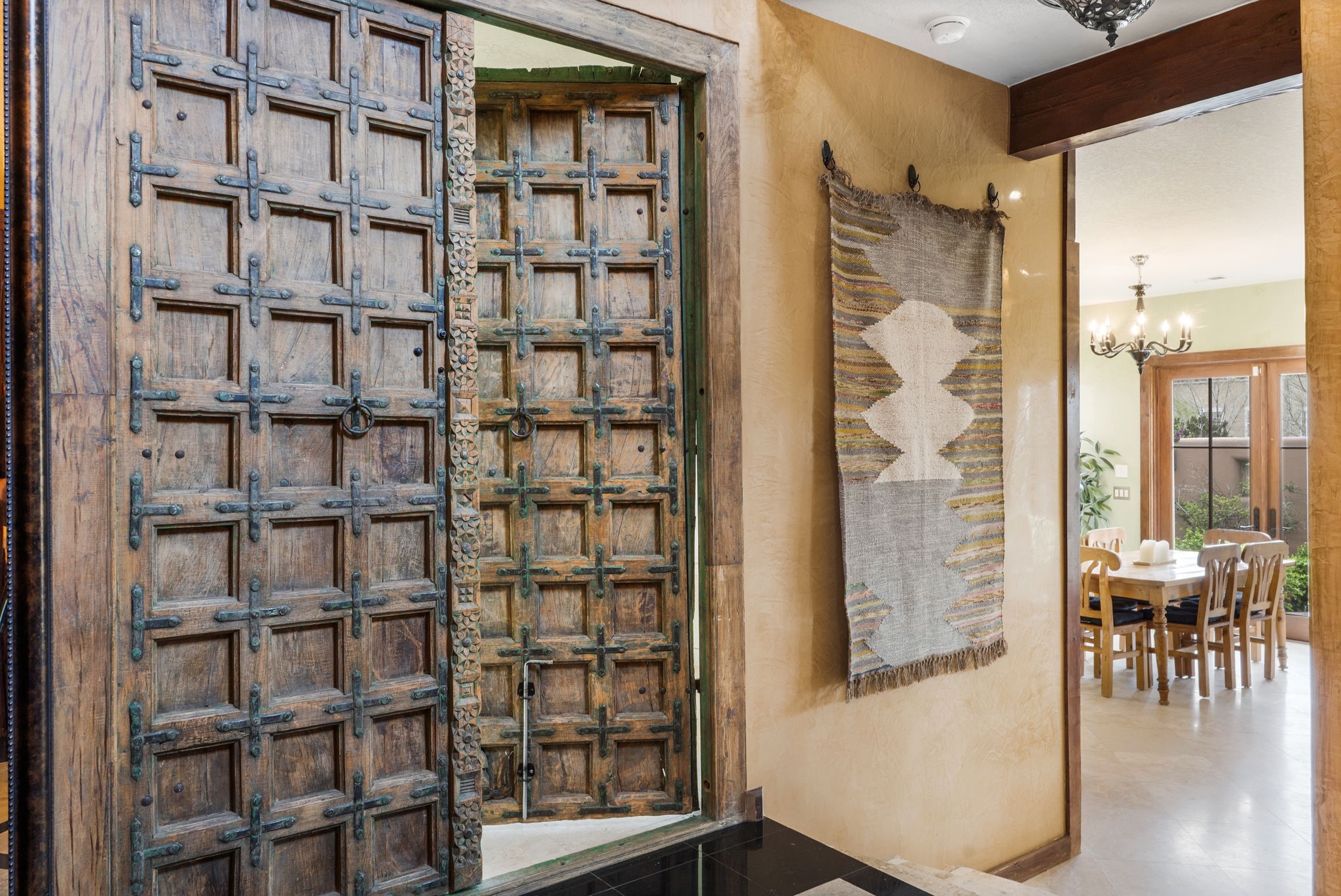 You deserve the finer things in life, and this property is one of them!! Don't miss this gorgeous home on an extremely rare in-town lot that is almost an acre. No expense has been spared in order to create this Santa Fe dream home. Upon entering, you are greeted by a grand foyer with a large crystal chandelier. Colorful prisms of light dance off the warm venetian plaster walls. In the open concept living area, there is a cozy wood-burning fireplace, ornate carved doors throughout, and the custom kitchen boasts rare "Fantasy Brown" honed marble countertops, a lively Mexican hand-painted diamond backsplash, and high-end appliances. A kitchen window graces the sink, so that you can look out over the field next to the house as you prepare dinner. Upstairs you will find three well-appointed bedrooms, a primary suite with luxurious bath and closet, and a large laundry room. There is a deck which offers a view of the city streets. The walled backyard is nothing short of a romantic secret garden, with an outdoor fireplace, box hedges and aspens, and a fountain. The garage is even heated and has windows, offering a flex space for hobbies, a game room, or hanging out. Being at the end of the cul-de-sac ensures maximum privacy. Schedule a showing today and make your dream home a reality!