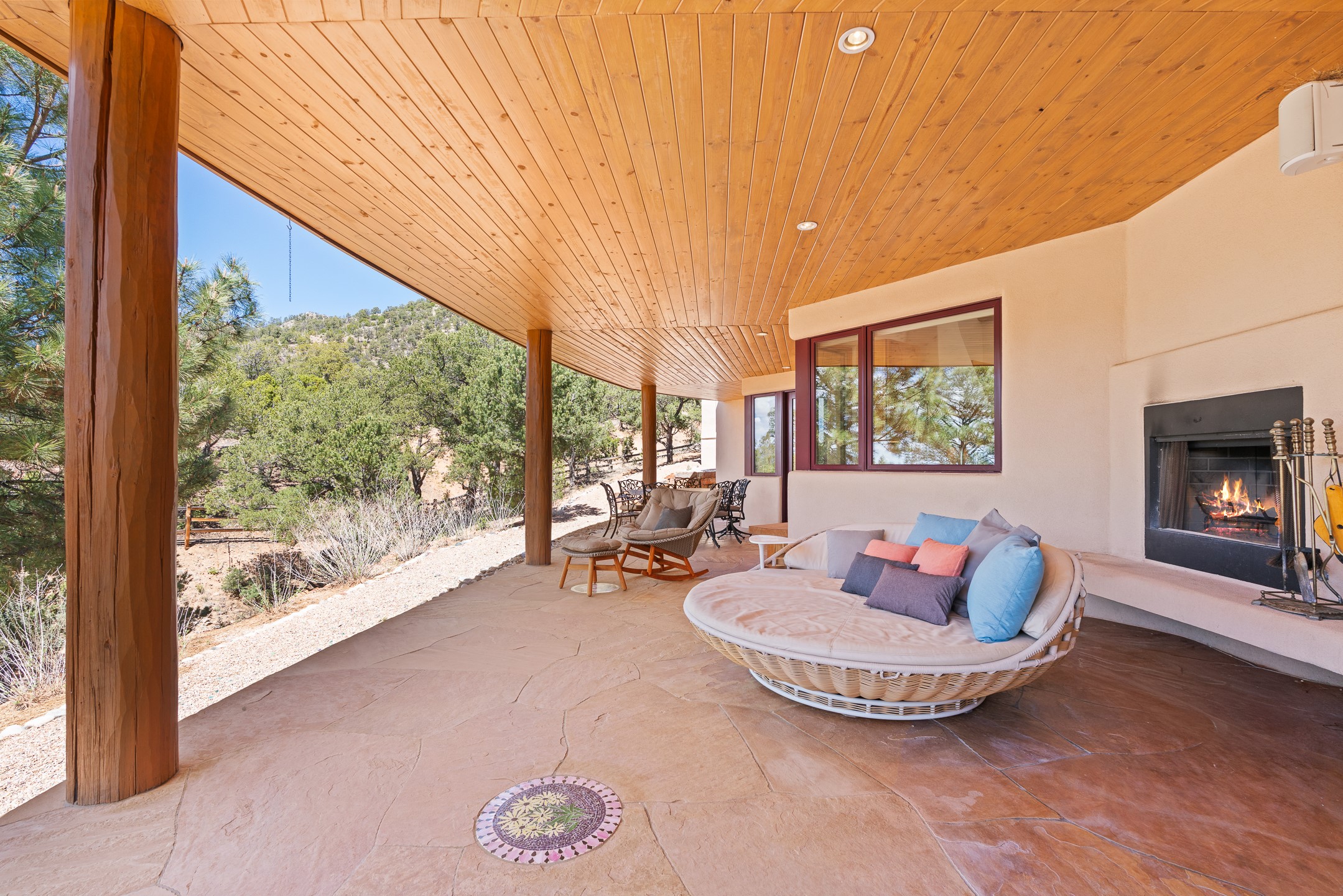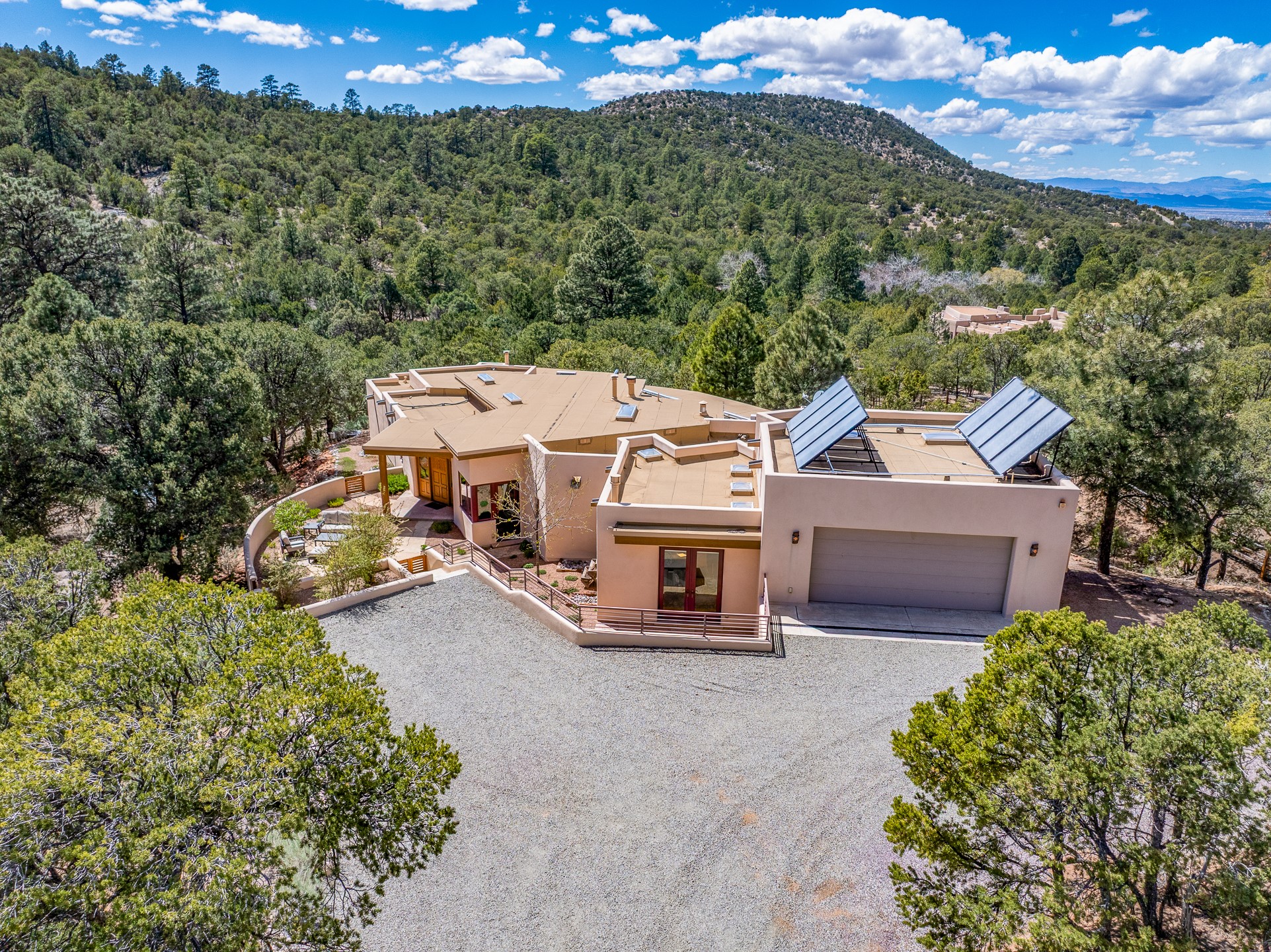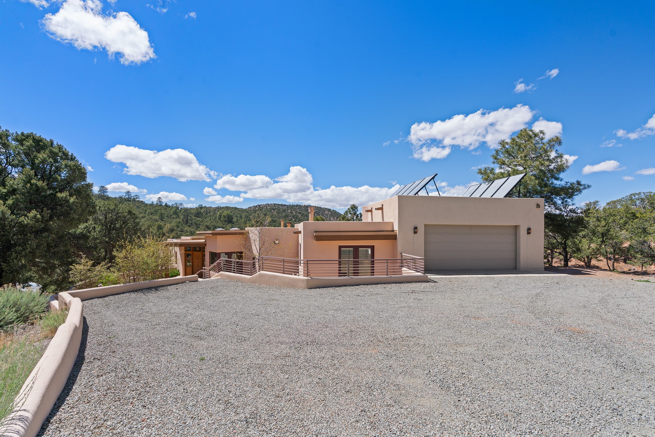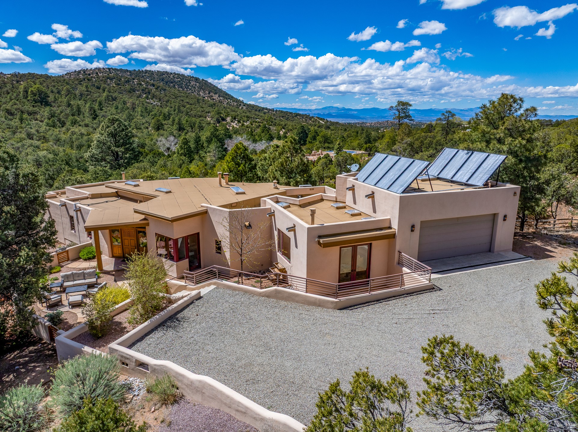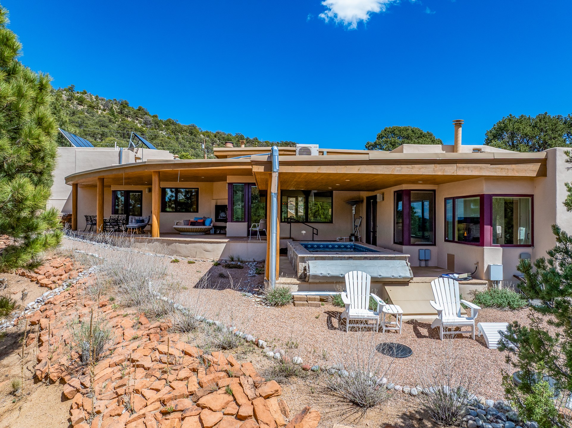 A Private Retreat nestled in the PinonsJust 20 minutes from downtown Santa Fe, this serene 5.8-acre property offers a rare sense of peace and seclusion. Nestled among mature pion trees along the coveted Old Santa Fe Trail, this 2,676 sq ft home provides a true escape from the everyday.Built by Bob DiJanni in 2011, the flexible floor plan features 3 bedrooms and 2 baths, thoughtfully designed for comfort and privacy. The main living area is filled with natural light from expansive windows, anchored by a gas fireplace and complemented by a freshly updated kitchen and dining space with new granite countertops, stylish lighting, a Wolf range, and Sub-Zero refrigerator.The primary suite is privately situated apart from the guest rooms, offering its own access to a covered portal, gas fireplace, spacious walk-in closet with an attached safe, and a spa-like bath with soaking tub, separate shower, and large windows framing tranquil views. Two additional bedrooms are well-separated for guests or family.A bright attached studio with private entry and kiva fireplace creates an ideal space for work, art, or reflection. Outdoor living is equally inviting, with a large covered portal featuring a wood-burning fireplace and and Endless Pool with insulated cover heated by solar panels on the roof.--perfect for relaxation or exercise year-round.Recent upgrades include solar thermal hot water panels supporting domestic use and radiant in-floor heating, water filtration systems, and four mini-split units with capacity for expansion. The land has been carefully maintained with tree trimming and underbrush clearing for fire mitigation.With a shared well and thoughtful improvements throughout, this property offers a harmonious blend of comfort, efficiency, and natural beauty--an ideal sanctuary to call home.