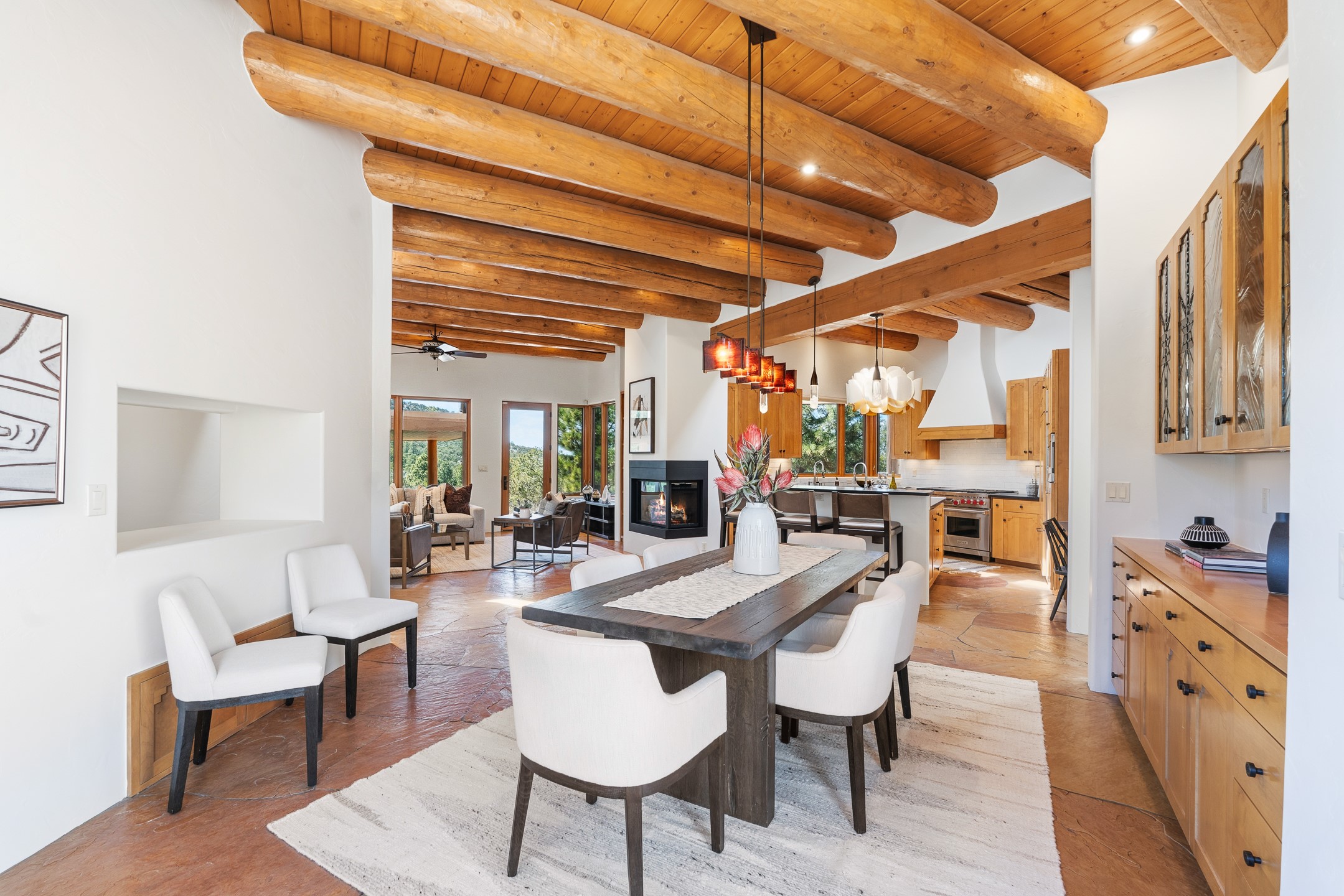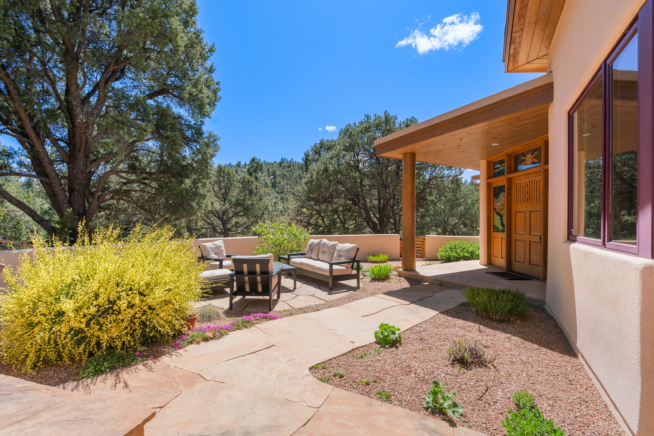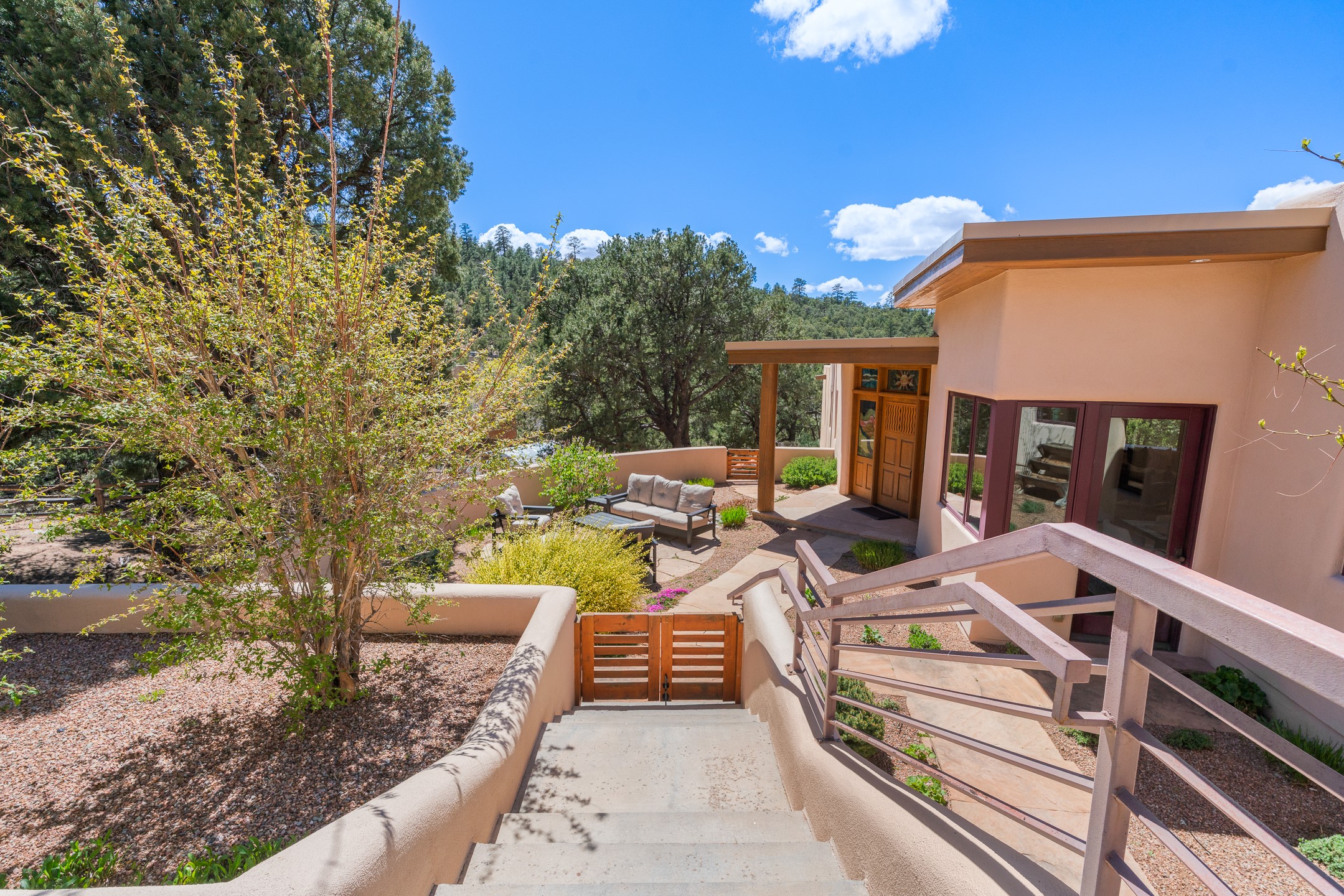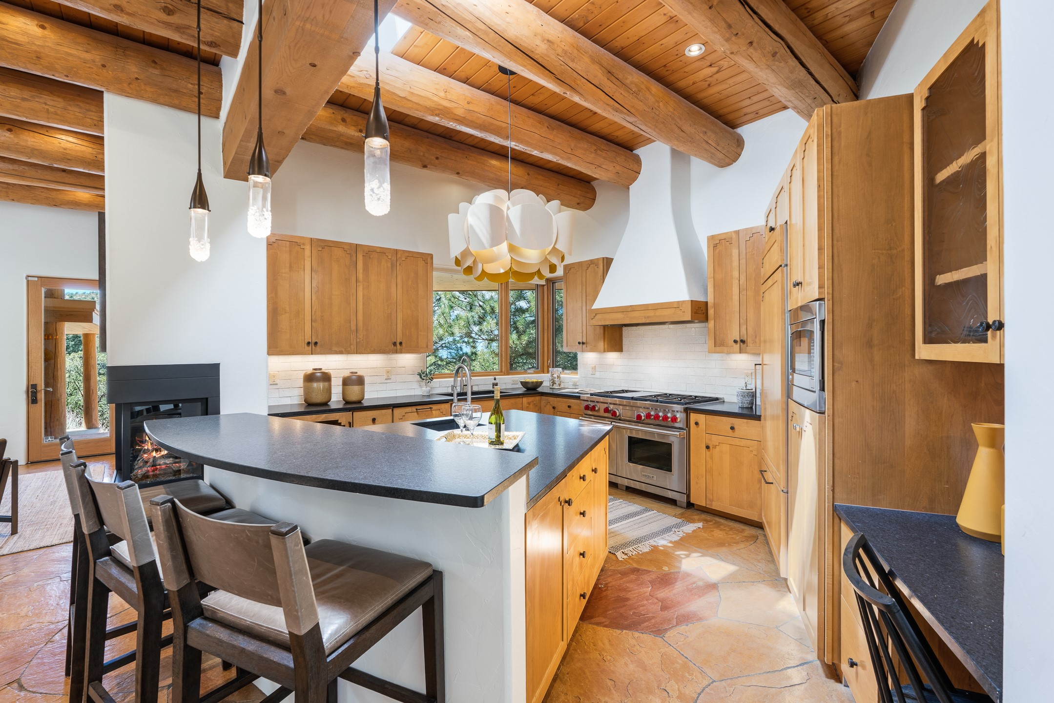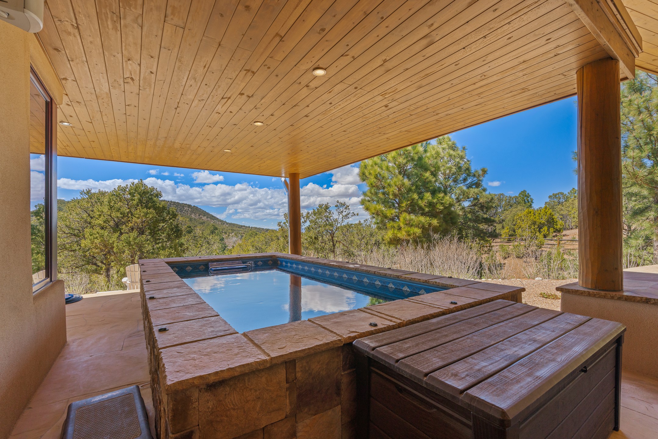 A Private Retreat nestled in the PinonsJust 20 minutes from downtown Santa Fe, this serene 5.8-acre property offers a rare sense of peace and seclusion. Nestled among mature pion trees along the coveted Old Santa Fe Trail, this 2,676 sq ft home provides a true escape from the everyday.Built by Bob DiJanni in 2011, the flexible floor plan features 3 bedrooms and 2 baths, thoughtfully designed for comfort and privacy. The main living area is filled with natural light from expansive windows, anchored by a gas fireplace and complemented by a freshly updated kitchen and dining space with new granite countertops, stylish lighting, a Wolf range, and Sub-Zero refrigerator.The primary suite is privately situated apart from the guest rooms, offering its own access to a covered portal, gas fireplace, spacious walk-in closet with an attached safe, and a spa-like bath with soaking tub, separate shower, and large windows framing tranquil views. Two additional bedrooms are well-separated for guests or family.A bright attached studio with private entry and kiva fireplace creates an ideal space for work, art, or reflection. Outdoor living is equally inviting, with a large covered portal featuring a wood-burning fireplace and and Endless Pool with insulated cover heated by solar panels on the roof.--perfect for relaxation or exercise year-round.Recent upgrades include solar thermal hot water panels supporting domestic use and radiant in-floor heating, water filtration systems, and four mini-split units with capacity for expansion. The land has been carefully maintained with tree trimming and underbrush clearing for fire mitigation.With a shared well and thoughtful improvements throughout, this property offers a harmonious blend of comfort, efficiency, and natural beauty--an ideal sanctuary to call home.