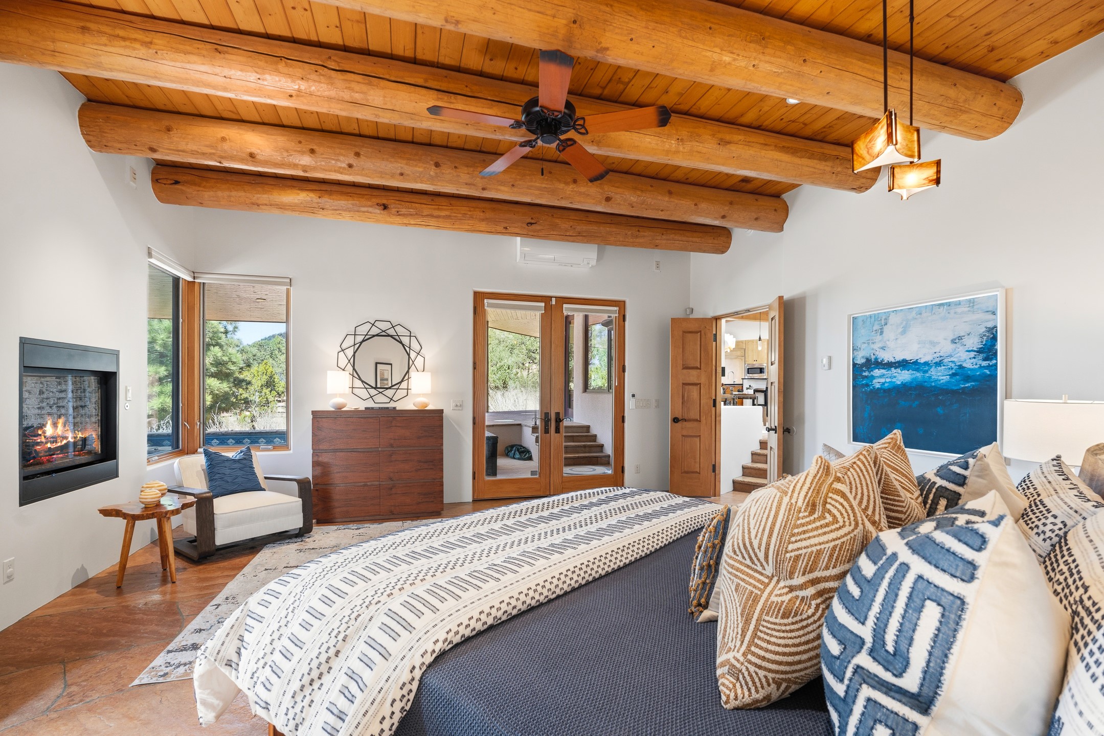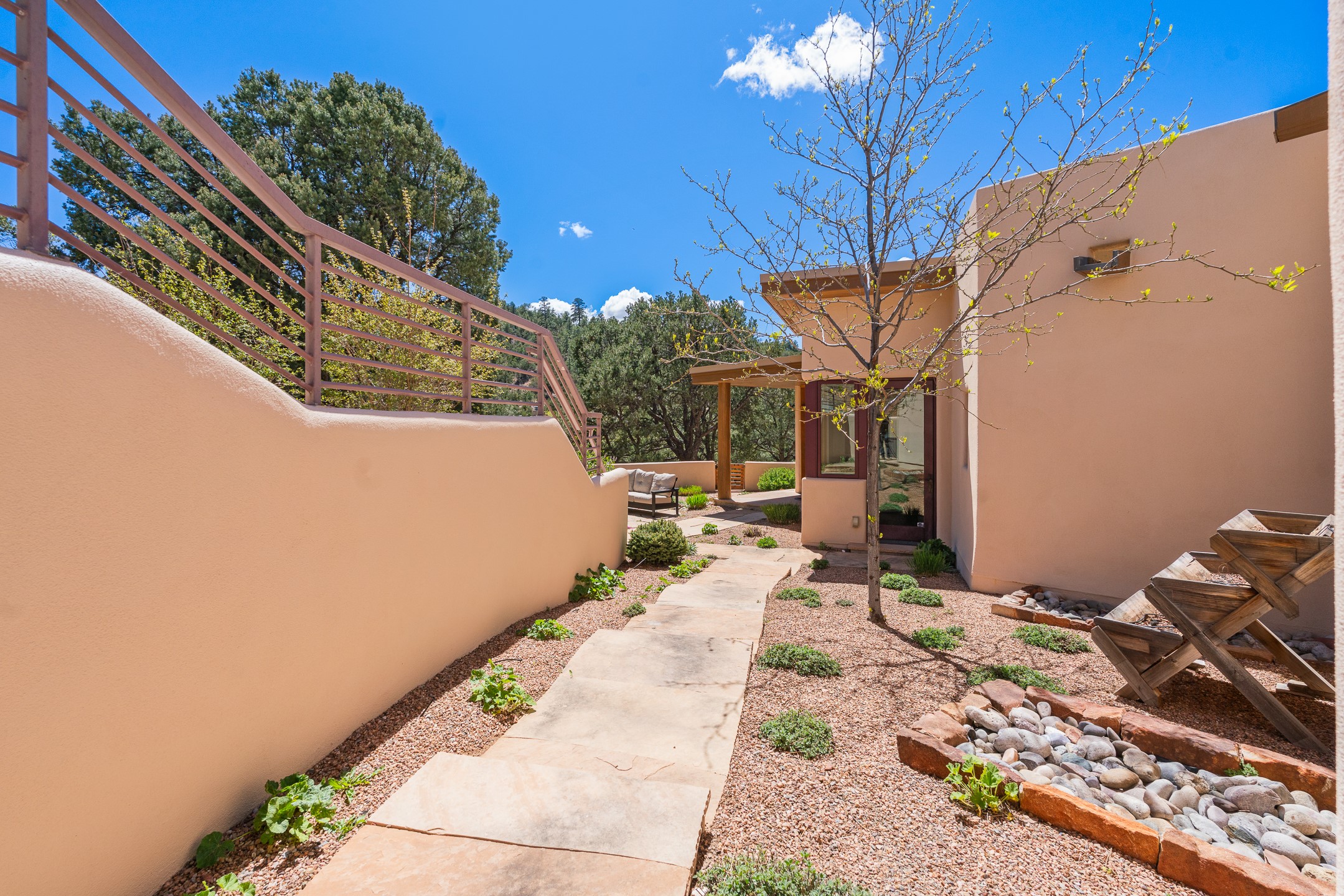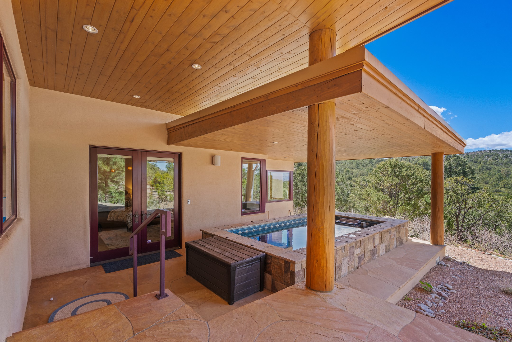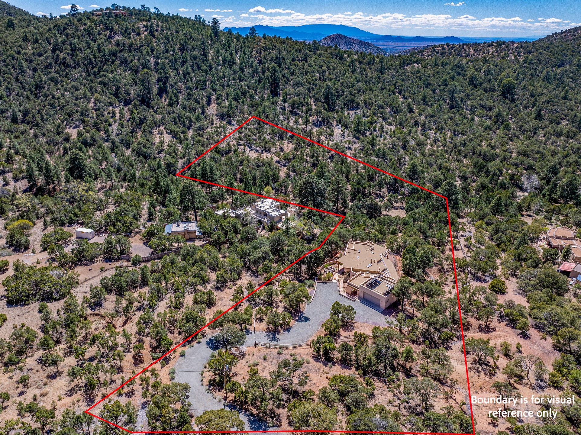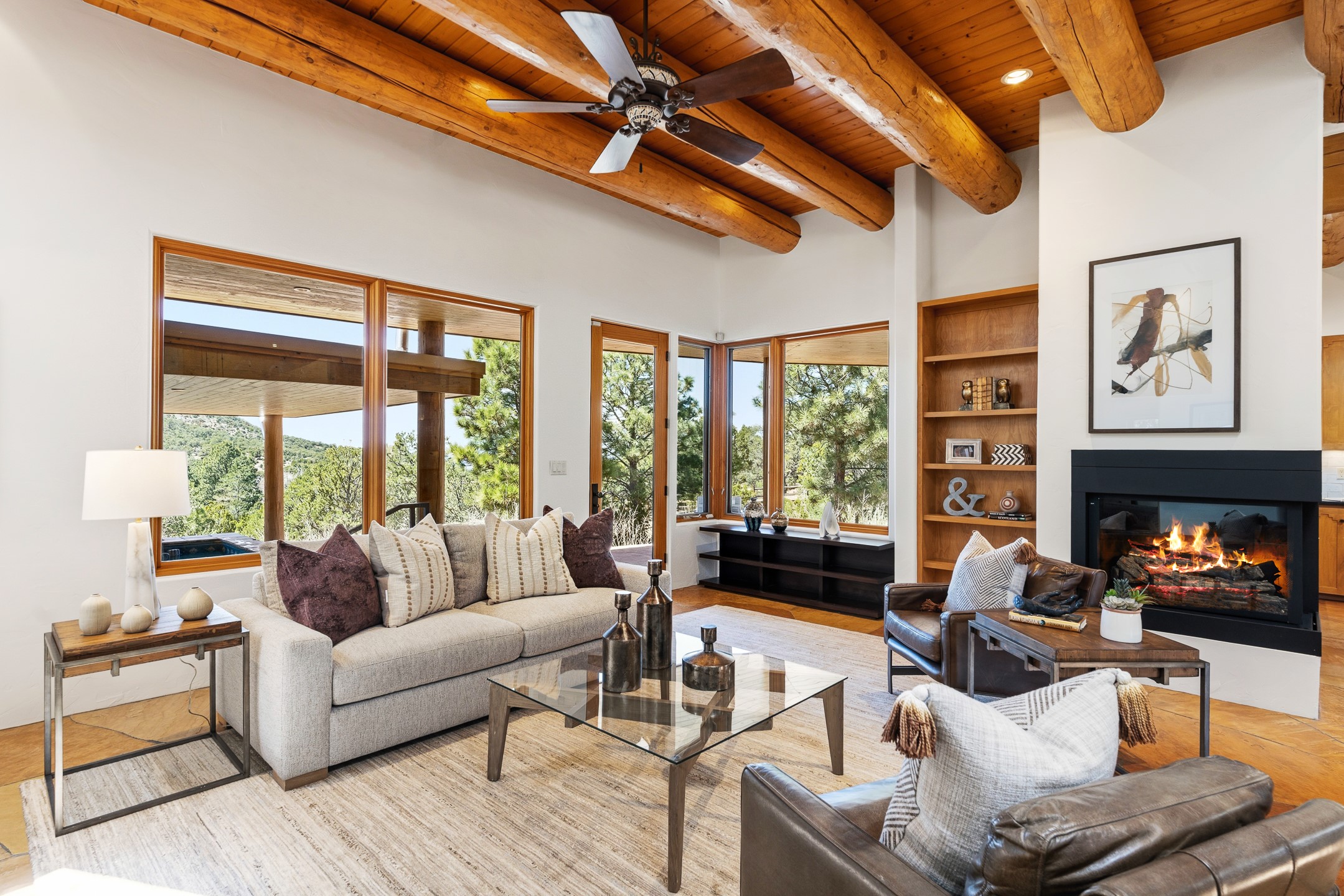 A Private Retreat nestled in the PinonsJust 20 minutes from downtown Santa Fe, this serene 5.8-acre property offers a rare sense of peace and seclusion. Nestled among mature pion trees along the coveted Old Santa Fe Trail, this 2,676 sq ft home provides a true escape from the everyday.Built by Bob DiJanni in 2011, the flexible floor plan features 3 bedrooms and 2 baths, thoughtfully designed for comfort and privacy. The main living area is filled with natural light from expansive windows, anchored by a gas fireplace and complemented by a freshly updated kitchen and dining space with new granite countertops, stylish lighting, a Wolf range, and Sub-Zero refrigerator.The primary suite is privately situated apart from the guest rooms, offering its own access to a covered portal, gas fireplace, spacious walk-in closet with an attached safe, and a spa-like bath with soaking tub, separate shower, and large windows framing tranquil views. Two additional bedrooms are well-separated for guests or family.A bright attached studio with private entry and kiva fireplace creates an ideal space for work, art, or reflection. Outdoor living is equally inviting, with a large covered portal featuring a wood-burning fireplace and and Endless Pool with insulated cover heated by solar panels on the roof.--perfect for relaxation or exercise year-round.Recent upgrades include solar thermal hot water panels supporting domestic use and radiant in-floor heating, water filtration systems, and four mini-split units with capacity for expansion. The land has been carefully maintained with tree trimming and underbrush clearing for fire mitigation.With a shared well and thoughtful improvements throughout, this property offers a harmonious blend of comfort, efficiency, and natural beauty--an ideal sanctuary to call home.