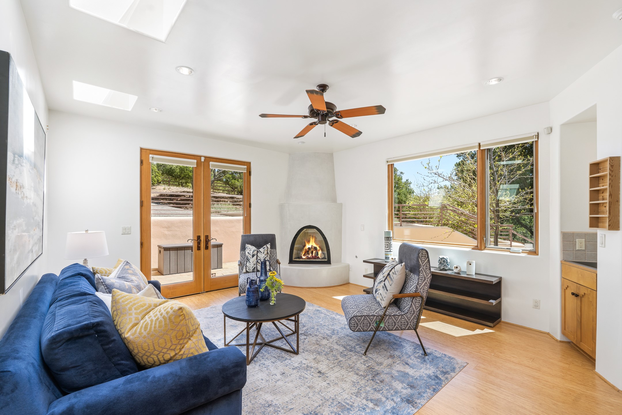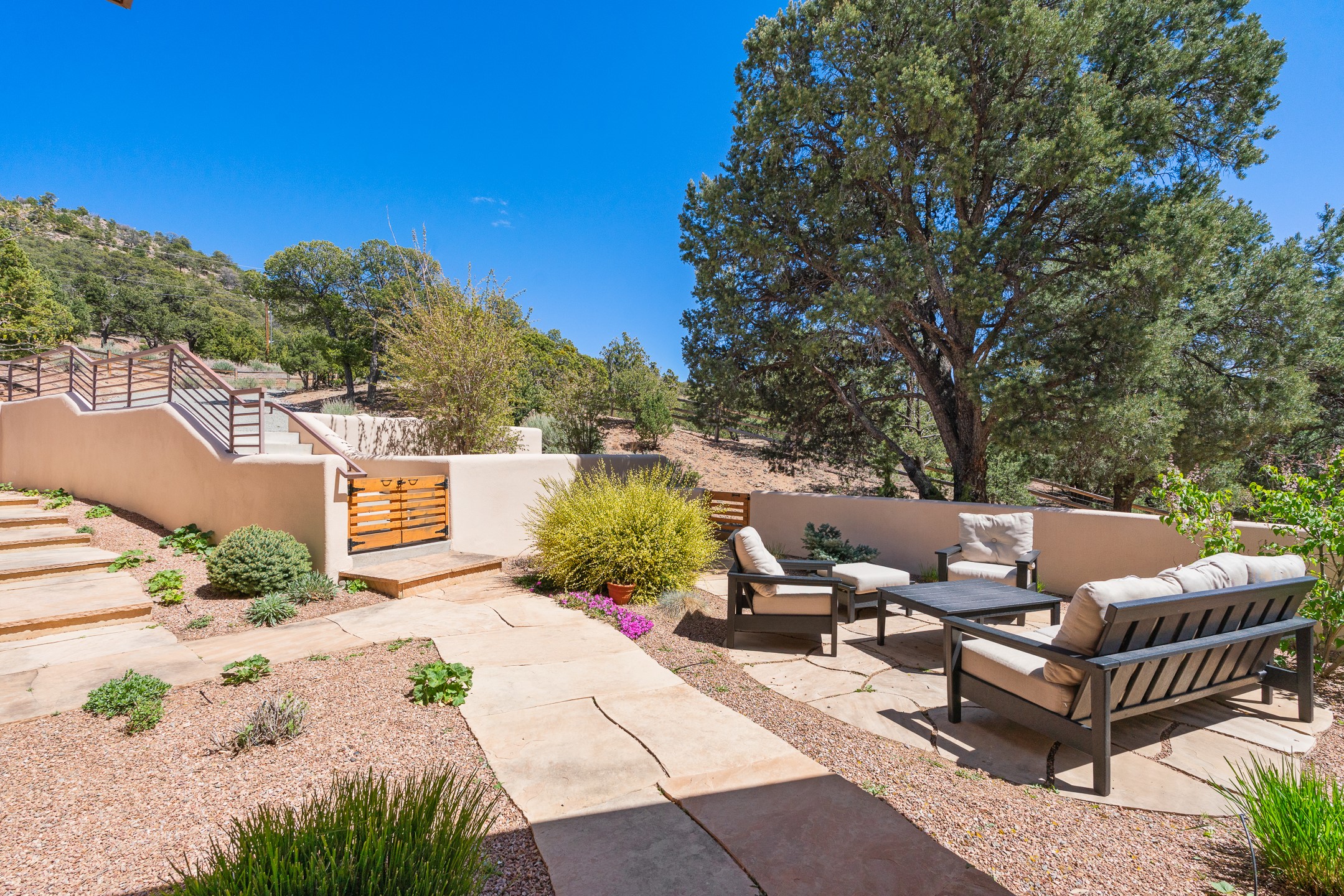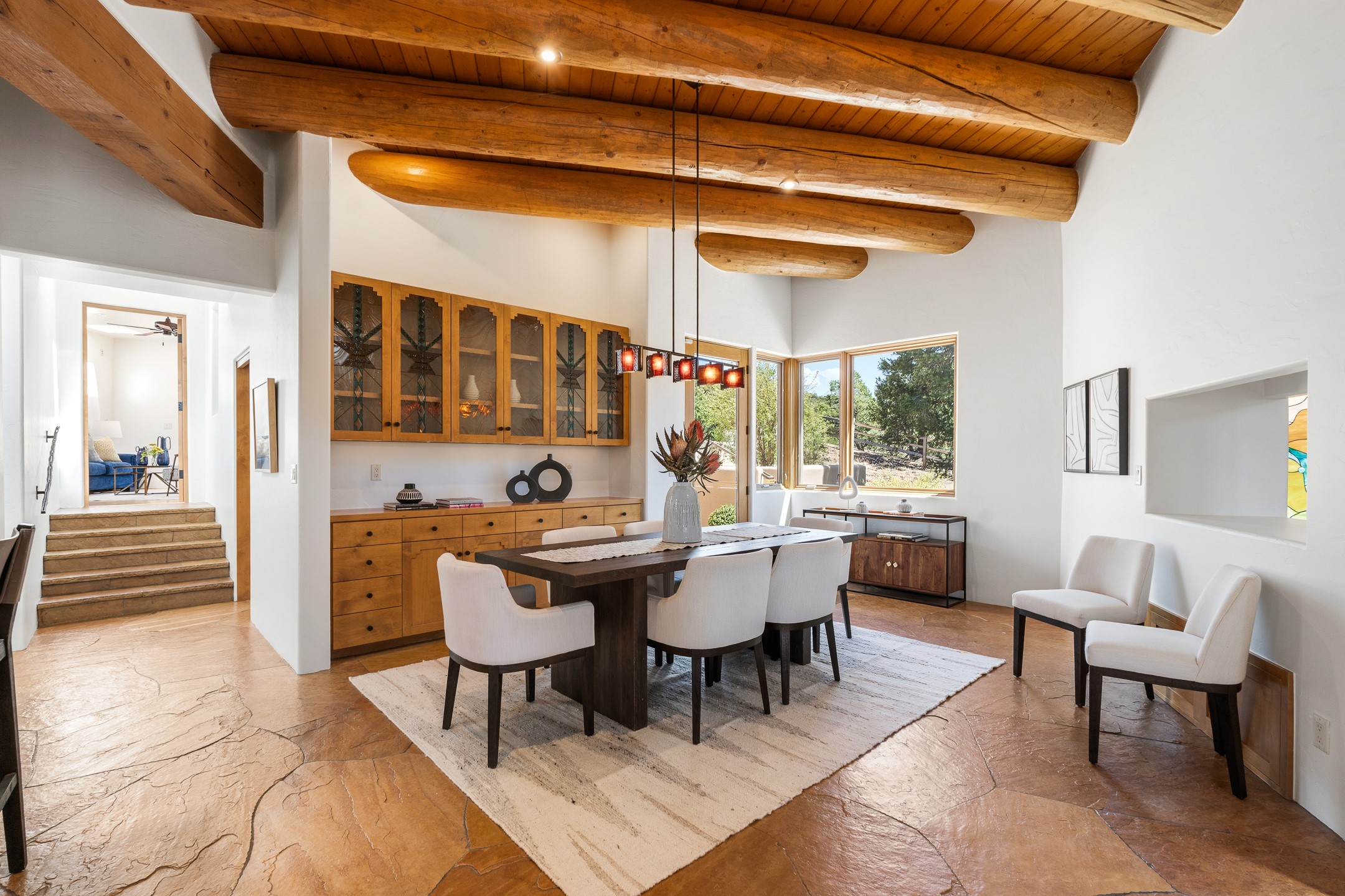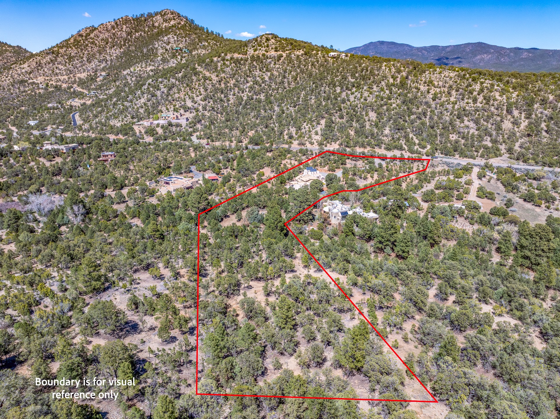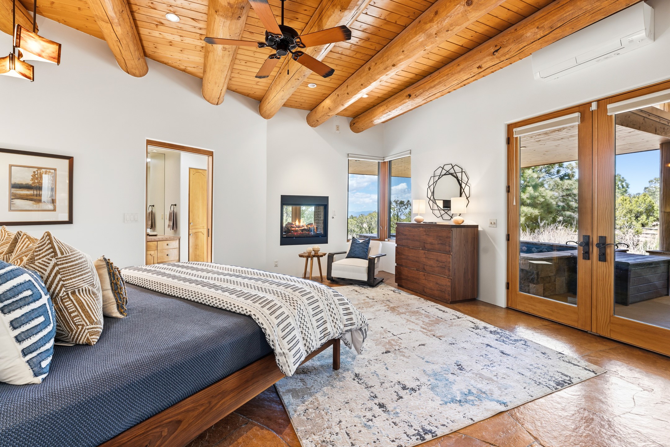A Private Retreat nestled in the PinonsJust 20 minutes from downtown Santa Fe, this serene 5.8-acre property offers a rare sense of peace and seclusion. Nestled among mature pion trees along the coveted Old Santa Fe Trail, this 2,676 sq ft home provides a true escape from the everyday.Built by Bob DiJanni in 2011, the flexible floor plan features 3 bedrooms and 2 baths, thoughtfully designed for comfort and privacy. The main living area is filled with natural light from expansive windows, anchored by a gas fireplace and complemented by a freshly updated kitchen and dining space with new granite countertops, stylish lighting, a Wolf range, and Sub-Zero refrigerator.The primary suite is privately situated apart from the guest rooms, offering its own access to a covered portal, gas fireplace, spacious walk-in closet with an attached safe, and a spa-like bath with soaking tub, separate shower, and large windows framing tranquil views. Two additional bedrooms are well-separated for guests or family.A bright attached studio with private entry and kiva fireplace creates an ideal space for work, art, or reflection. Outdoor living is equally inviting, with a large covered portal featuring a wood-burning fireplace and and Endless Pool with insulated cover heated by solar panels on the roof.--perfect for relaxation or exercise year-round.Recent upgrades include solar thermal hot water panels supporting domestic use and radiant in-floor heating, water filtration systems, and four mini-split units with capacity for expansion. The land has been carefully maintained with tree trimming and underbrush clearing for fire mitigation.With a shared well and thoughtful improvements throughout, this property offers a harmonious blend of comfort, efficiency, and natural beauty--an ideal sanctuary to call home.