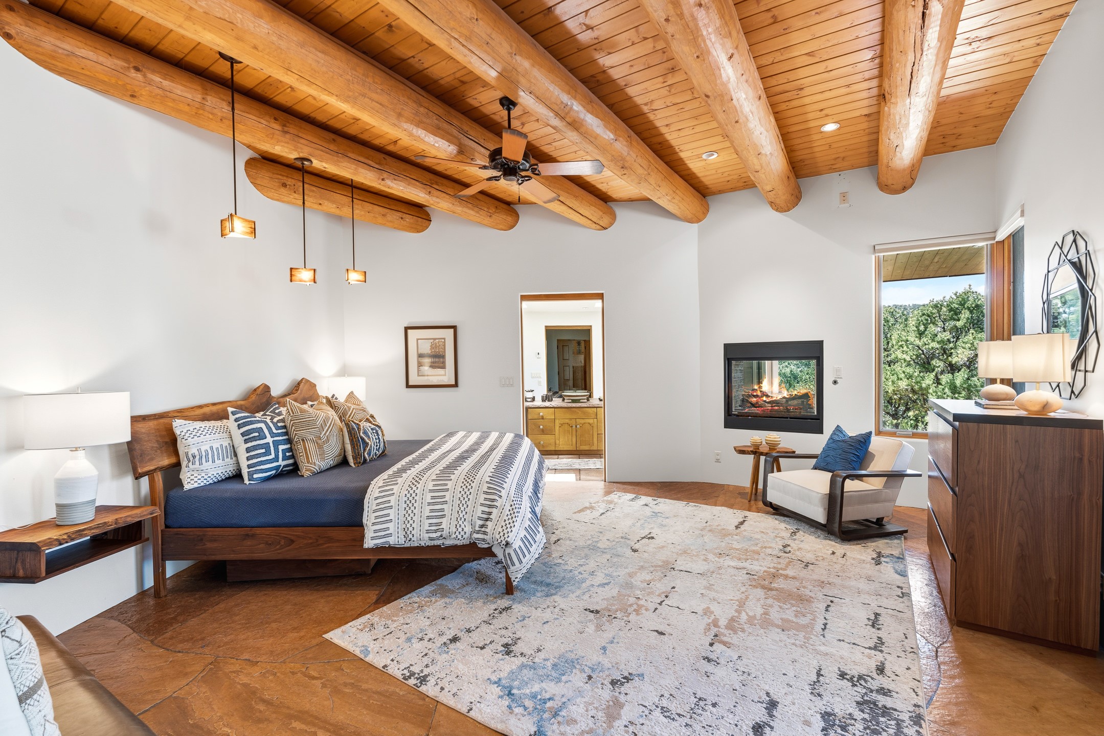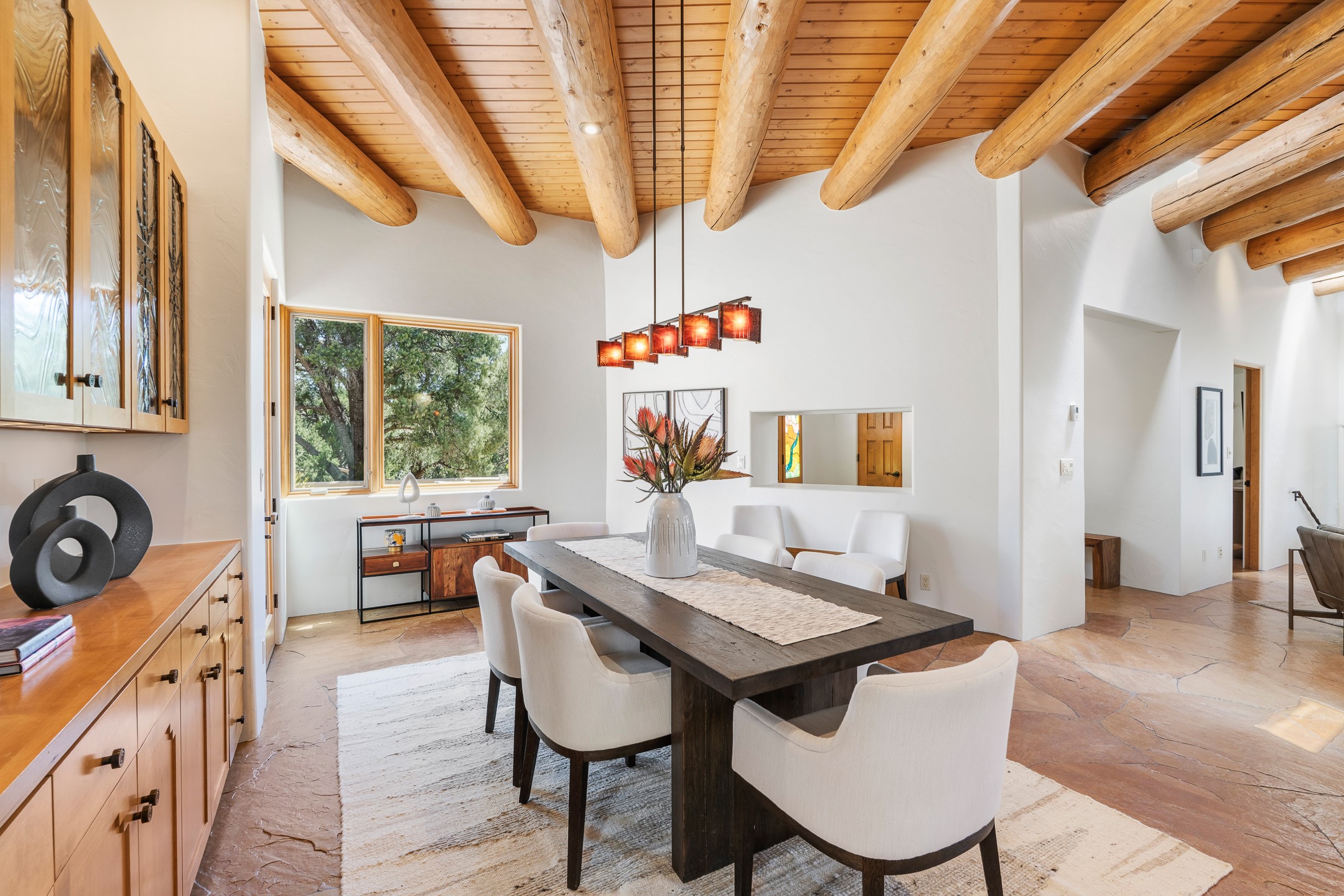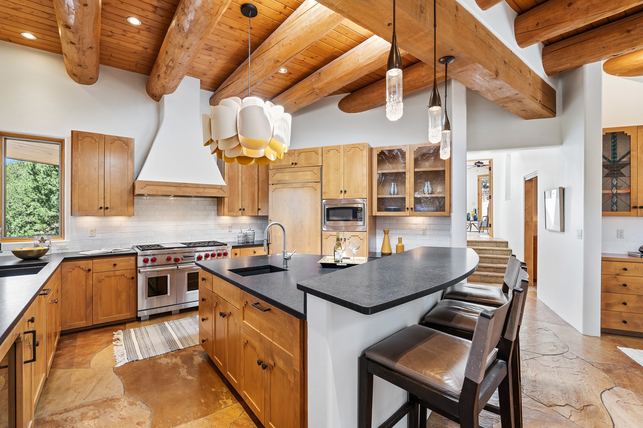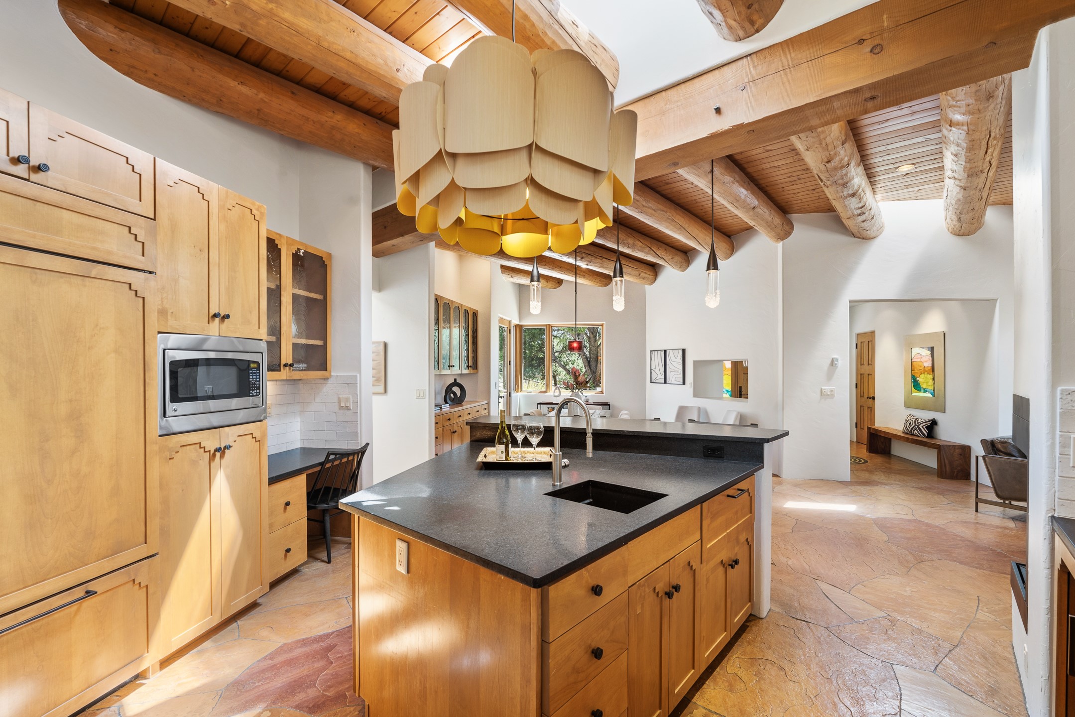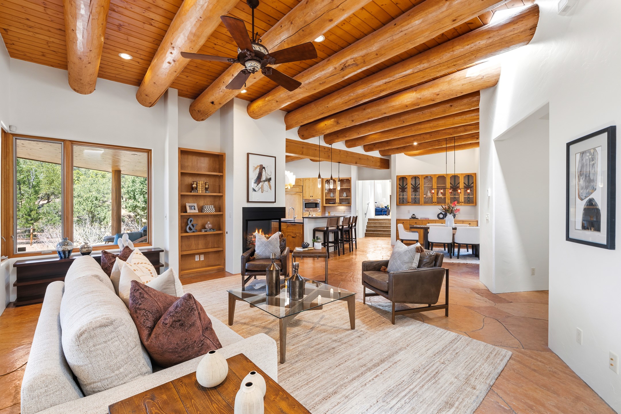 A Private Retreat nestled in the PinonsJust 20 minutes from downtown Santa Fe, this serene 5.8-acre property offers a rare sense of peace and seclusion. Nestled among mature pion trees along the coveted Old Santa Fe Trail, this 2,676 sq ft home provides a true escape from the everyday.Built by Bob DiJanni in 2011, the flexible floor plan features 3 bedrooms and 2 baths, thoughtfully designed for comfort and privacy. The main living area is filled with natural light from expansive windows, anchored by a gas fireplace and complemented by a freshly updated kitchen and dining space with new granite countertops, stylish lighting, a Wolf range, and Sub-Zero refrigerator.The primary suite is privately situated apart from the guest rooms, offering its own access to a covered portal, gas fireplace, spacious walk-in closet with an attached safe, and a spa-like bath with soaking tub, separate shower, and large windows framing tranquil views. Two additional bedrooms are well-separated for guests or family.A bright attached studio with private entry and kiva fireplace creates an ideal space for work, art, or reflection. Outdoor living is equally inviting, with a large covered portal featuring a wood-burning fireplace and and Endless Pool with insulated cover heated by solar panels on the roof.--perfect for relaxation or exercise year-round.Recent upgrades include solar thermal hot water panels supporting domestic use and radiant in-floor heating, water filtration systems, and four mini-split units with capacity for expansion. The land has been carefully maintained with tree trimming and underbrush clearing for fire mitigation.With a shared well and thoughtful improvements throughout, this property offers a harmonious blend of comfort, efficiency, and natural beauty--an ideal sanctuary to call home.