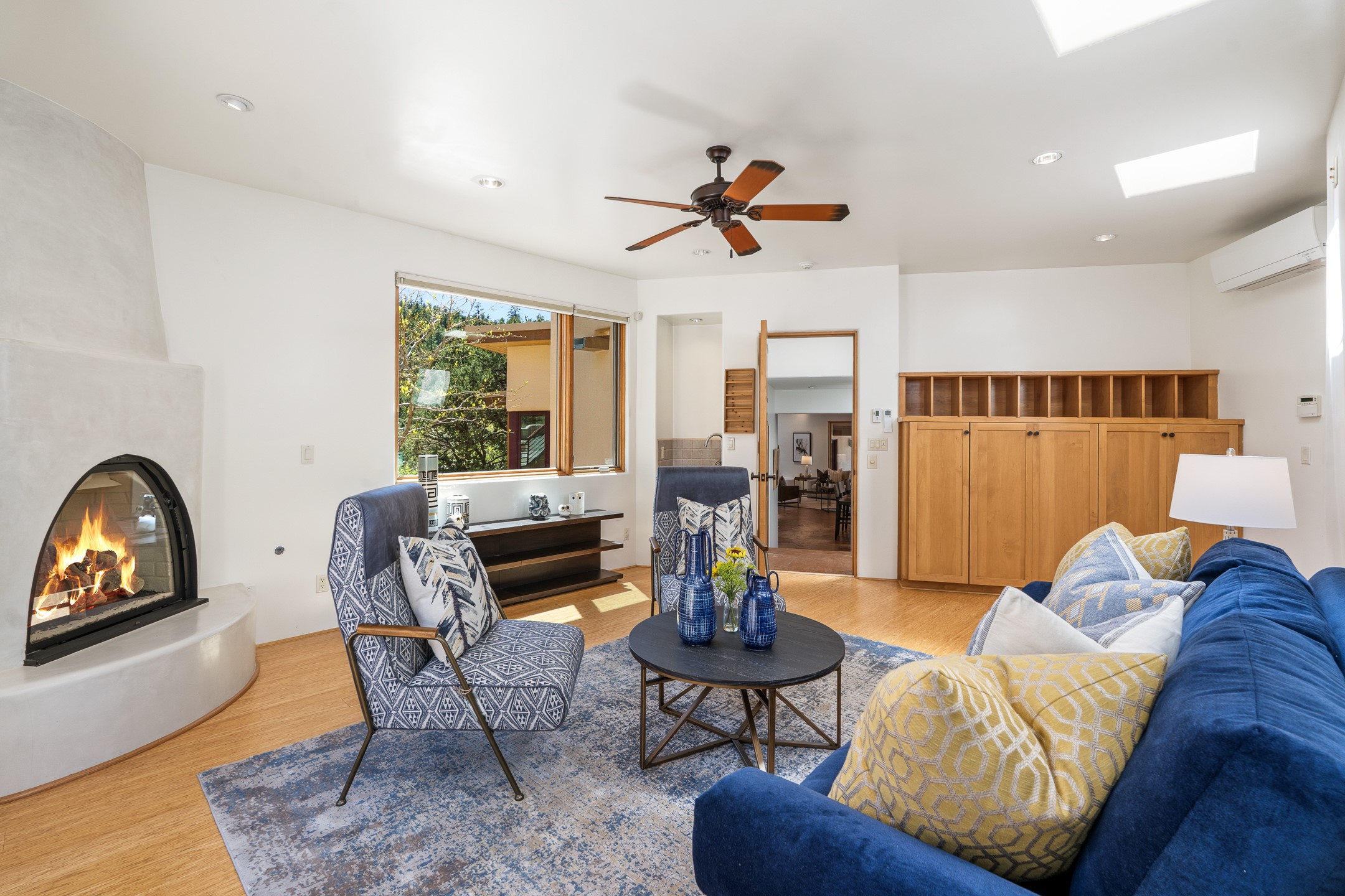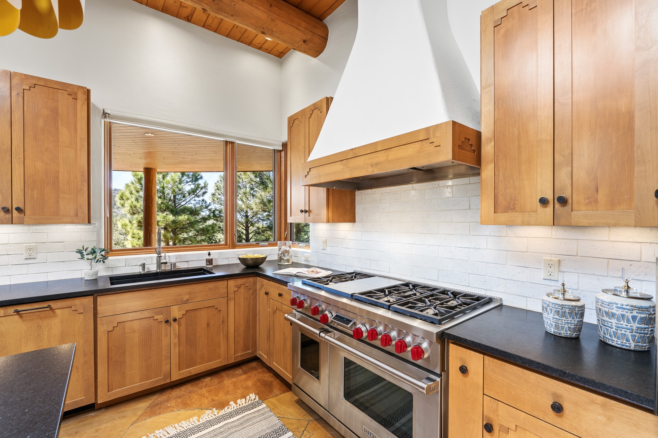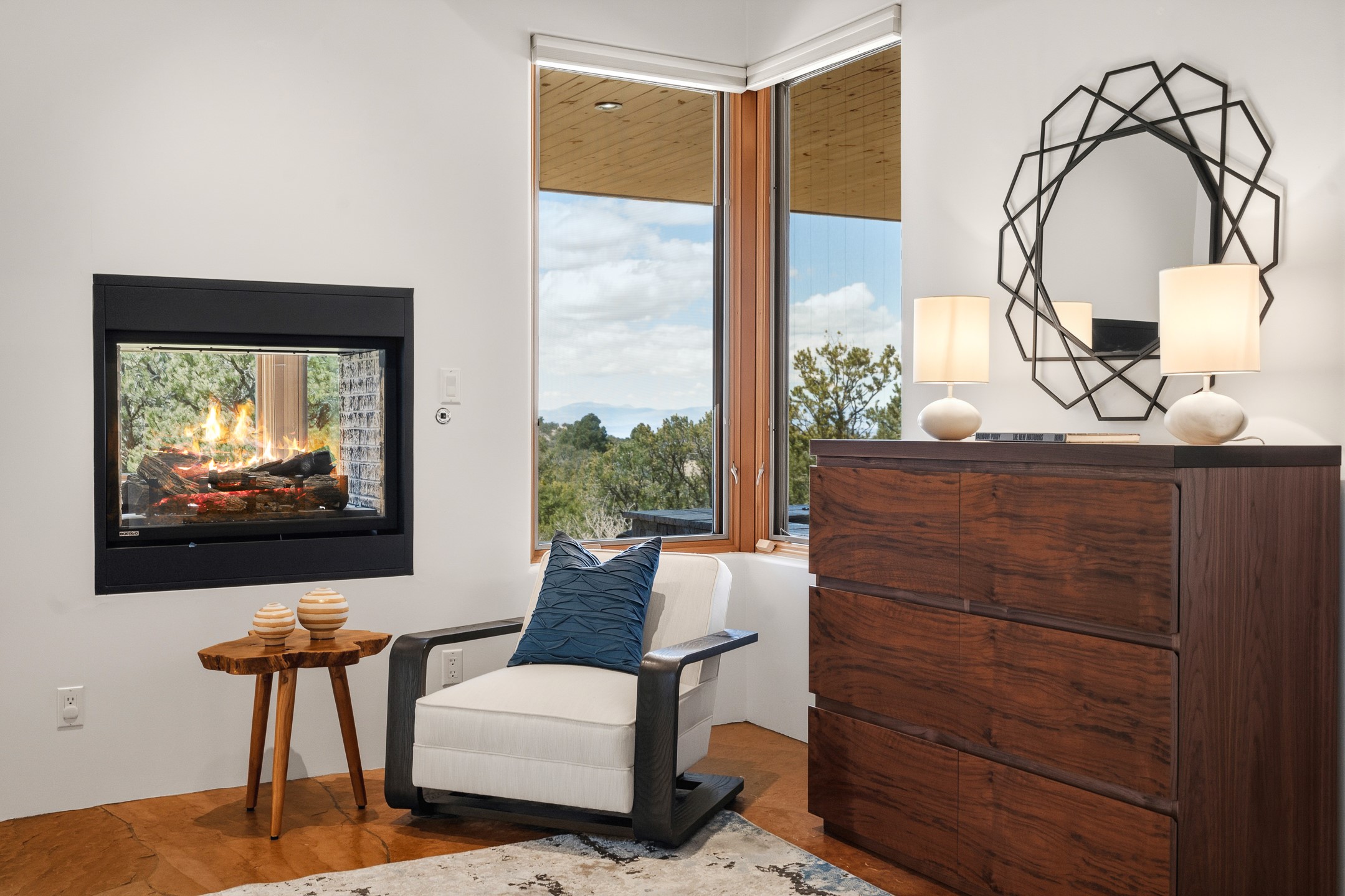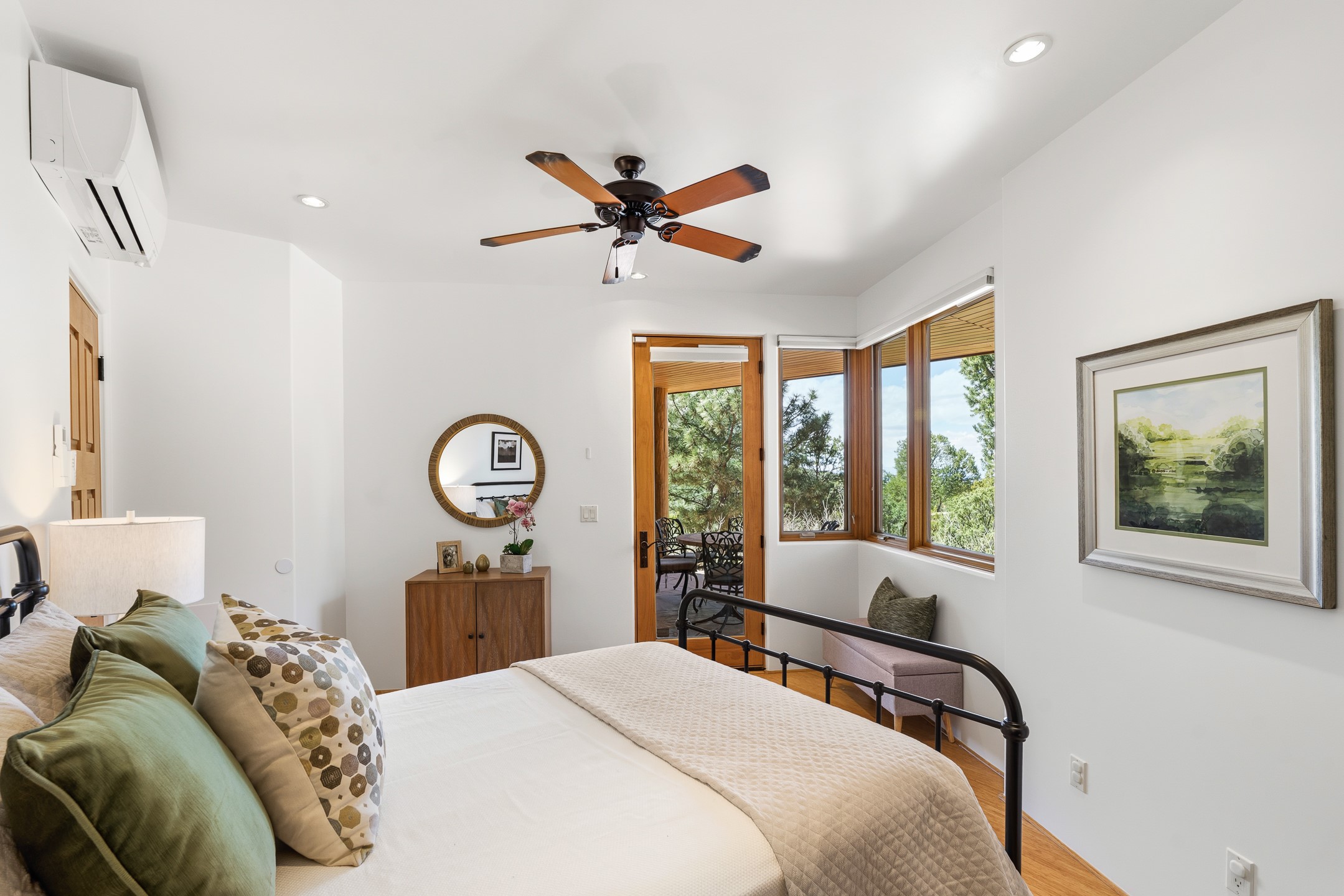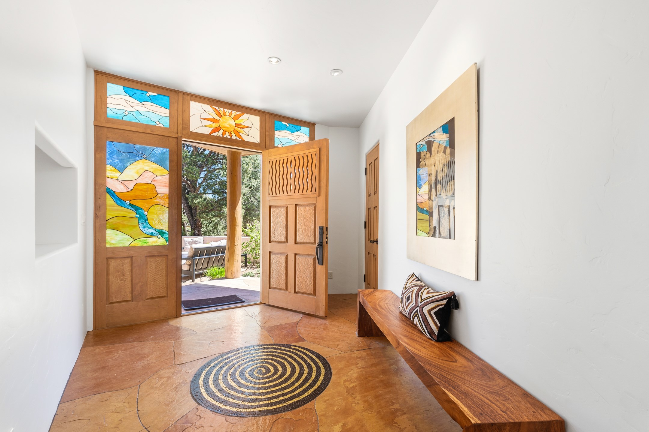 A Private Retreat nestled in the PinonsJust 20 minutes from downtown Santa Fe, this serene 5.8-acre property offers a rare sense of peace and seclusion. Nestled among mature pion trees along the coveted Old Santa Fe Trail, this 2,676 sq ft home provides a true escape from the everyday.Built by Bob DiJanni in 2011, the flexible floor plan features 3 bedrooms and 2 baths, thoughtfully designed for comfort and privacy. The main living area is filled with natural light from expansive windows, anchored by a gas fireplace and complemented by a freshly updated kitchen and dining space with new granite countertops, stylish lighting, a Wolf range, and Sub-Zero refrigerator.The primary suite is privately situated apart from the guest rooms, offering its own access to a covered portal, gas fireplace, spacious walk-in closet with an attached safe, and a spa-like bath with soaking tub, separate shower, and large windows framing tranquil views. Two additional bedrooms are well-separated for guests or family.A bright attached studio with private entry and kiva fireplace creates an ideal space for work, art, or reflection. Outdoor living is equally inviting, with a large covered portal featuring a wood-burning fireplace and and Endless Pool with insulated cover heated by solar panels on the roof.--perfect for relaxation or exercise year-round.Recent upgrades include solar thermal hot water panels supporting domestic use and radiant in-floor heating, water filtration systems, and four mini-split units with capacity for expansion. The land has been carefully maintained with tree trimming and underbrush clearing for fire mitigation.With a shared well and thoughtful improvements throughout, this property offers a harmonious blend of comfort, efficiency, and natural beauty--an ideal sanctuary to call home.