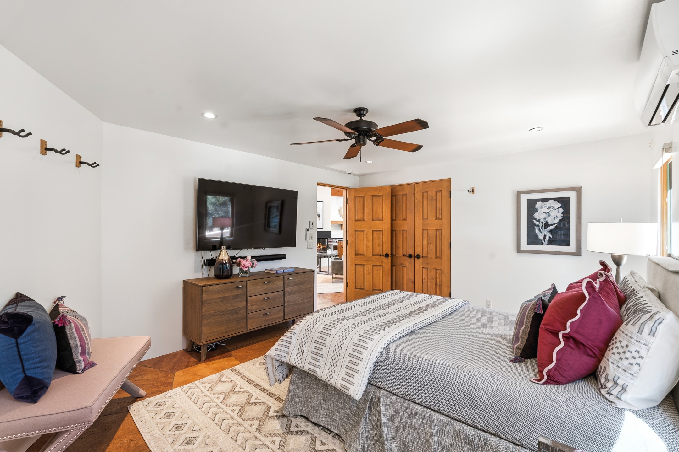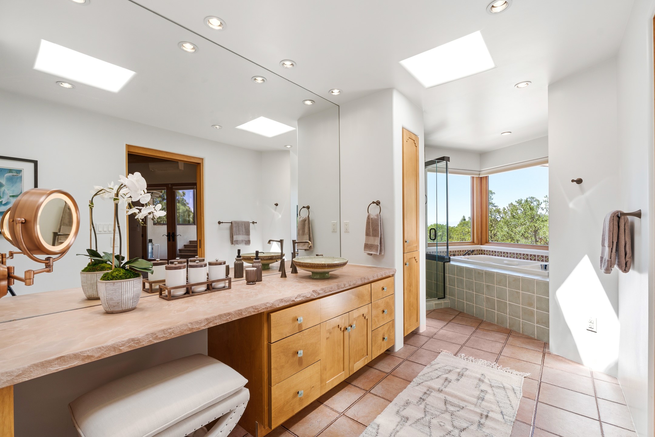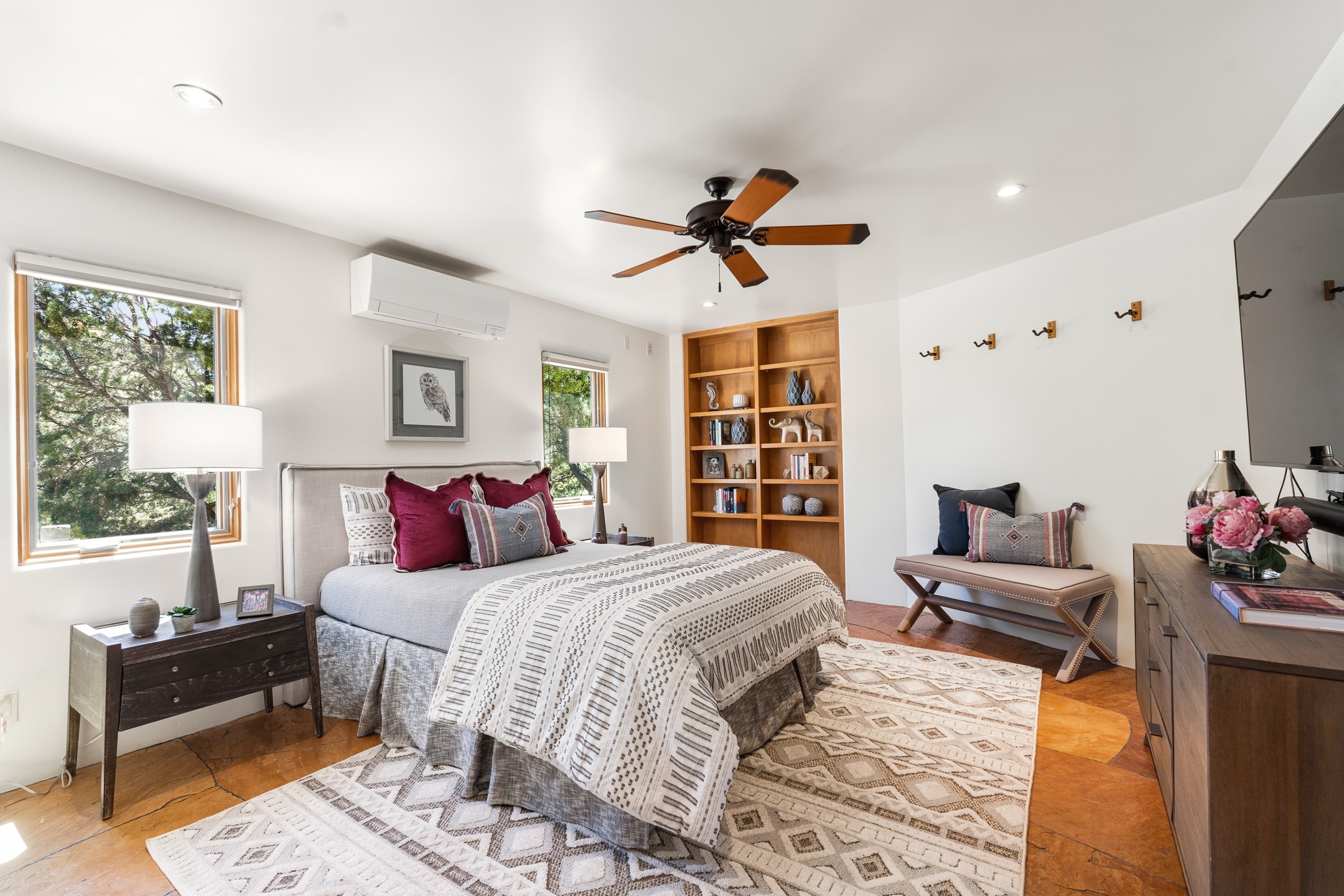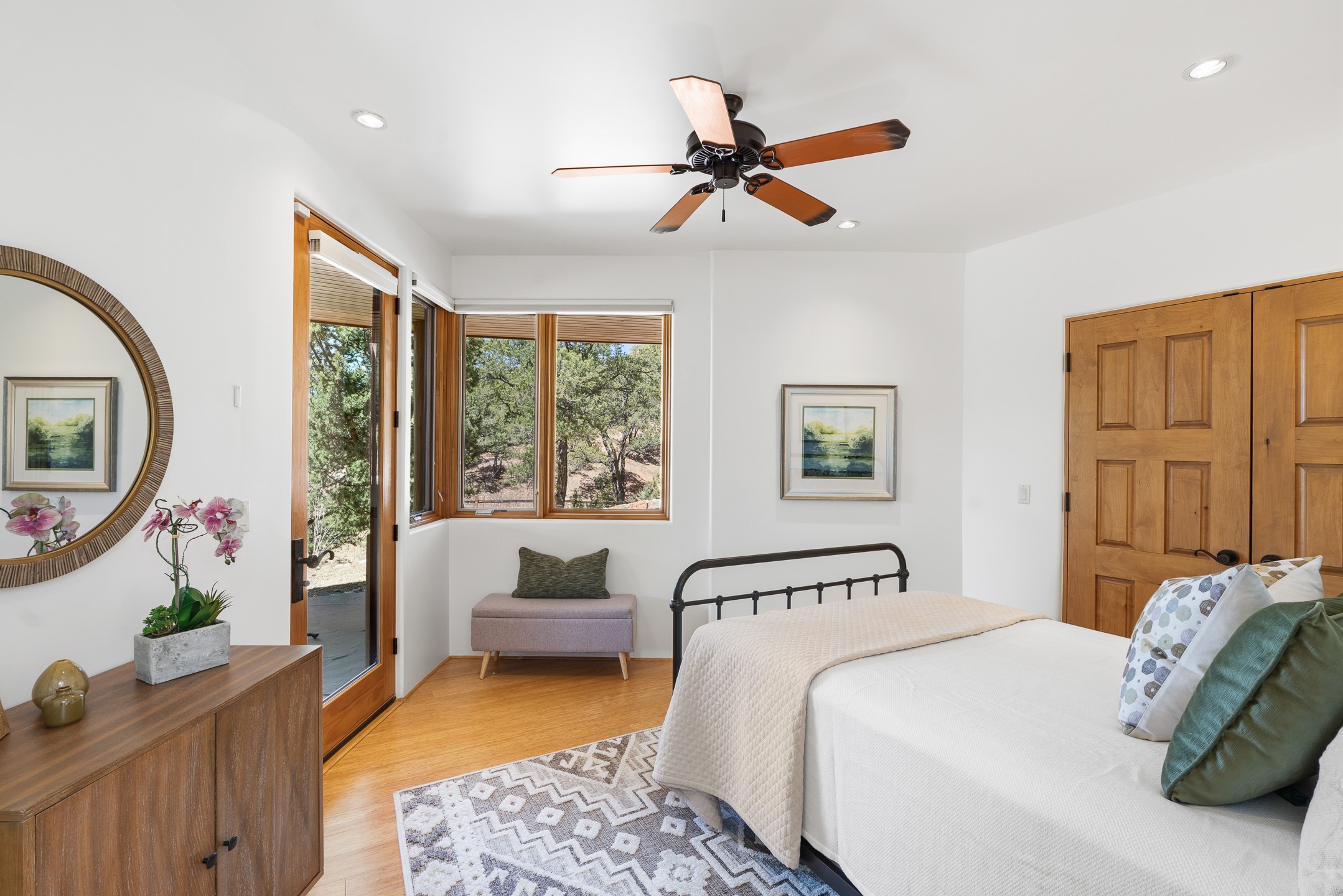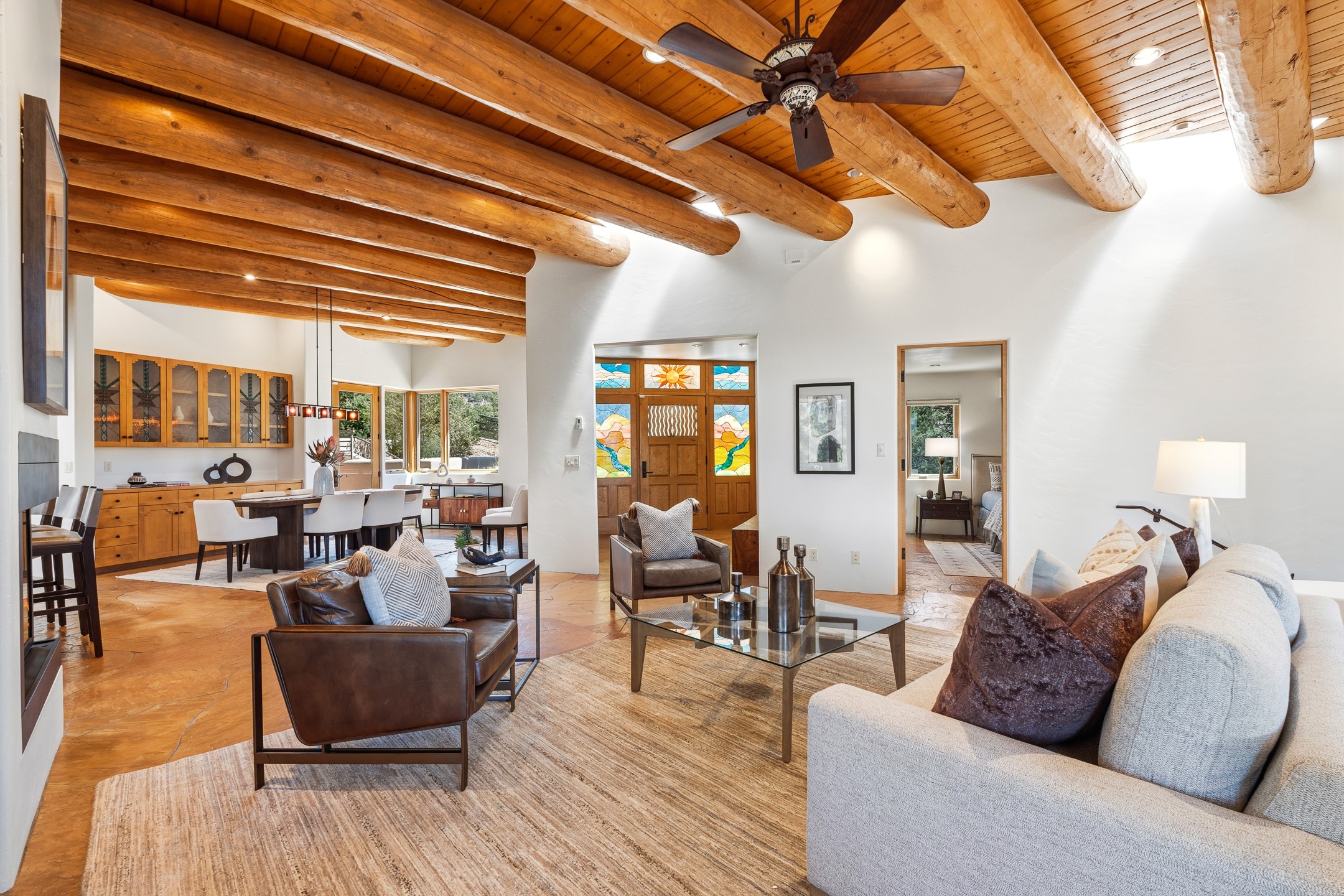 A Private Retreat nestled in the PinonsJust 20 minutes from downtown Santa Fe, this serene 5.8-acre property offers a rare sense of peace and seclusion. Nestled among mature pion trees along the coveted Old Santa Fe Trail, this 2,676 sq ft home provides a true escape from the everyday.Built by Bob DiJanni in 2011, the flexible floor plan features 3 bedrooms and 2 baths, thoughtfully designed for comfort and privacy. The main living area is filled with natural light from expansive windows, anchored by a gas fireplace and complemented by a freshly updated kitchen and dining space with new granite countertops, stylish lighting, a Wolf range, and Sub-Zero refrigerator.The primary suite is privately situated apart from the guest rooms, offering its own access to a covered portal, gas fireplace, spacious walk-in closet with an attached safe, and a spa-like bath with soaking tub, separate shower, and large windows framing tranquil views. Two additional bedrooms are well-separated for guests or family.A bright attached studio with private entry and kiva fireplace creates an ideal space for work, art, or reflection. Outdoor living is equally inviting, with a large covered portal featuring a wood-burning fireplace and and Endless Pool with insulated cover heated by solar panels on the roof.--perfect for relaxation or exercise year-round.Recent upgrades include solar thermal hot water panels supporting domestic use and radiant in-floor heating, water filtration systems, and four mini-split units with capacity for expansion. The land has been carefully maintained with tree trimming and underbrush clearing for fire mitigation.With a shared well and thoughtful improvements throughout, this property offers a harmonious blend of comfort, efficiency, and natural beauty--an ideal sanctuary to call home.