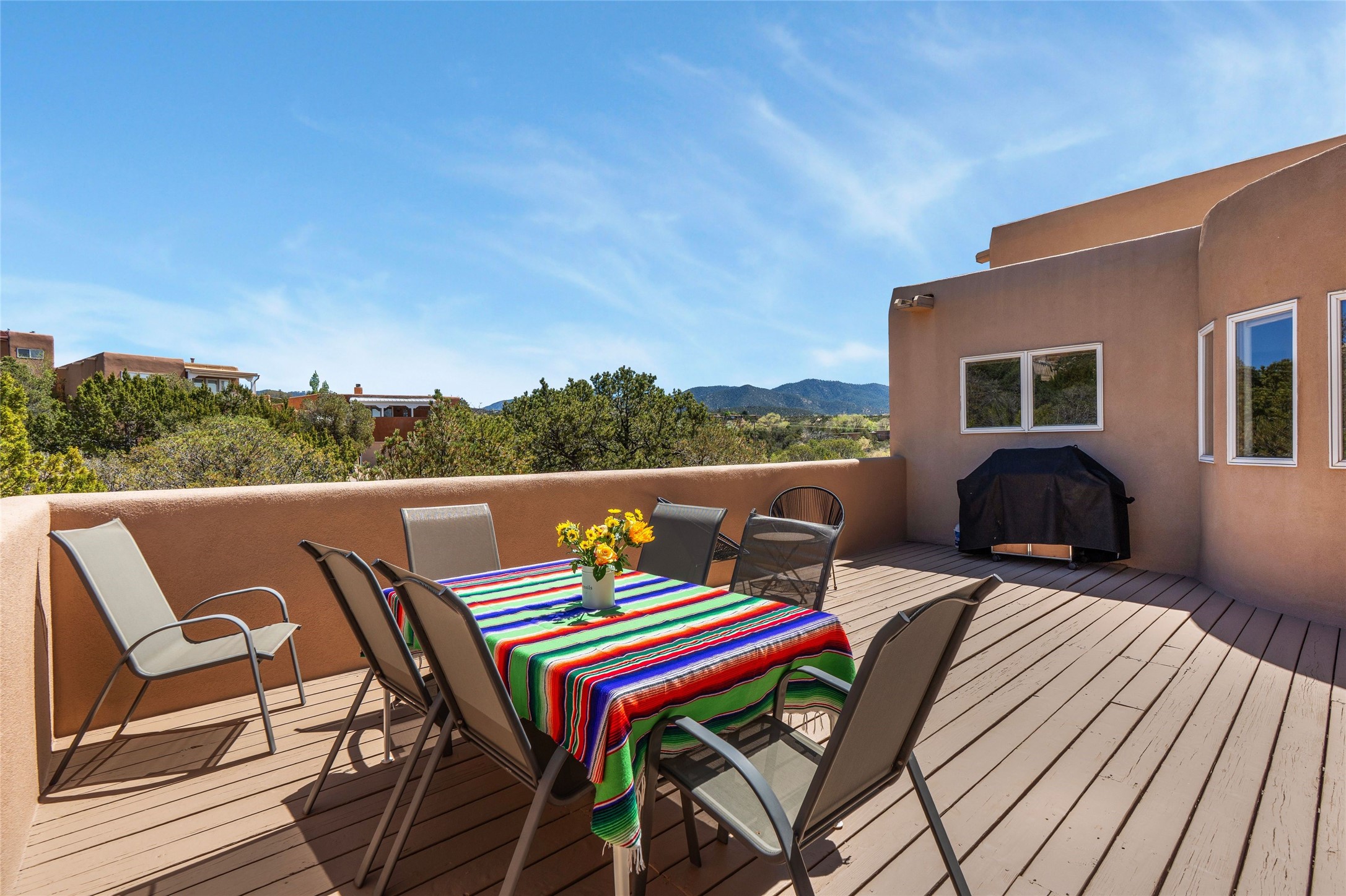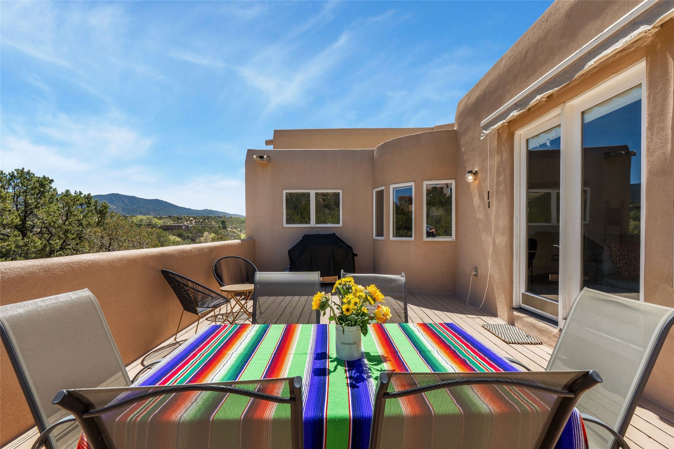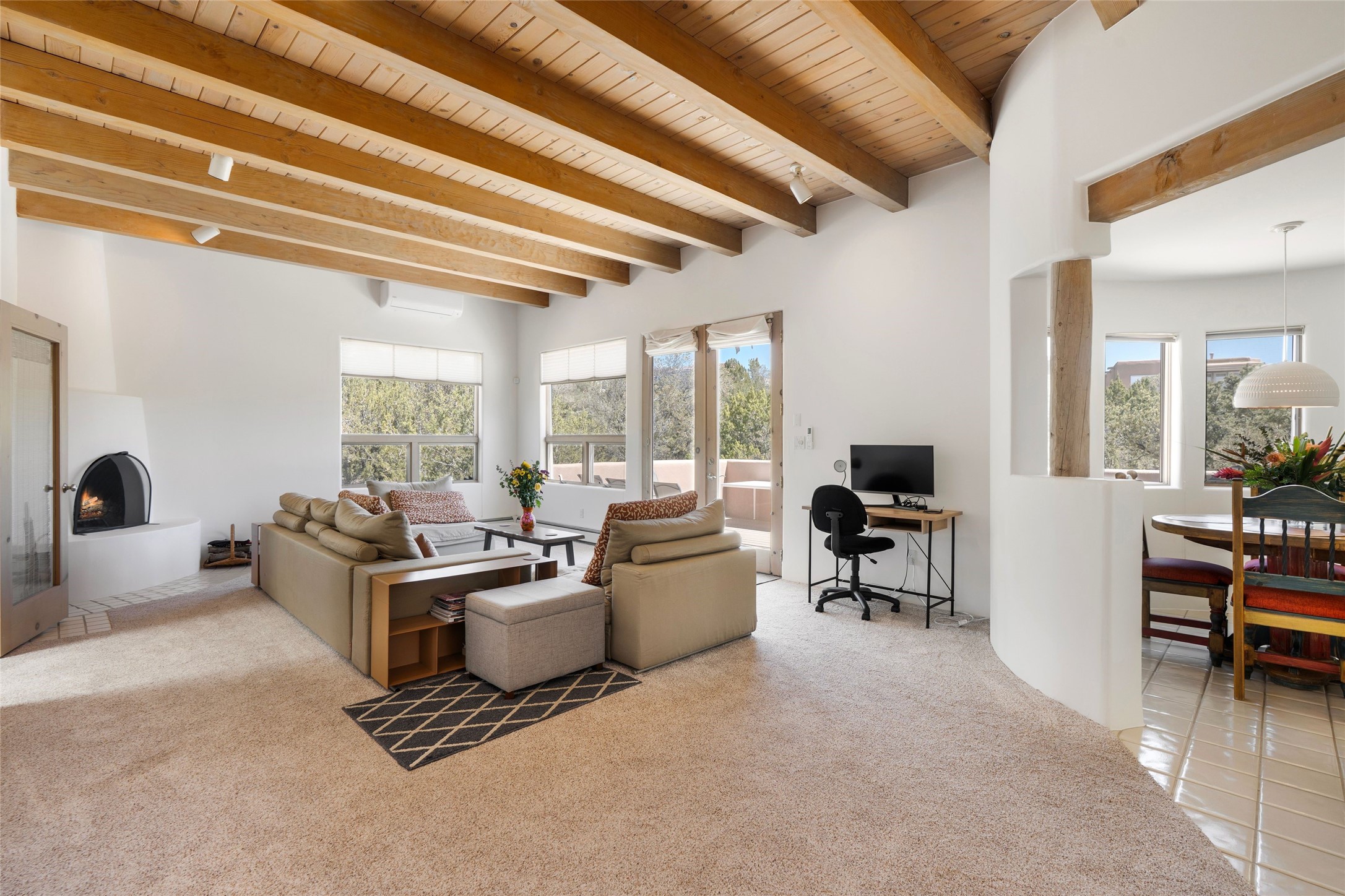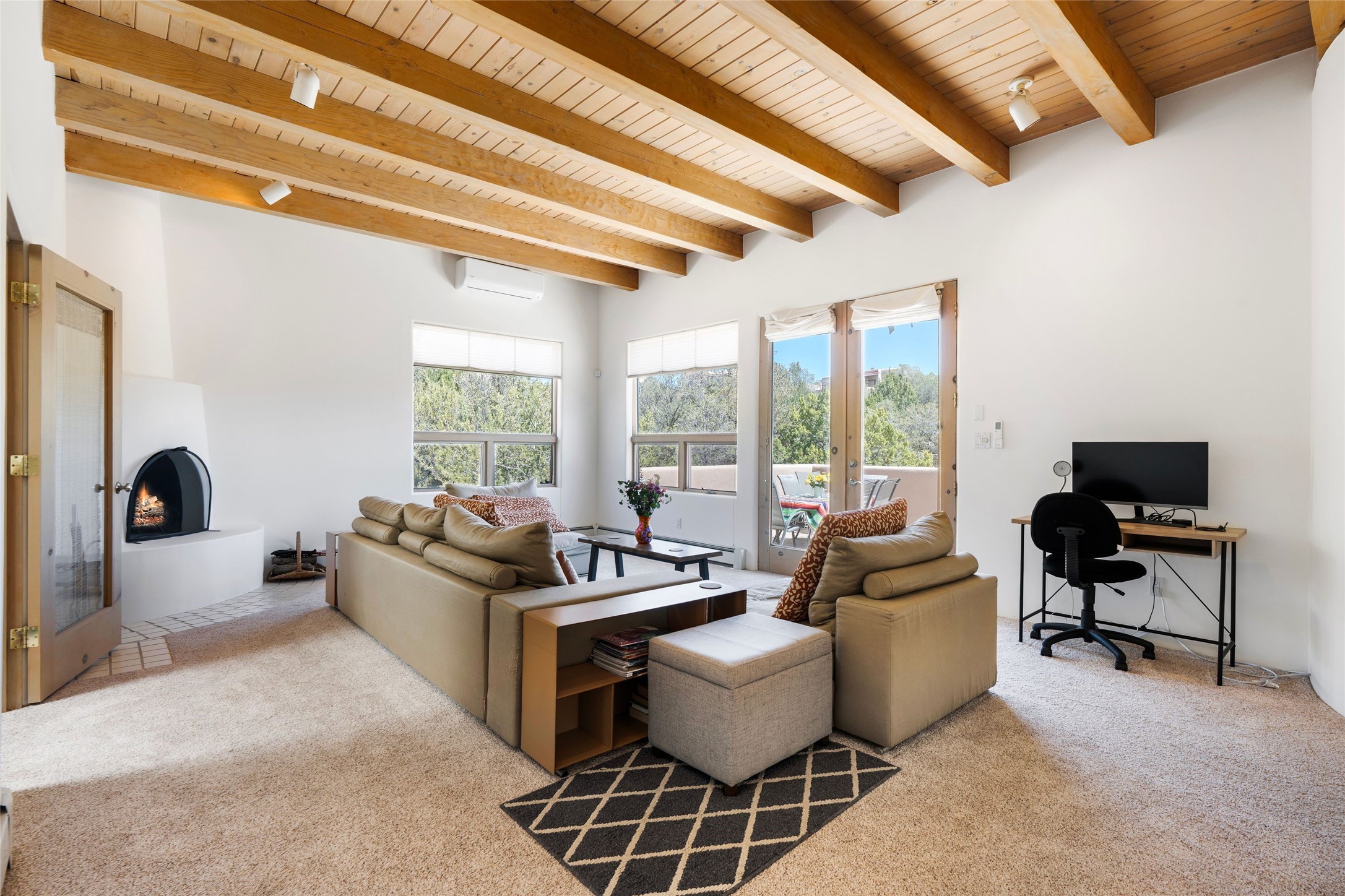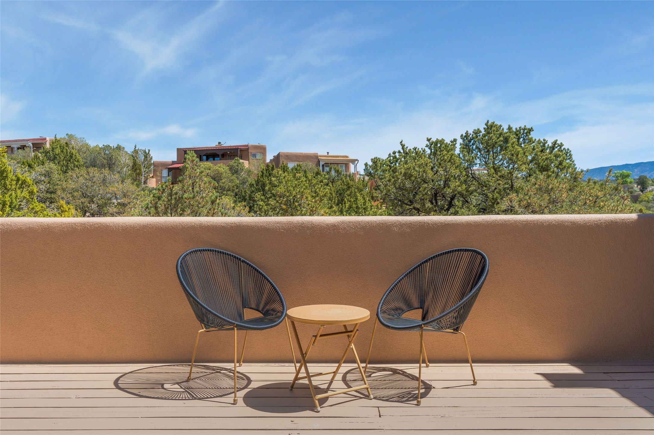 Just moments from the historic Santa Fe Plaza and a short stroll to the new Fort Marcy pickleball courts, this warm and light-filled residence blends classic Santa Fe character with modern comfort. High ceilings with exposed beams, abundant natural light, and two traditional kiva wood-burning fireplaces create an atmosphere that feels both timeless and welcoming. The home features 2 bedrooms, 2 baths, and an additional den--perfect as a home office, studio, or easily converted into a third bedroom. The spacious upper-level primary suite is a true retreat, complete with its own private deck overlooking Sun and Moon Mountain. Outdoor living is exceptional here, with two generous decks offering peaceful views of the surrounding hills and mountains. Whether you're enjoying morning coffee or sunset skies, the setting is pure Santa Fe serenity. A rare 2-car garage, newly added air conditioning, and an on-demand hot water heater round out the home's practical upgrades, making it as comfortable as it is charming. The furnishings are also available separately from the real property; making this a turnkey property. This is a special opportunity to live in one of Santa Fe's most desirable walkable locations--close to culture, recreation, and the natural beauty that defines the City Different.