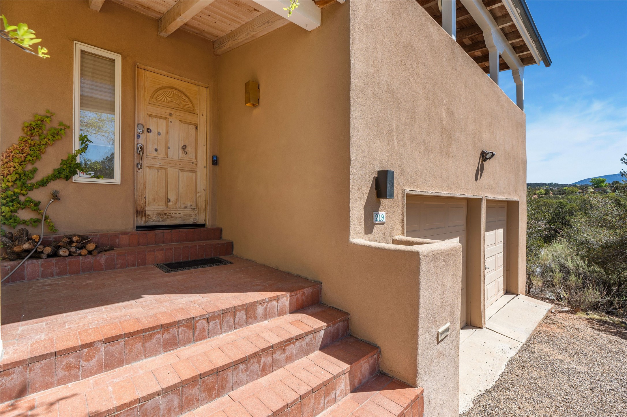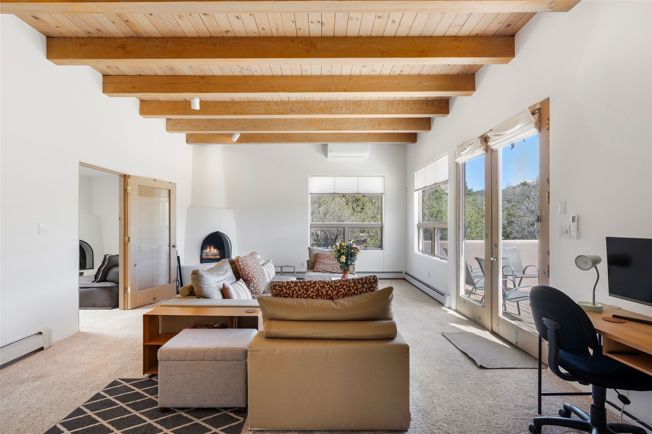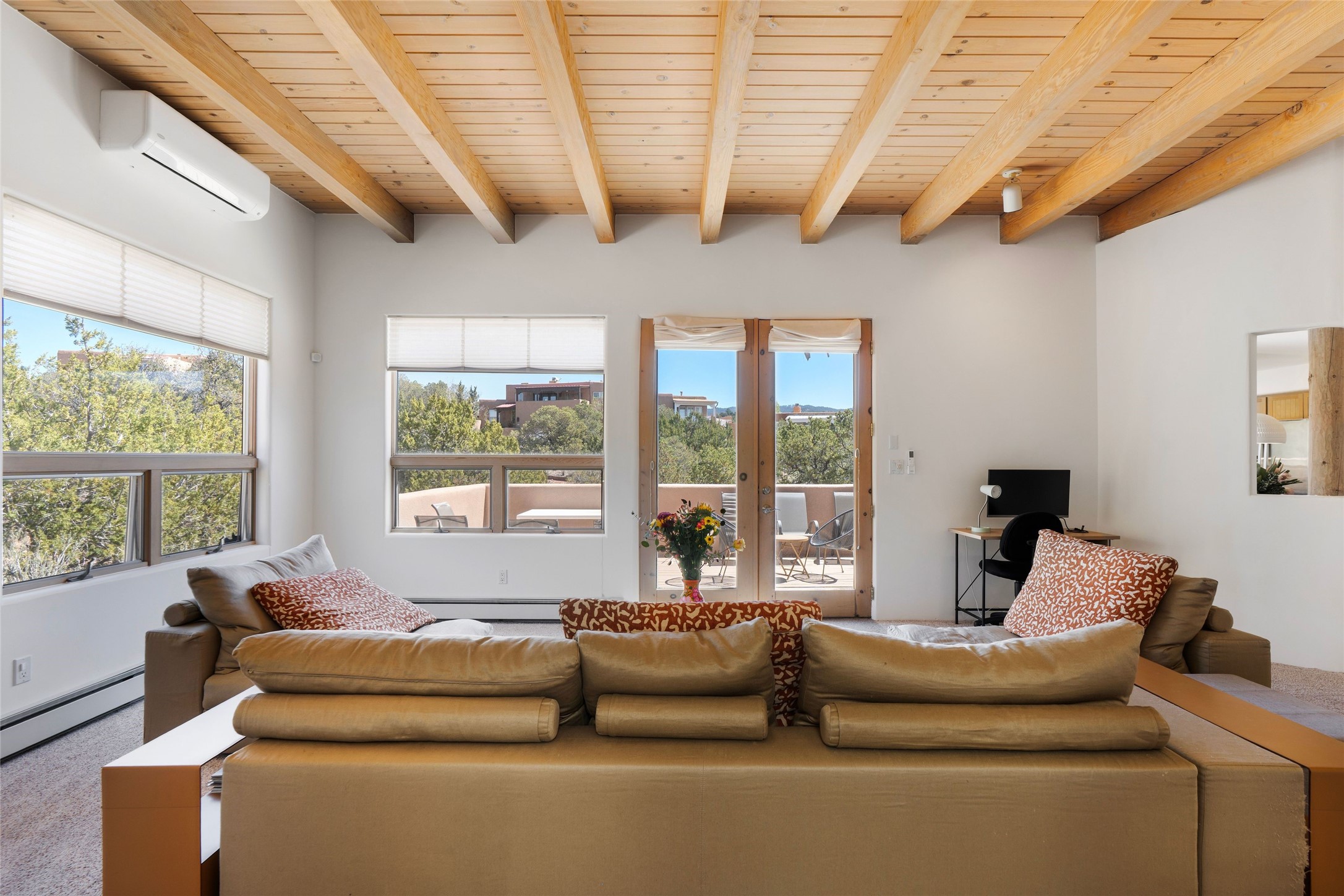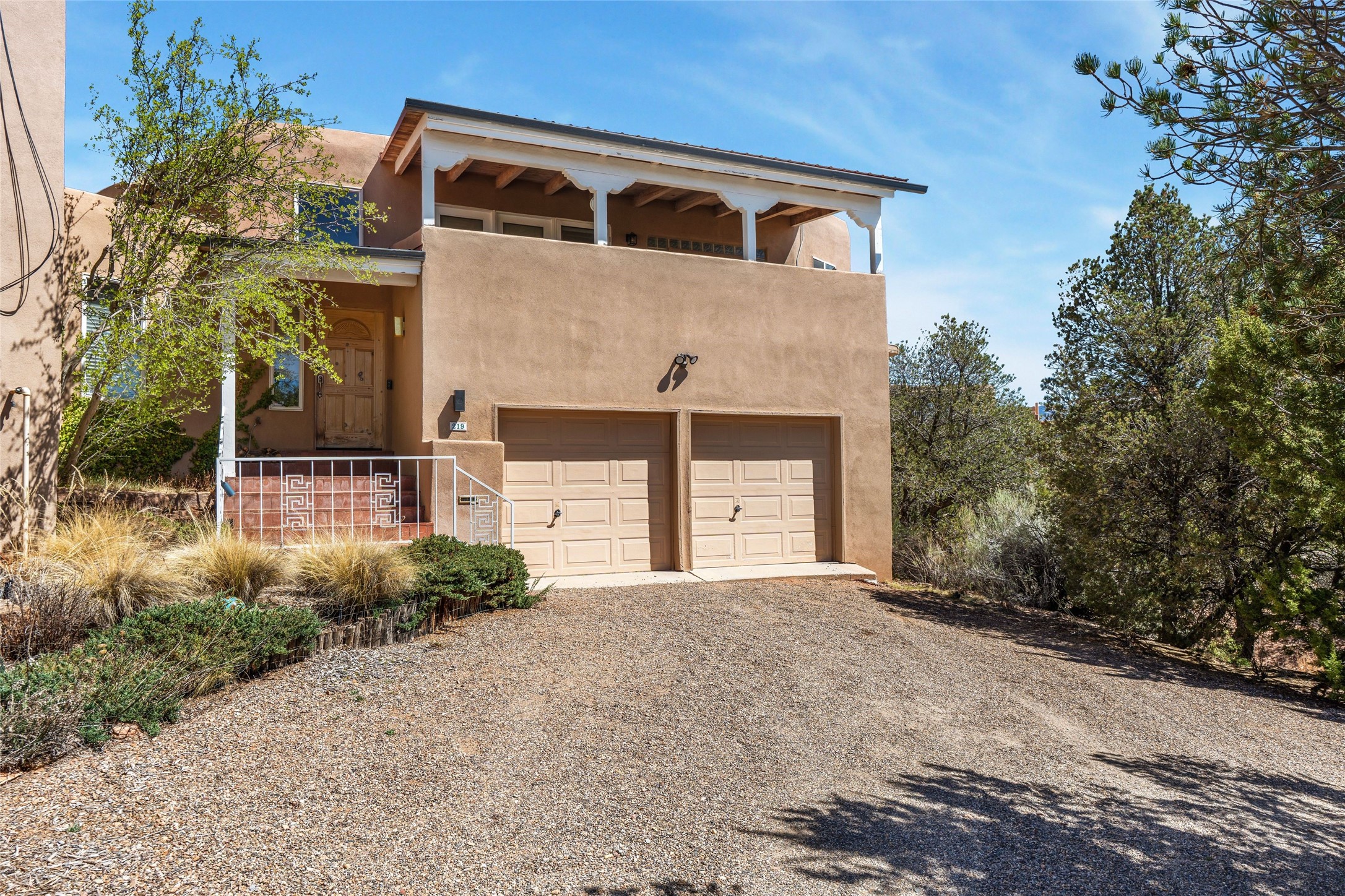 Just moments from the historic Santa Fe Plaza and a short stroll to the new Fort Marcy pickleball courts, this warm and light-filled residence blends classic Santa Fe character with modern comfort. High ceilings with exposed beams, abundant natural light, and two traditional kiva wood-burning fireplaces create an atmosphere that feels both timeless and welcoming. The home features 2 bedrooms, 2 baths, and an additional den--perfect as a home office, studio, or easily converted into a third bedroom. The spacious upper-level primary suite is a true retreat, complete with its own private deck overlooking Sun and Moon Mountain. Outdoor living is exceptional here, with two generous decks offering peaceful views of the surrounding hills and mountains. Whether you're enjoying morning coffee or sunset skies, the setting is pure Santa Fe serenity. A rare 2-car garage, newly added air conditioning, and an on-demand hot water heater round out the home's practical upgrades, making it as comfortable as it is charming. The furnishings are also available separately from the real property; making this a turnkey property. This is a special opportunity to live in one of Santa Fe's most desirable walkable locations--close to culture, recreation, and the natural beauty that defines the City Different.
