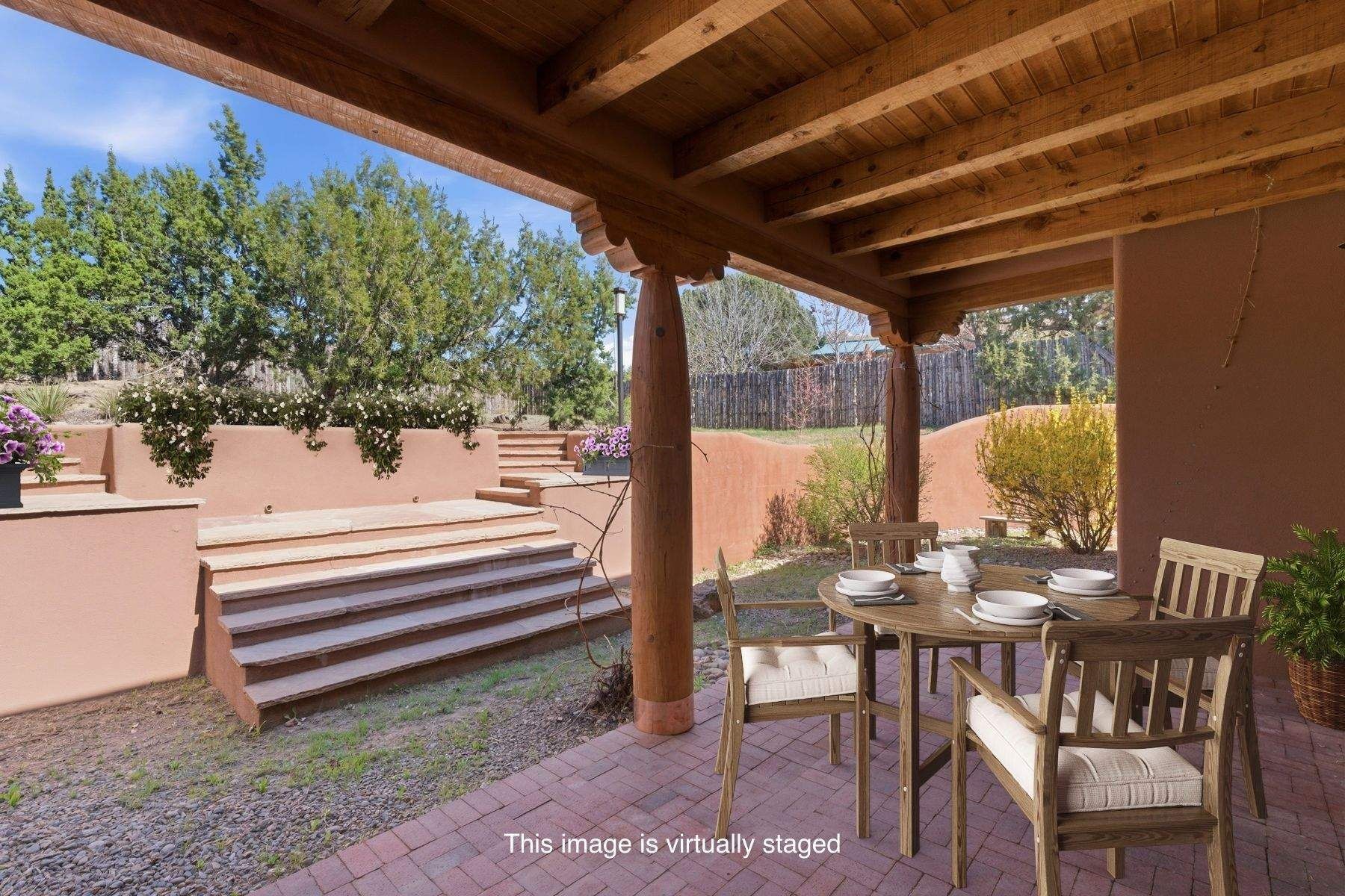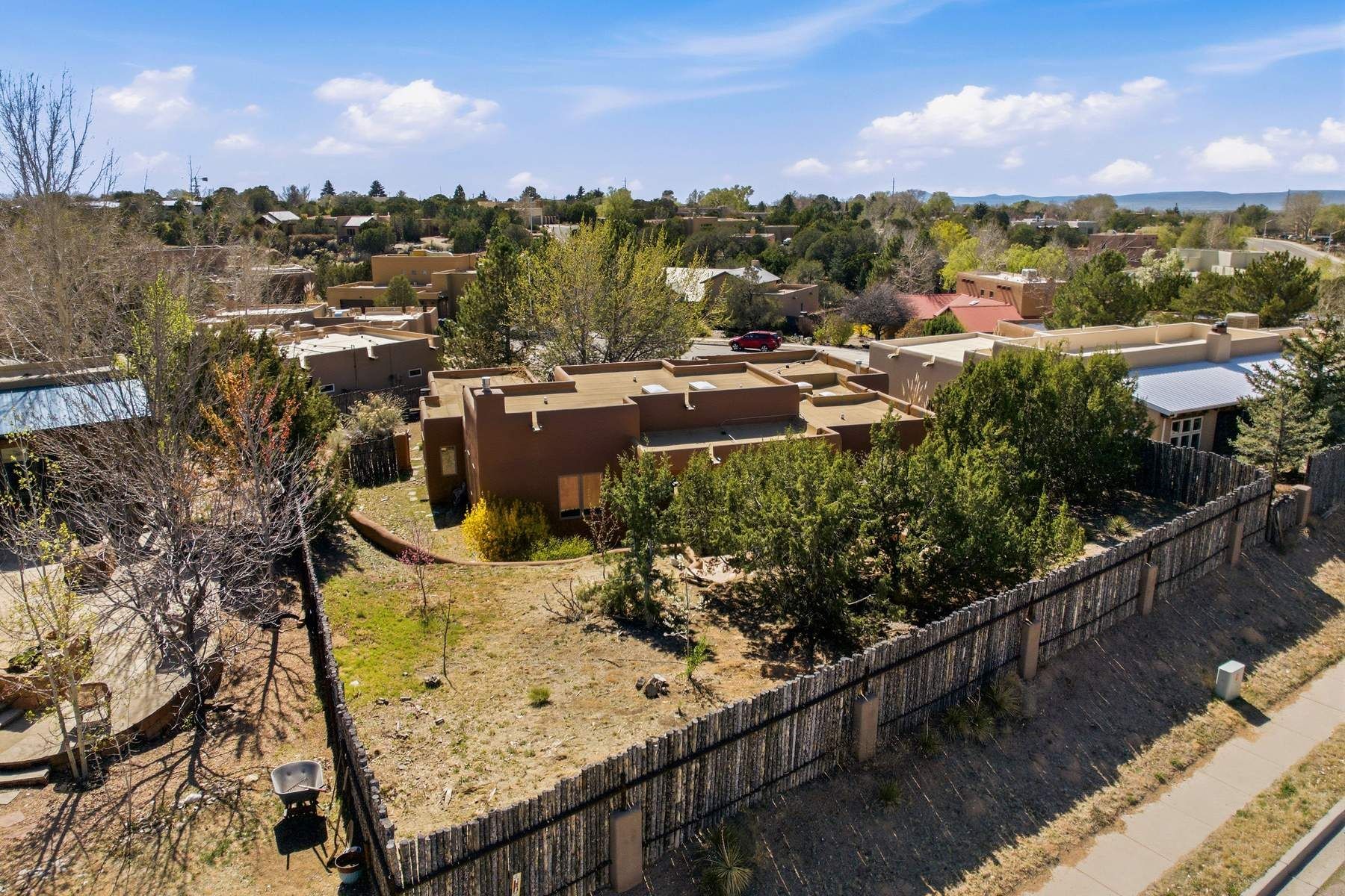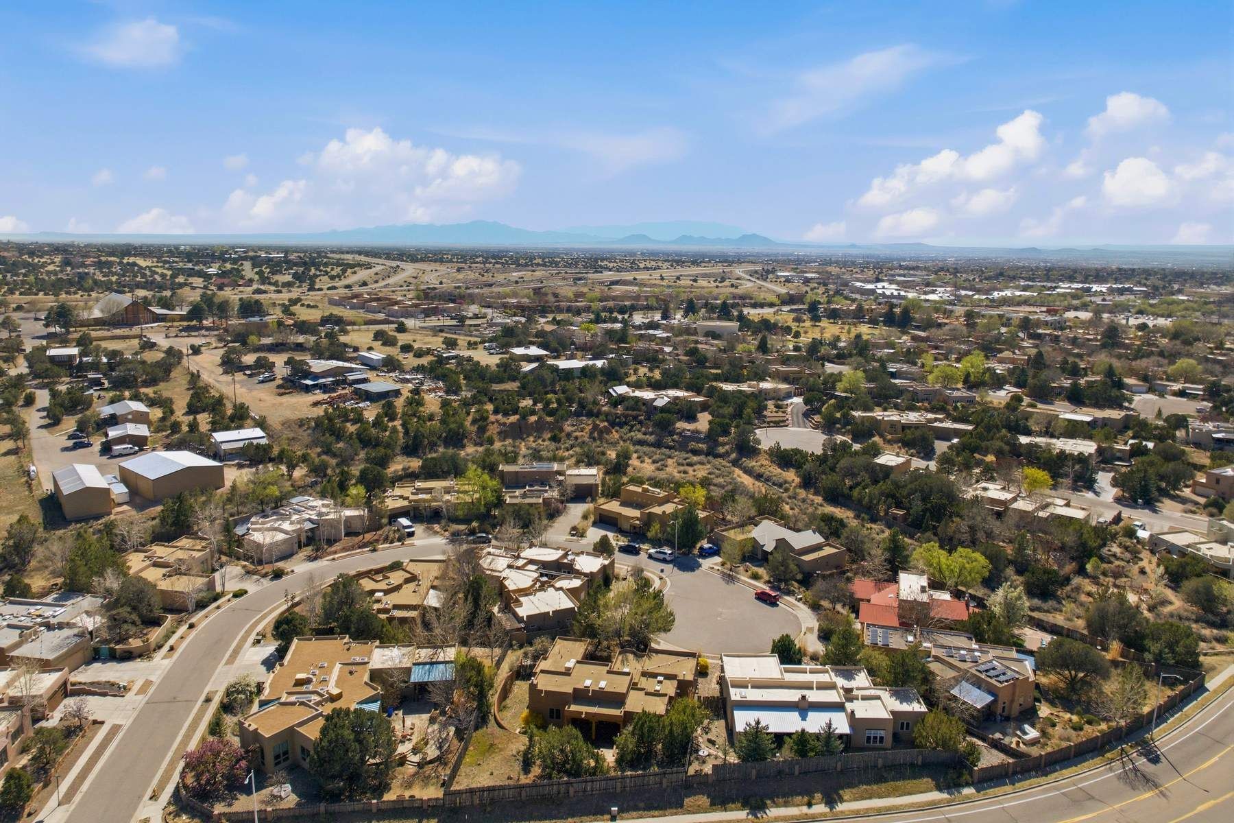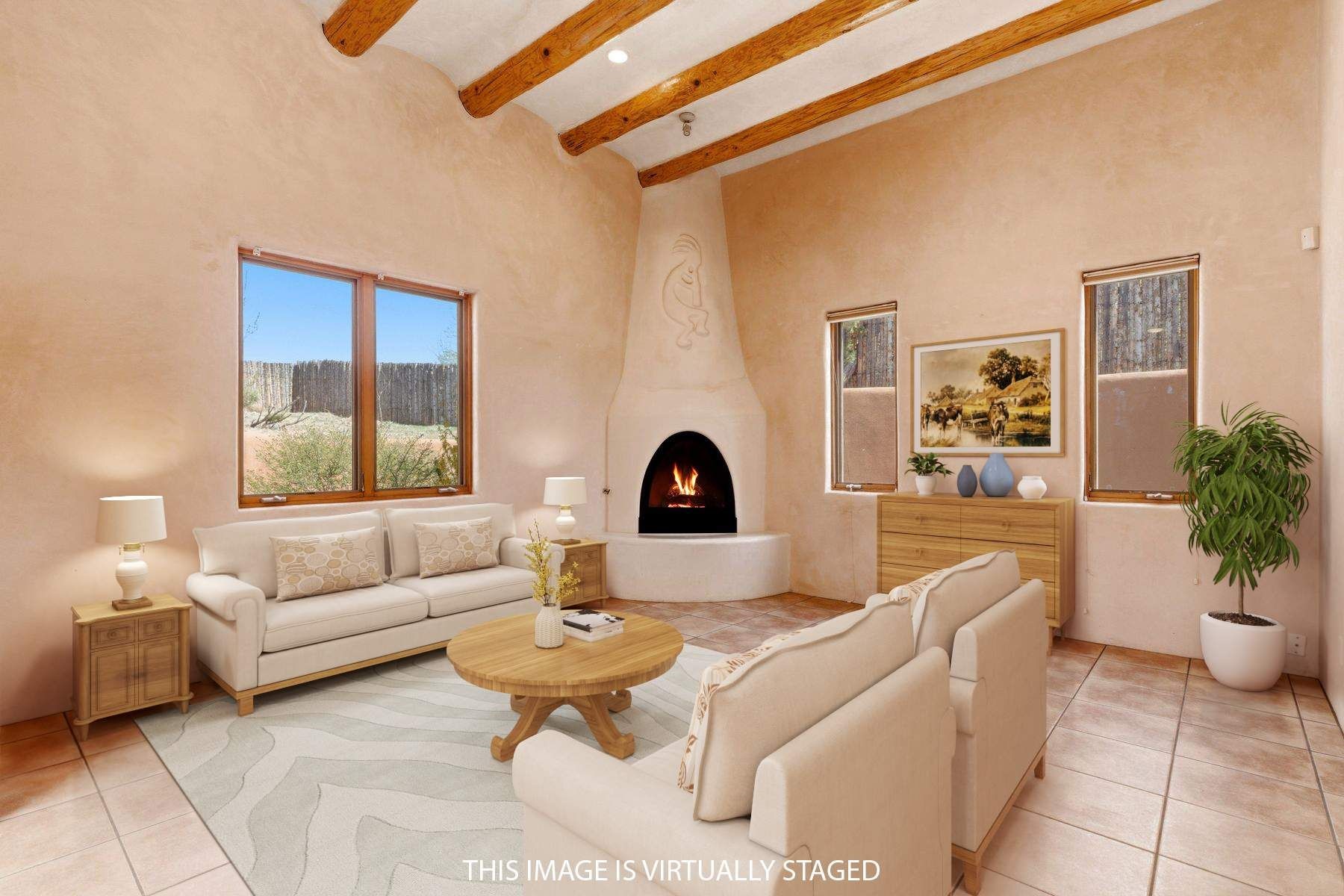On a quiet, convenient in-town cul-de-sac, this light-filled three-bedroom Pueblo-style residence is a delightful oasis close to numerous services and conveniences. Coved ceilings, vigas and beams, decorative corbels, numerous skylights and casement windows, plaster walls, tile floors, serene earthy hues, and a kiva fireplace accented with a whimsical kokopelli contribute to the modern Southwestern ambience. The heart of the home is an expansive open-plan living and dining room with a soaring ceiling, built-in shelves, and double glass doors to the rear portal and patio. Nearby is a bright, cheerful kitchen with a sunny breakfast area that opens through sliding glass doors to an enchanting entry courtyard paved in flagstone. The owner's suite--which opens to the backyard and includes dual closets and a spacious bath with a soaking tub and a shower--is well separated from the two guest bedrooms and their shared bath, creating welcome peace and privacy. One bedroom benefits from a private entrance, making it ideal for use as a home office. In the backyard, an alluring brick portal and multilevel patio encourage outdoor relaxation in the fresh Santa Fe air, with traditional coyote fencing providing welcome seclusion. Hunter Douglas blinds, a security system, in-floor radiant heating, evaporative cooling, a large laundry room with a sink and storage, and an insulated two-car garage are among the contemporary amenities.