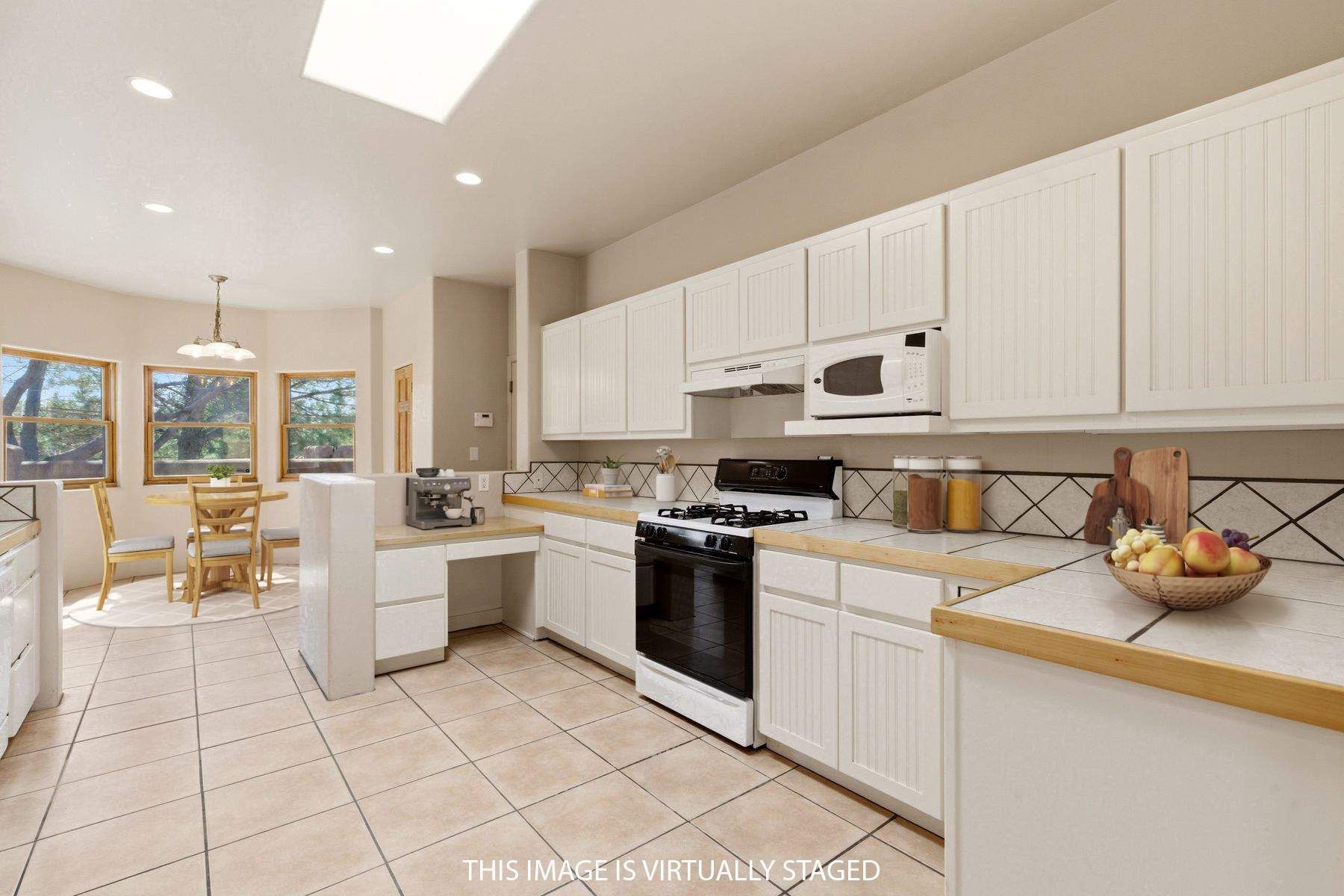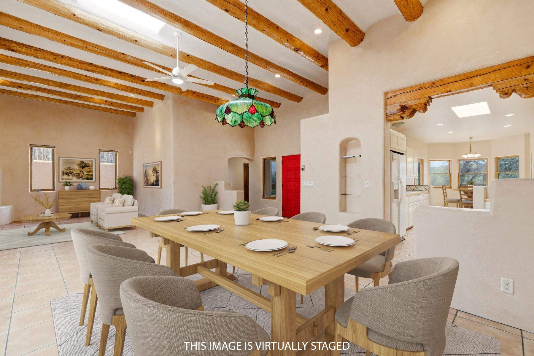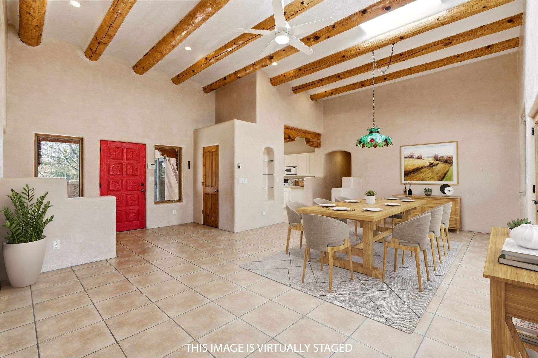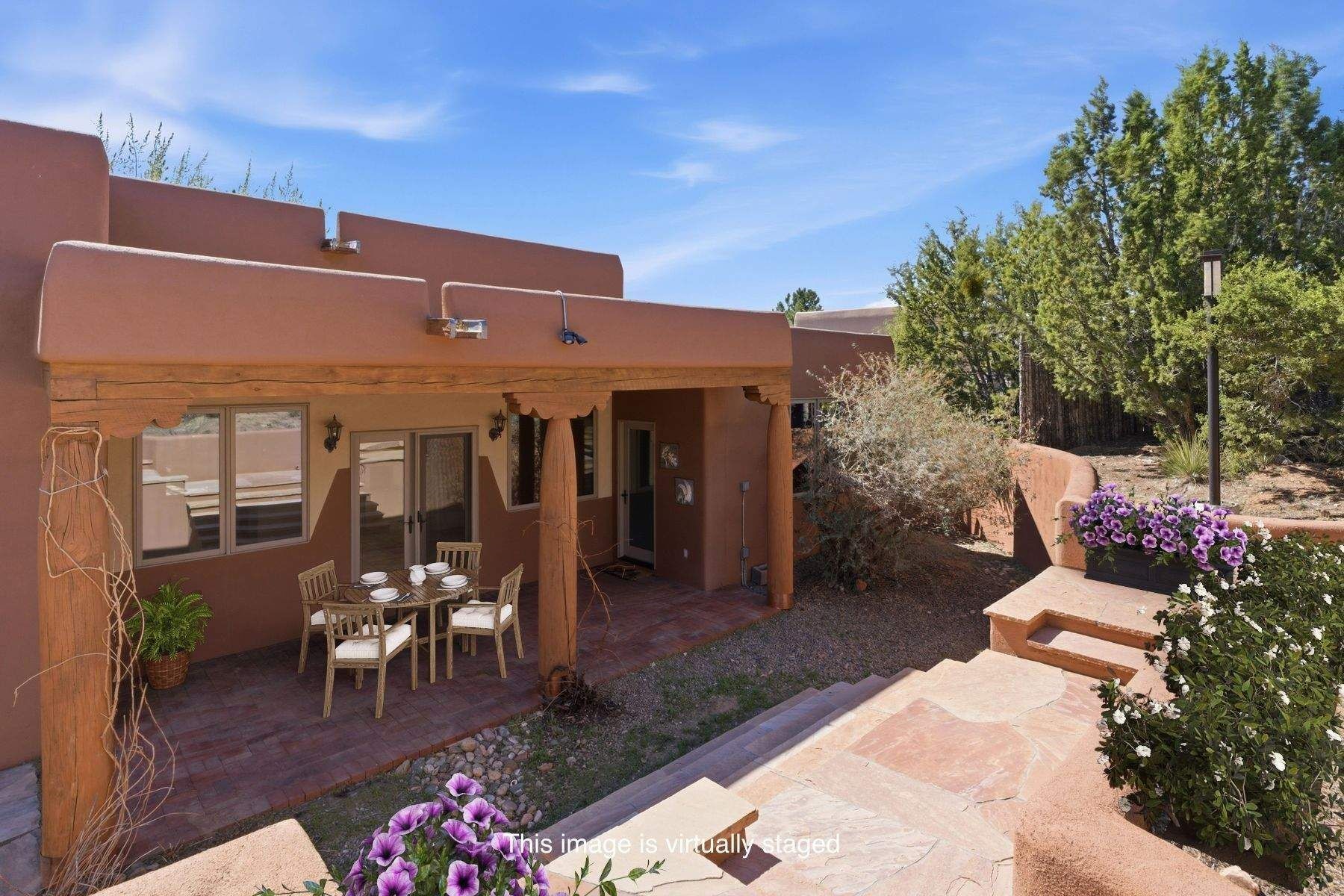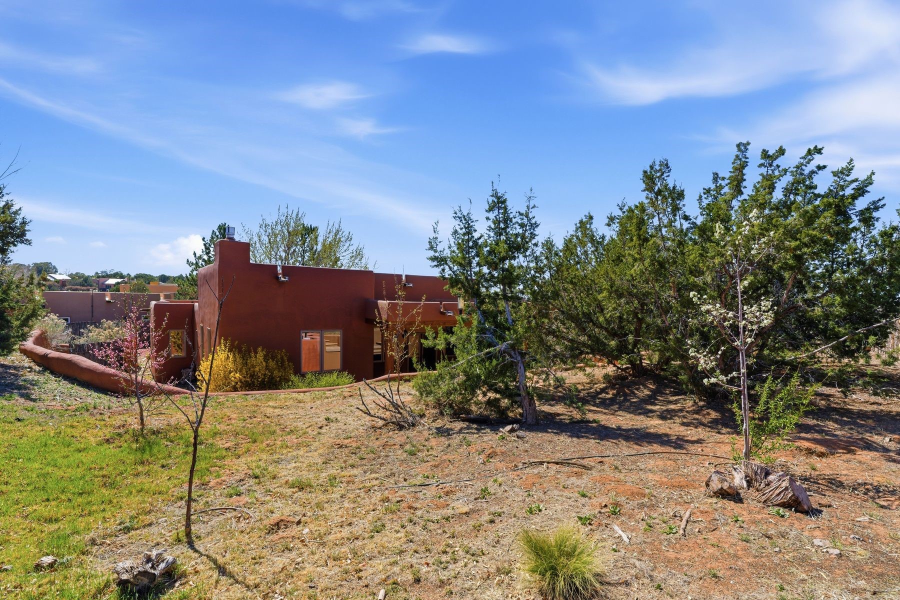 On a quiet, convenient in-town cul-de-sac, this light-filled three-bedroom Pueblo-style residence is a delightful oasis close to numerous services and conveniences. Coved ceilings, vigas and beams, decorative corbels, numerous skylights and casement windows, plaster walls, tile floors, serene earthy hues, and a kiva fireplace accented with a whimsical kokopelli contribute to the modern Southwestern ambience. The heart of the home is an expansive open-plan living and dining room with a soaring ceiling, built-in shelves, and double glass doors to the rear portal and patio. Nearby is a bright, cheerful kitchen with a sunny breakfast area that opens through sliding glass doors to an enchanting entry courtyard paved in flagstone. The owner's suite--which opens to the backyard and includes dual closets and a spacious bath with a soaking tub and a shower--is well separated from the two guest bedrooms and their shared bath, creating welcome peace and privacy. One bedroom benefits from a private entrance, making it ideal for use as a home office. In the backyard, an alluring brick portal and multilevel patio encourage outdoor relaxation in the fresh Santa Fe air, with traditional coyote fencing providing welcome seclusion. Hunter Douglas blinds, a security system, in-floor radiant heating, evaporative cooling, a large laundry room with a sink and storage, and an insulated two-car garage are among the contemporary amenities.