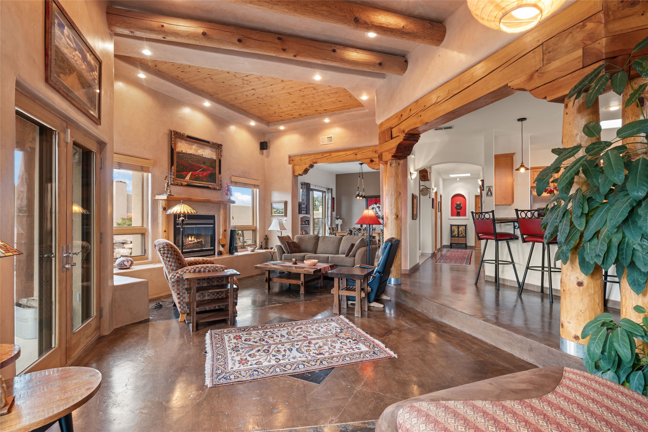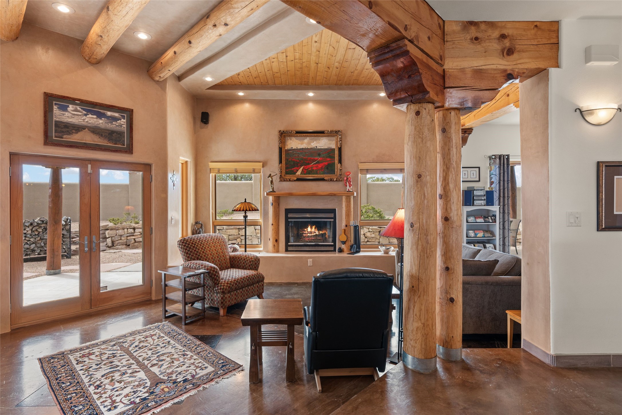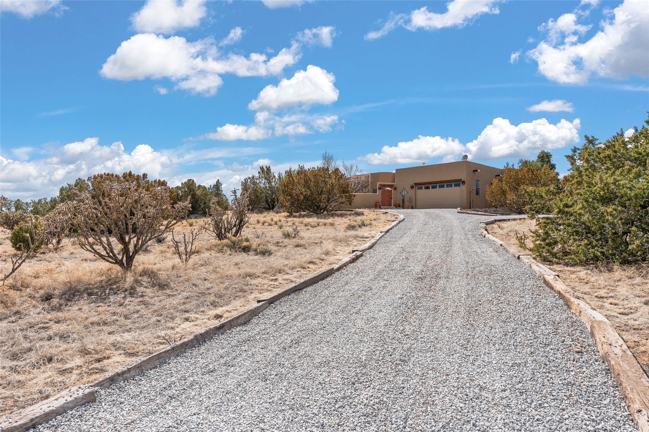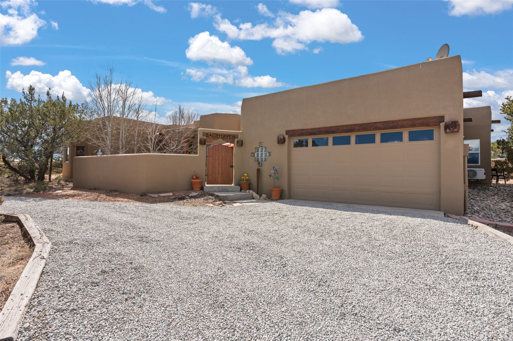 Beautifully maintained and well loved, this 2,460+/- sq ft 3 bedroom home sits on 2.5 acres with great light, gorgeous Sangre de Cristo views and is handy to walking and biking trails which run behind the back patio and go all the way to BLM land. Entering through an enclosed front patio to the entry hall, the house opens to a lovely open main living area with high wood/viga ceilings, wood burning fireplace and access to the private, walled back patio facing South and West for sunny enjoyment even on a cool day. The dining room also opens to a covered back patio for grilling and al fresco dining; and both living areas are open to a most wonderful kitchen. The kitchen has plenty of storage, granite counters, gas stove and a delightful eating nook to enjoy the morning sun and Sangre views. The kitchen also has a fabulous bar/counter area so that the cook can hang with friends and family while preparing a meal - no crowded kitchen here! Perfect bedroom separation with the primary enjoying a fireplace, walk in California closet, access to the walled patio with cool inflatable hot tub and an ensuite bath with jacuzzi tub, nice sized shower and double sinks. The two guest rooms are on the other side of the home, and share a good-sized bath, also with two sinks. Through the laundry room is a bonus room with a new mini split for heating and cooling and a separate entry - this would make a great studio, home office, game room or easy casita conversion as it is stubbed in for kitchenette and or bath. For easy direct access with groceries is a two-car garage, with an attached storage room suitable for storing multiple bikes and outdoor equipment. New stucco in 2023, new roof in 2019 with transferable warranty, and a radon mitigation system in place. There is an entirely new domestic water supply plumbing installed in June of 2025 with five year warranty; along with new 4 ton package for a forced air heating and AC system. A Moen Flo smart water monitoring, leak detection and water shut off system installed also in June of 2025.