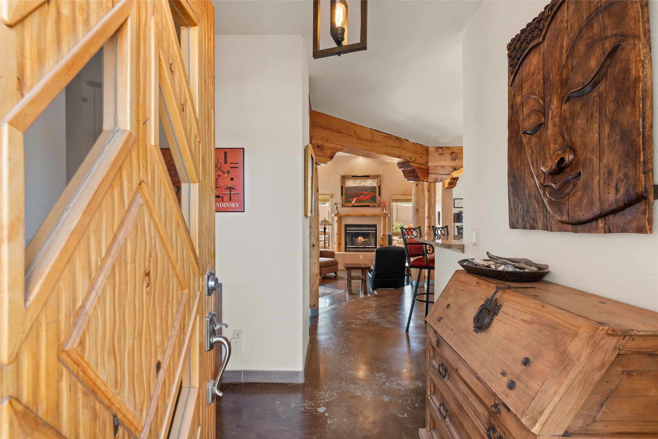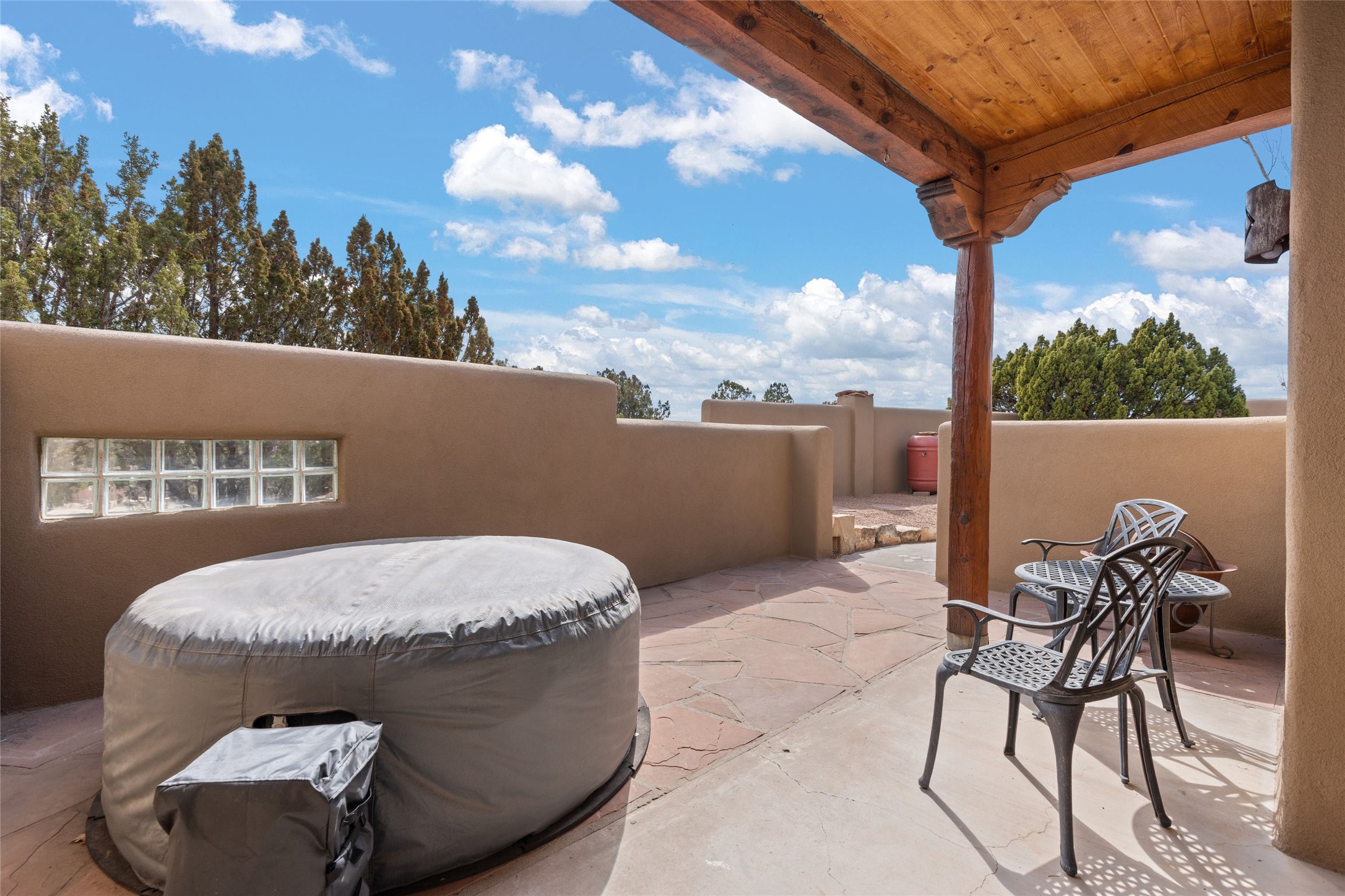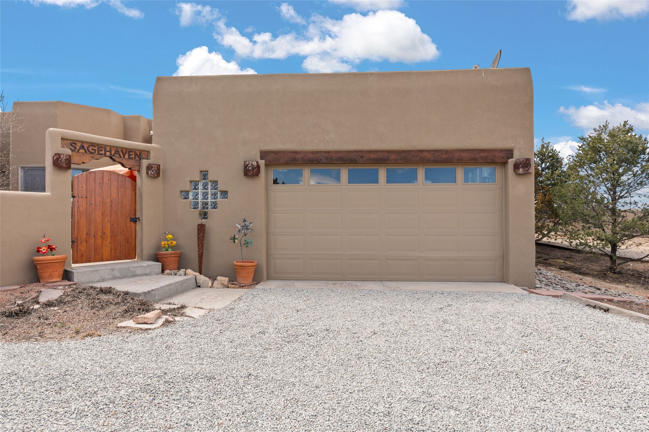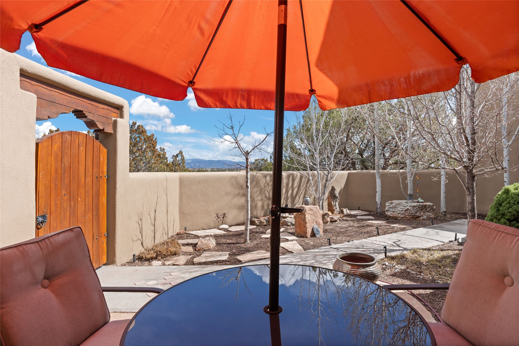 Beautifully maintained and well loved, this 2,460+/- sq ft 3 bedroom home sits on 2.5 acres with great light, gorgeous Sangre de Cristo views and is handy to walking and biking trails which run behind the back patio and go all the way to BLM land. Entering through an enclosed front patio to the entry hall, the house opens to a lovely open main living area with high wood/viga ceilings, wood burning fireplace and access to the private, walled back patio facing South and West for sunny enjoyment even on a cool day. The dining room also opens to a covered back patio for grilling and al fresco dining; and both living areas are open to a most wonderful kitchen. The kitchen has plenty of storage, granite counters, gas stove and a delightful eating nook to enjoy the morning sun and Sangre views. The kitchen also has a fabulous bar/counter area so that the cook can hang with friends and family while preparing a meal - no crowded kitchen here! Perfect bedroom separation with the primary enjoying a fireplace, walk in California closet, access to the walled patio with cool inflatable hot tub and an ensuite bath with jacuzzi tub, nice sized shower and double sinks. The two guest rooms are on the other side of the home, and share a good-sized bath, also with two sinks. Through the laundry room is a bonus room with a new mini split for heating and cooling and a separate entry - this would make a great studio, home office, game room or easy casita conversion as it is stubbed in for kitchenette and or bath. For easy direct access with groceries is a two-car garage, with an attached storage room suitable for storing multiple bikes and outdoor equipment. New stucco in 2023, new roof in 2019 with transferable warranty, and a radon mitigation system in place. There is an entirely new domestic water supply plumbing installed in June of 2025 with five year warranty; along with new 4 ton package for a forced air heating and AC system. A Moen Flo smart water monitoring, leak detection and water shut off system installed also in June of 2025.