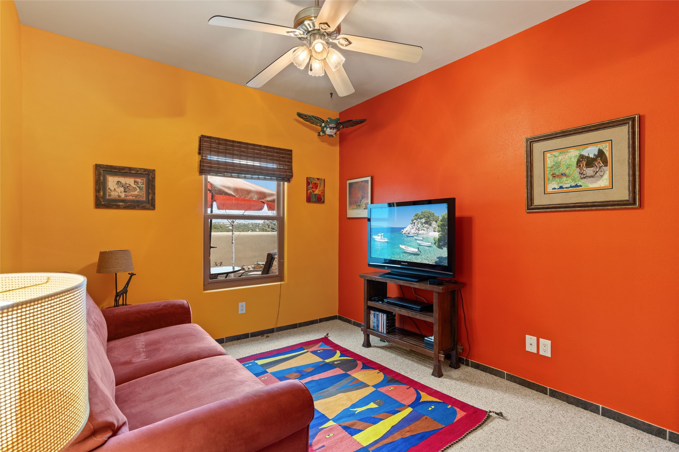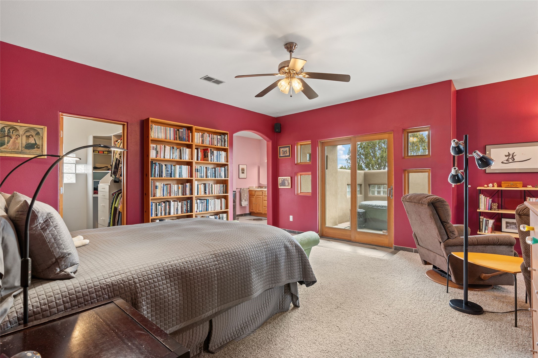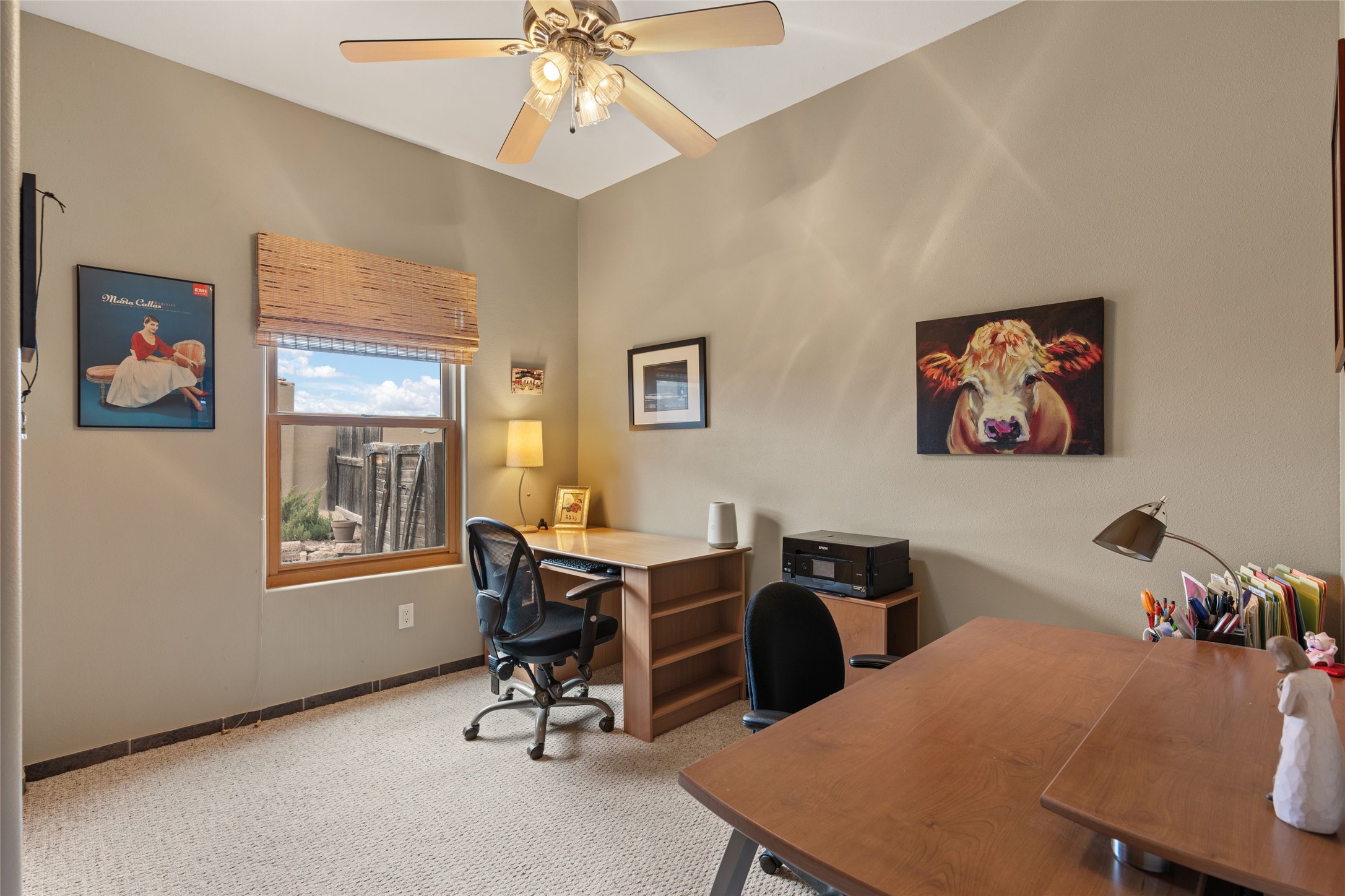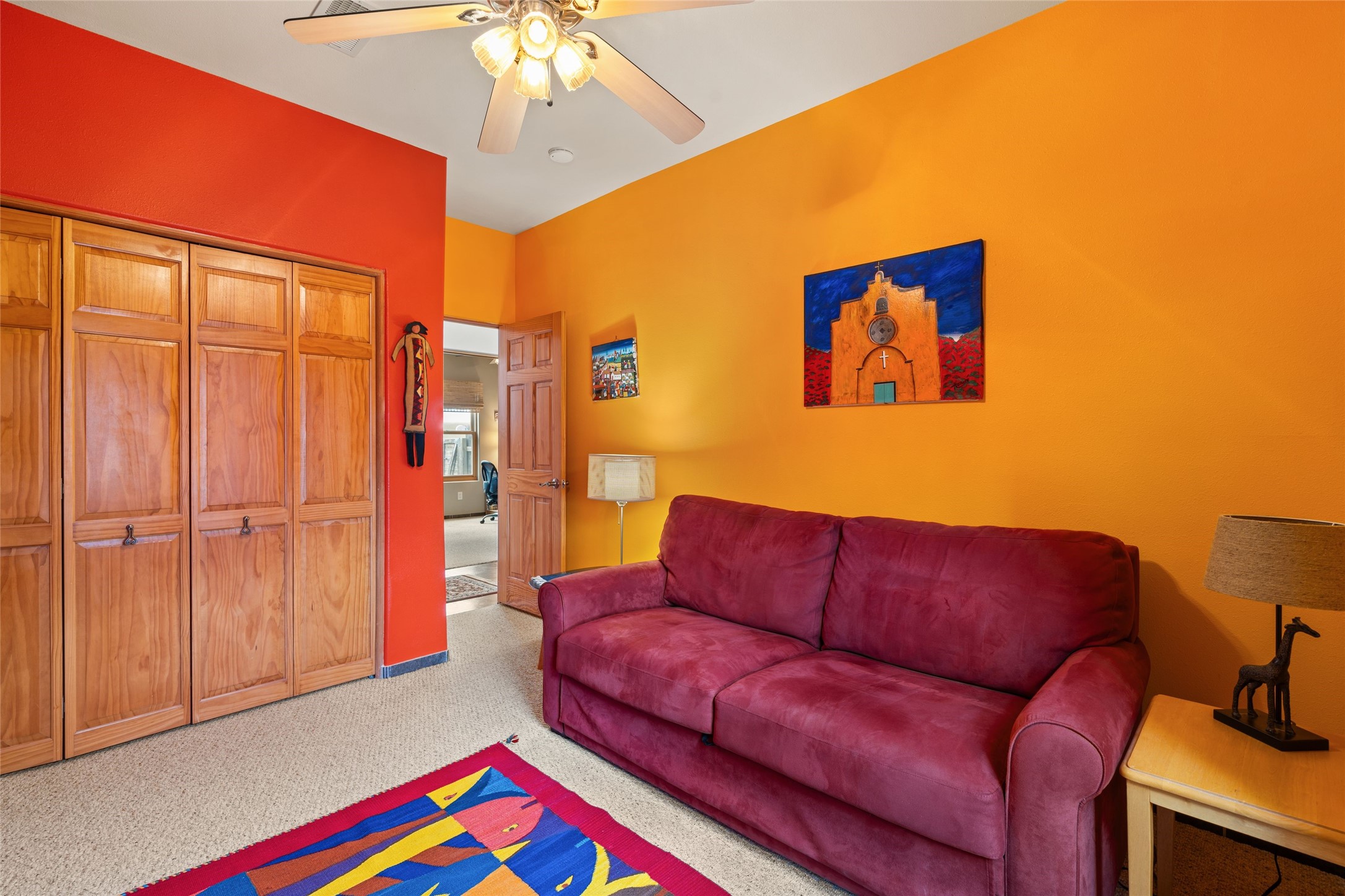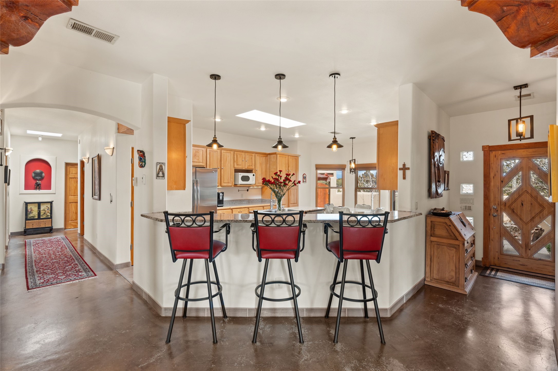 Beautifully maintained and well loved, this 2,460+/- sq ft 3 bedroom home sits on 2.5 acres with great light, gorgeous Sangre de Cristo views and is handy to walking and biking trails which run behind the back patio and go all the way to BLM land. Entering through an enclosed front patio to the entry hall, the house opens to a lovely open main living area with high wood/viga ceilings, wood burning fireplace and access to the private, walled back patio facing South and West for sunny enjoyment even on a cool day. The dining room also opens to a covered back patio for grilling and al fresco dining; and both living areas are open to a most wonderful kitchen. The kitchen has plenty of storage, granite counters, gas stove and a delightful eating nook to enjoy the morning sun and Sangre views. The kitchen also has a fabulous bar/counter area so that the cook can hang with friends and family while preparing a meal - no crowded kitchen here! Perfect bedroom separation with the primary enjoying a fireplace, walk in California closet, access to the walled patio with cool inflatable hot tub and an ensuite bath with jacuzzi tub, nice sized shower and double sinks. The two guest rooms are on the other side of the home, and share a good-sized bath, also with two sinks. Through the laundry room is a bonus room with a new mini split for heating and cooling and a separate entry - this would make a great studio, home office, game room or easy casita conversion as it is stubbed in for kitchenette and or bath. For easy direct access with groceries is a two-car garage, with an attached storage room suitable for storing multiple bikes and outdoor equipment. New stucco in 2023, new roof in 2019 with transferable warranty, and a radon mitigation system in place. There is an entirely new domestic water supply plumbing installed in June of 2025 with five year warranty; along with new 4 ton package for a forced air heating and AC system. A Moen Flo smart water monitoring, leak detection and water shut off system installed also in June of 2025.