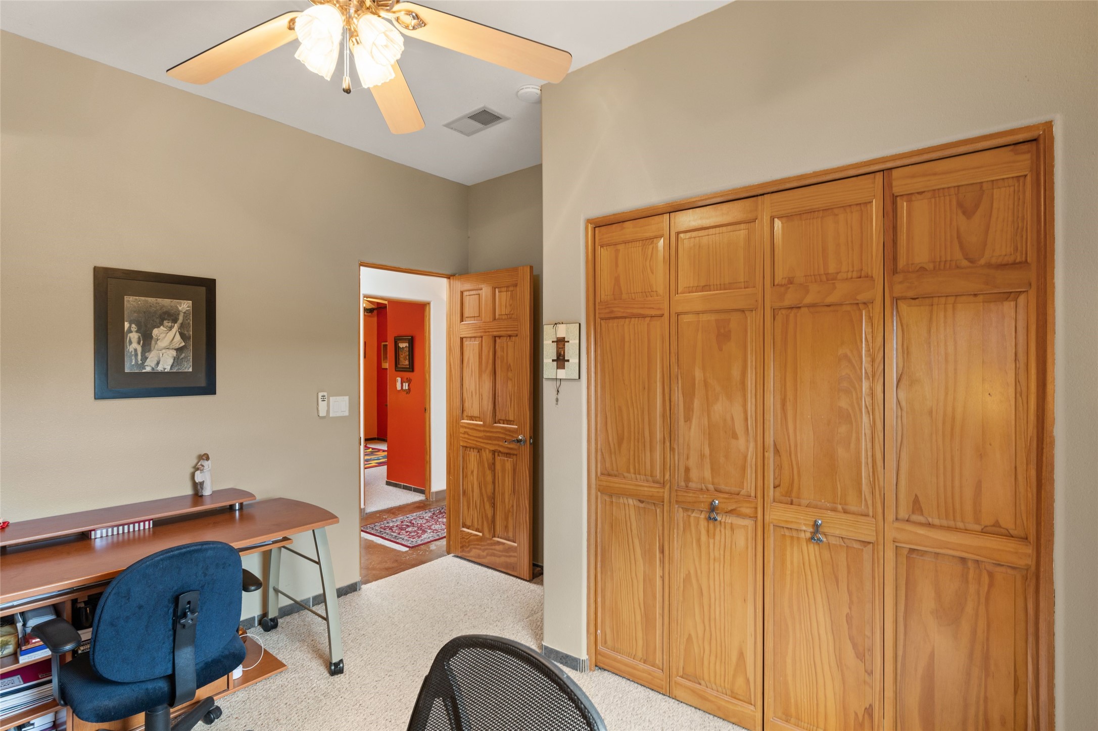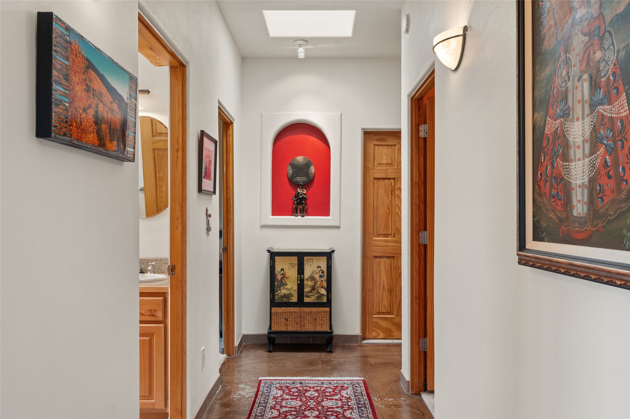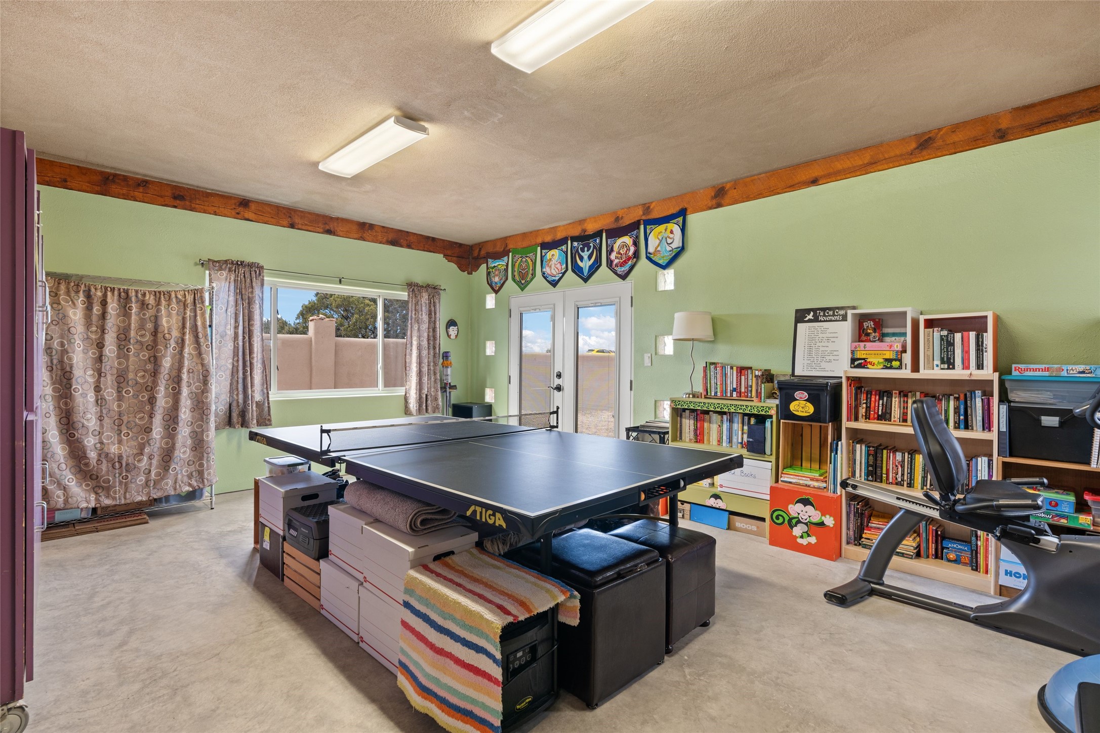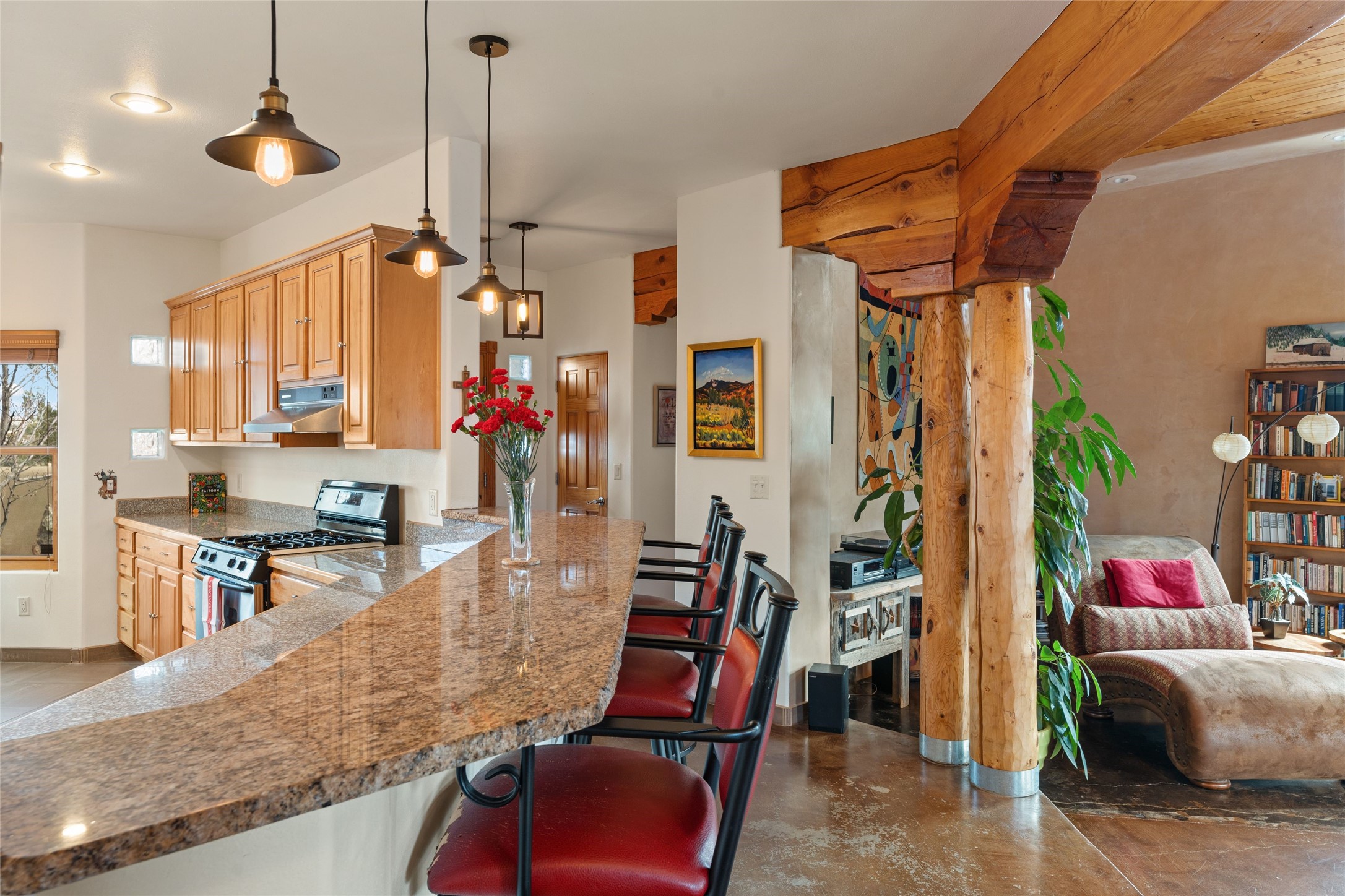 Beautifully maintained and well loved, this 2,460+/- sq ft 3 bedroom home sits on 2.5 acres with great light, gorgeous Sangre de Cristo views and is handy to walking and biking trails which run behind the back patio and go all the way to BLM land. Entering through an enclosed front patio to the entry hall, the house opens to a lovely open main living area with high wood/viga ceilings, wood burning fireplace and access to the private, walled back patio facing South and West for sunny enjoyment even on a cool day. The dining room also opens to a covered back patio for grilling and al fresco dining; and both living areas are open to a most wonderful kitchen. The kitchen has plenty of storage, granite counters, gas stove and a delightful eating nook to enjoy the morning sun and Sangre views. The kitchen also has a fabulous bar/counter area so that the cook can hang with friends and family while preparing a meal - no crowded kitchen here! Perfect bedroom separation with the primary enjoying a fireplace, walk in California closet, access to the walled patio with cool inflatable hot tub and an ensuite bath with jacuzzi tub, nice sized shower and double sinks. The two guest rooms are on the other side of the home, and share a good-sized bath, also with two sinks. Through the laundry room is a bonus room with a new mini split for heating and cooling and a separate entry - this would make a great studio, home office, game room or easy casita conversion as it is stubbed in for kitchenette and or bath. For easy direct access with groceries is a two-car garage, with an attached storage room suitable for storing multiple bikes and outdoor equipment. New stucco in 2023, new roof in 2019 with transferable warranty, and a radon mitigation system in place. There is an entirely new domestic water supply plumbing installed in June of 2025 with five year warranty; along with new 4 ton package for a forced air heating and AC system. A Moen Flo smart water monitoring, leak detection and water shut off system installed also in June of 2025.