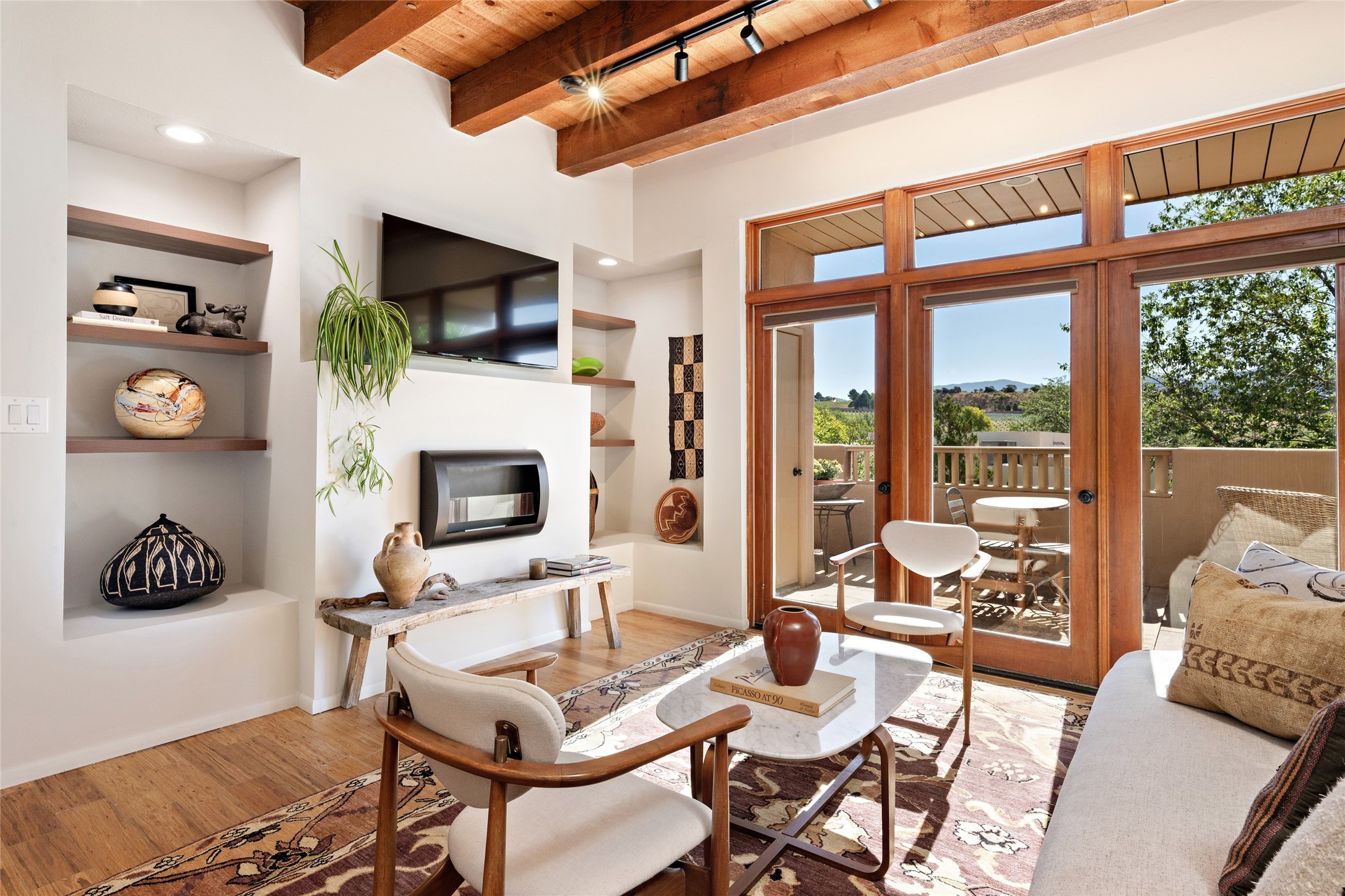 The northwest of Santa Fe within city limits includes one of the most affordable, family areas – Casa Solana. With beautiful mature trees, sidewalks and paved streets, Casa Solana has a real neighborhood atmosphere. Gonzales Elementary is within walking distance to all and the Casa Solana shopping area is a treat. The homes were built in the 1960’s by developer Allen Stamm and all include vigas, hardwood floors, fireplaces and solid construction. As you travel down West Alameda , the homes begin to spread out a bit. Horse farms dot the landscape. Newly-constructed homes appear on large open tracts. Any left hand turn takes you down to the Santa Fe River and any right hand turn delivered you into the hills above Santa Fe. Some lots in the hills offer 360 degree views, some a beautiful view of the Santa Fe city lights. Includes Zocolo and Santa Fe Estates.